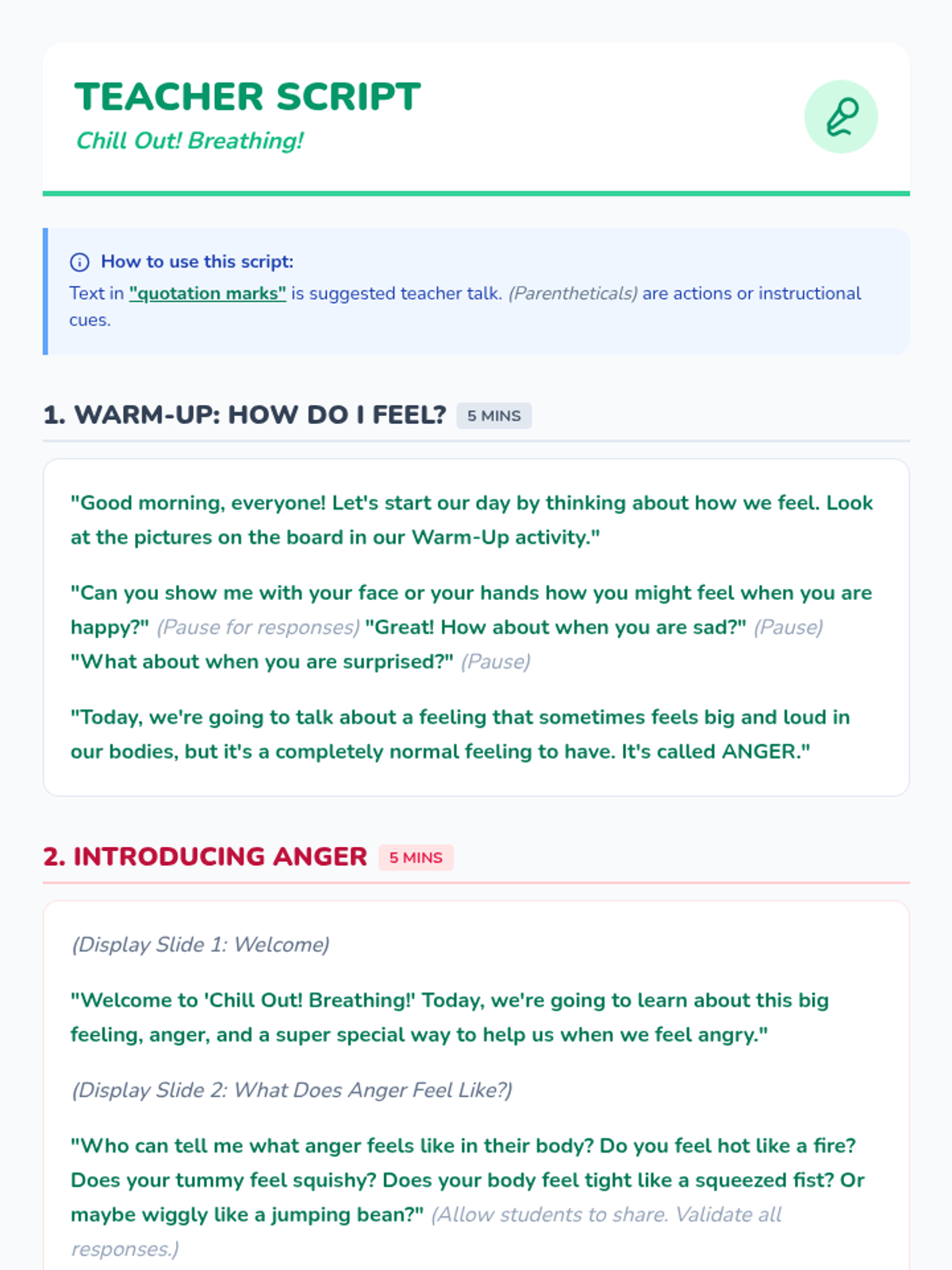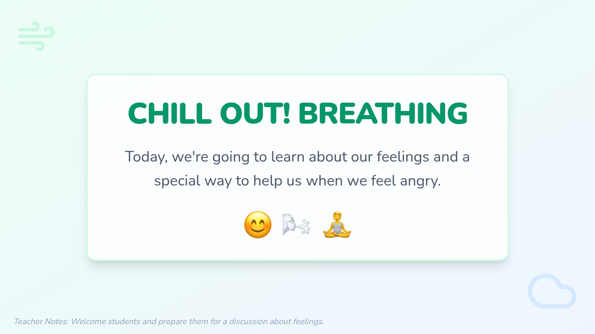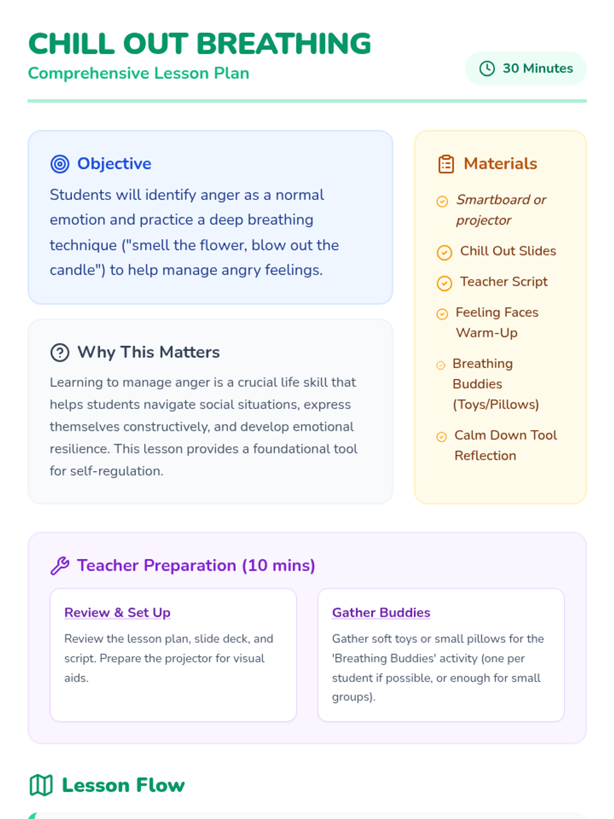 This lesson introduces Kindergarten students to basic anger management strategies, focusing on deep breathing as a tool to calm down. It helps students understand that it's okay to feel angry and provides a simple, actionable technique to manage those feelings in a healthy way.