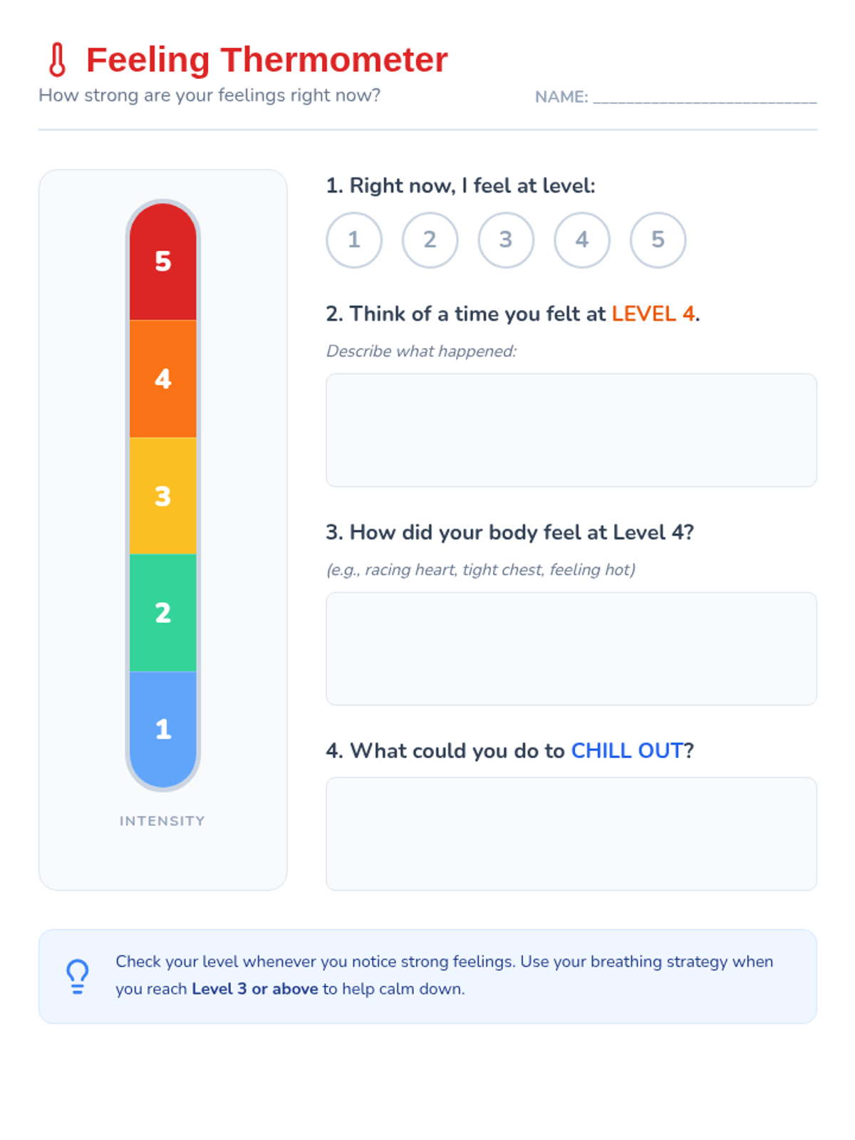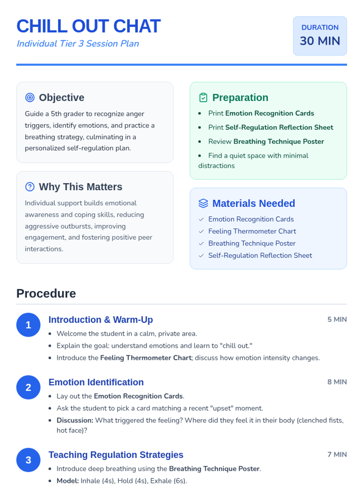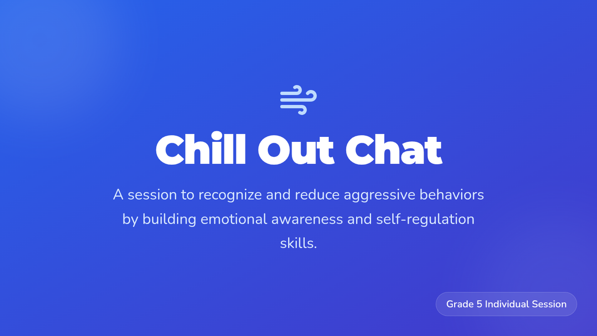 A 30-minute individual Tier 3 session for 5th graders focusing on emotional awareness, recognizing anger triggers, and mastering a deep breathing strategy to de-escalate aggressive behaviors.