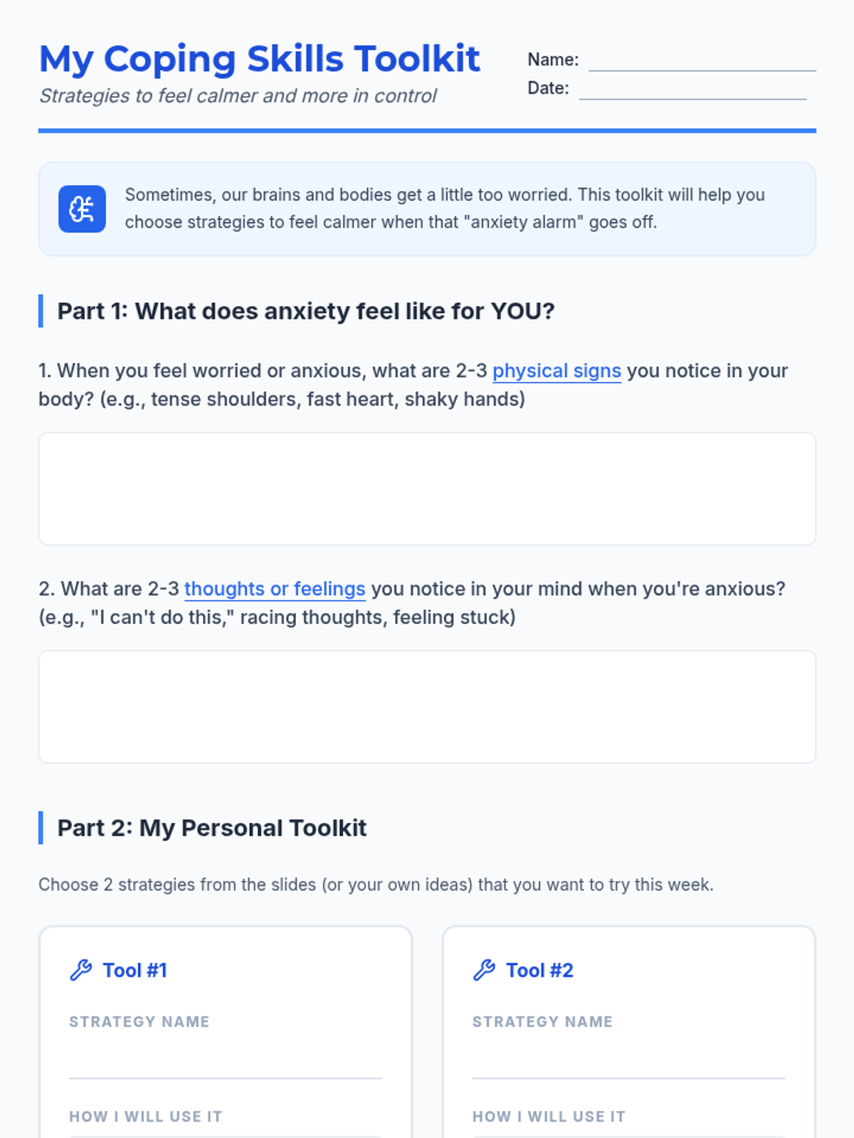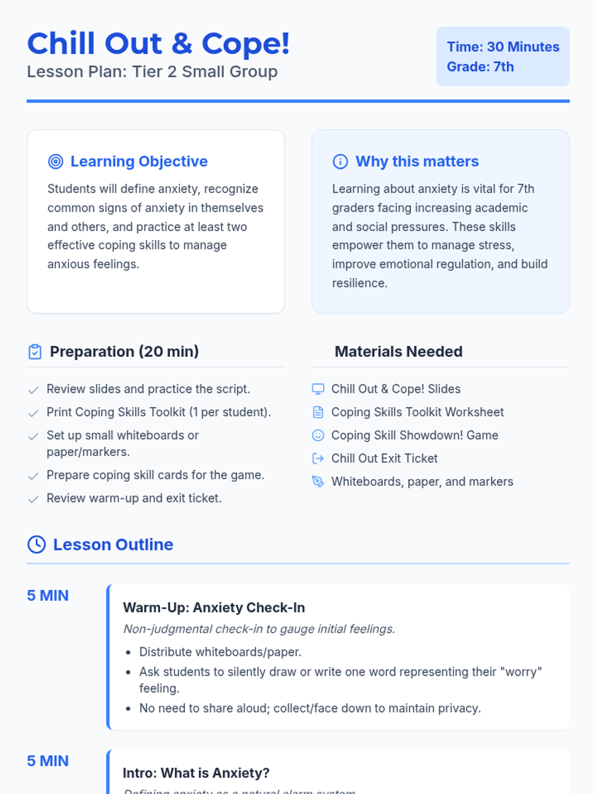 A 30-minute Tier 2 lesson for 7th graders to understand anxiety, identify its signs, and build a personalized toolkit of coping skills.