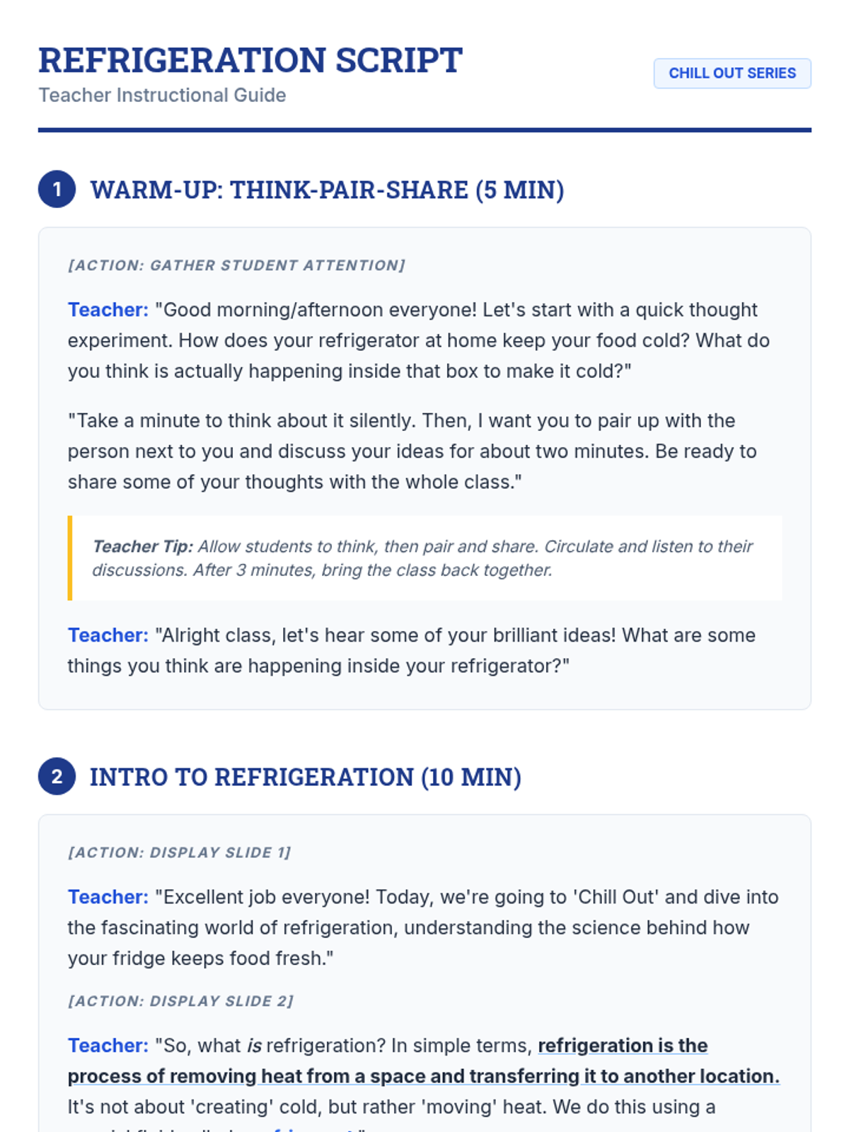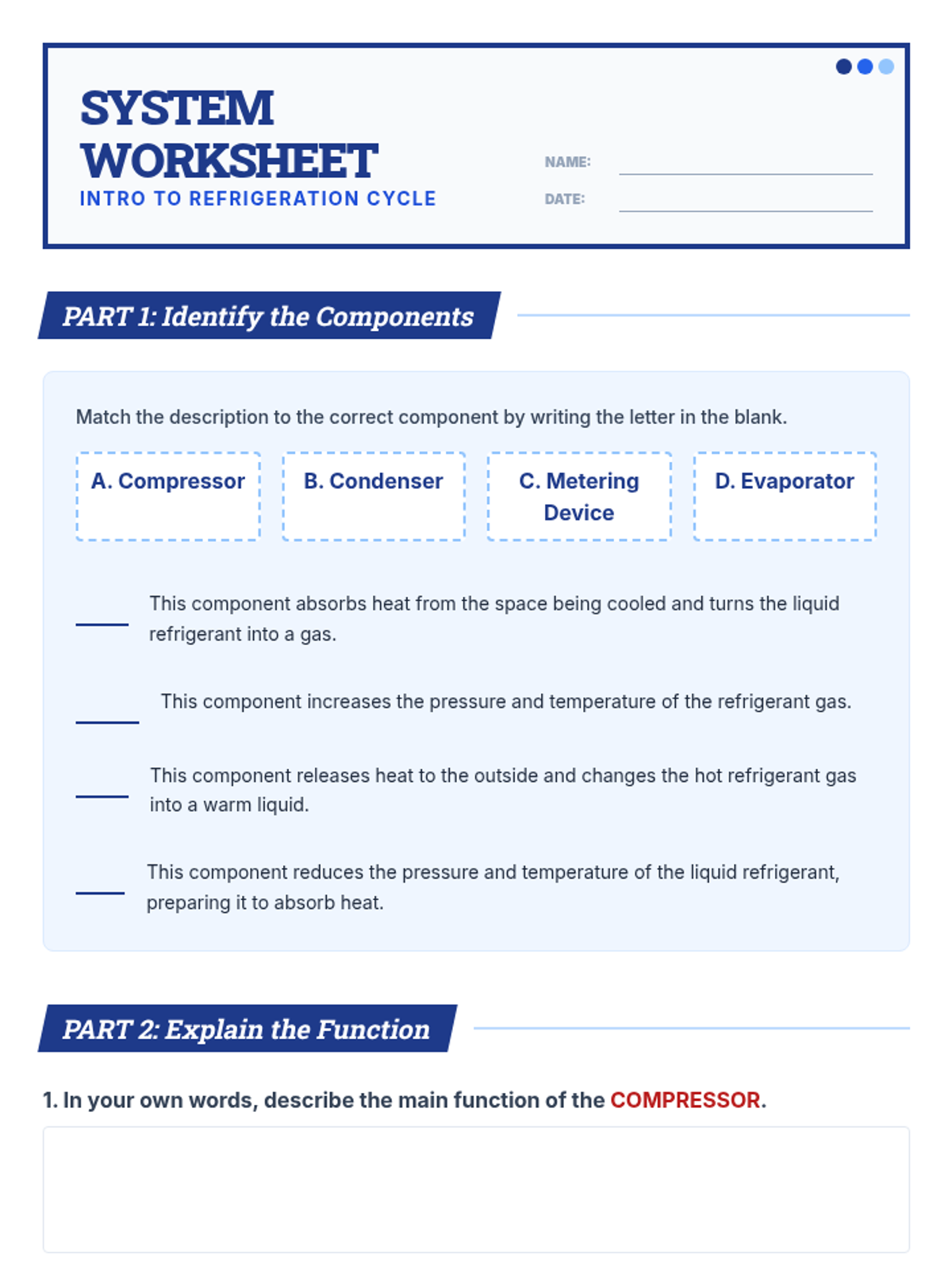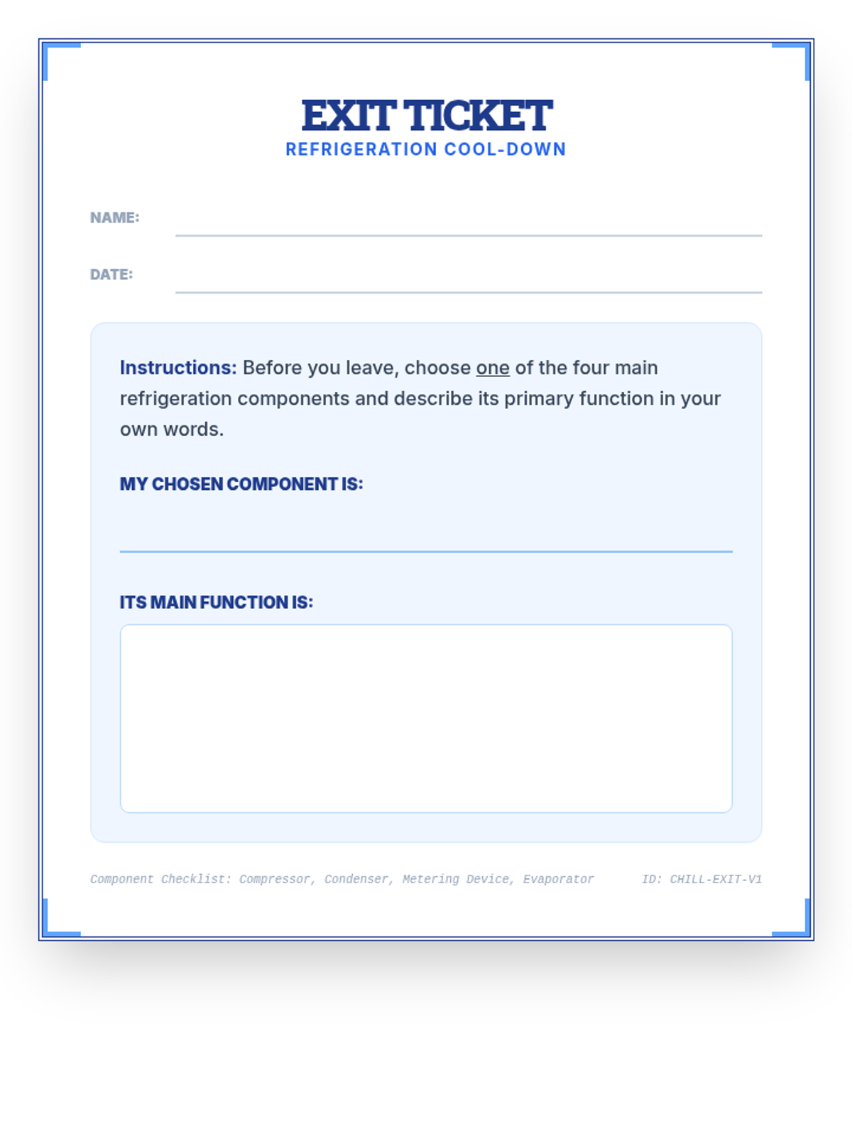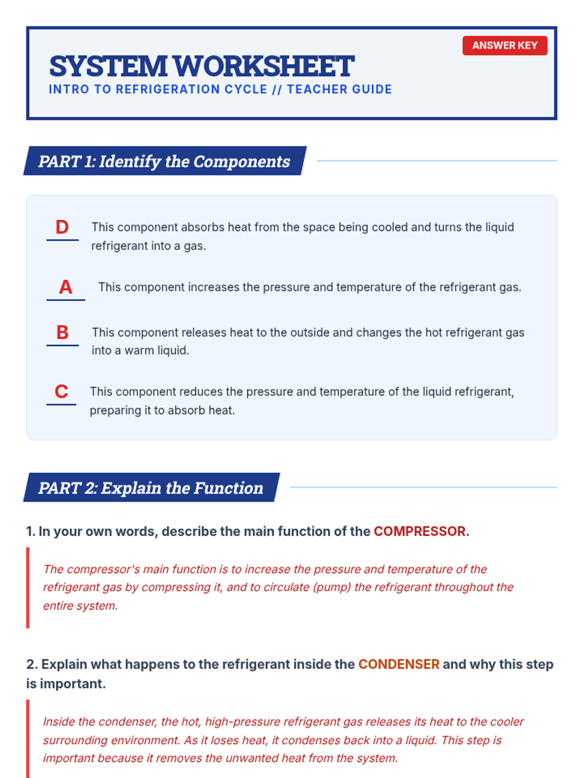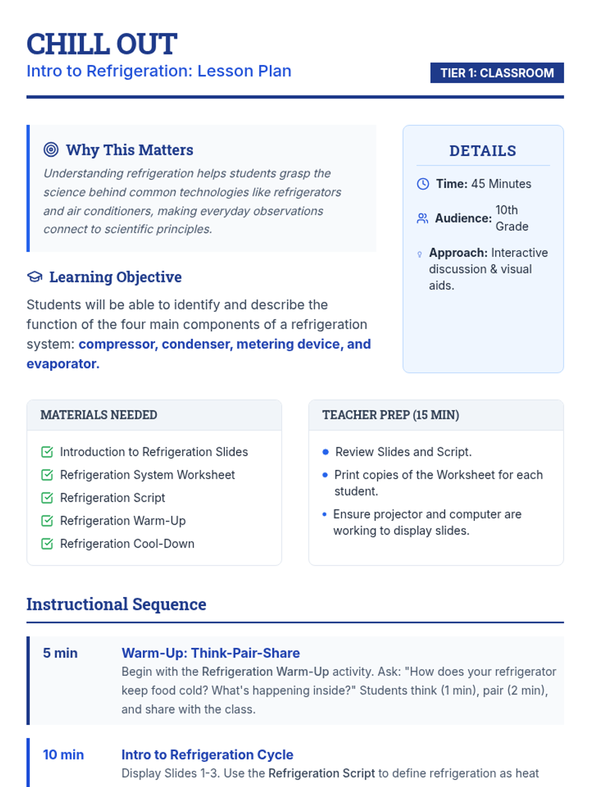A 45-minute introductory lesson for 10th-grade students on the fundamental components of a refrigeration cycle: compressor, condenser, metering device, and evaporator.
