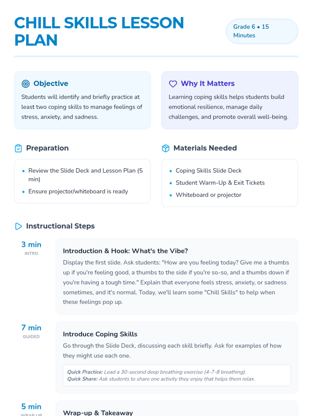 This 15-minute lesson introduces 6th-grade students to practical coping skills for managing stress, anxiety, and sadness, building emotional resilience through interactive practice.