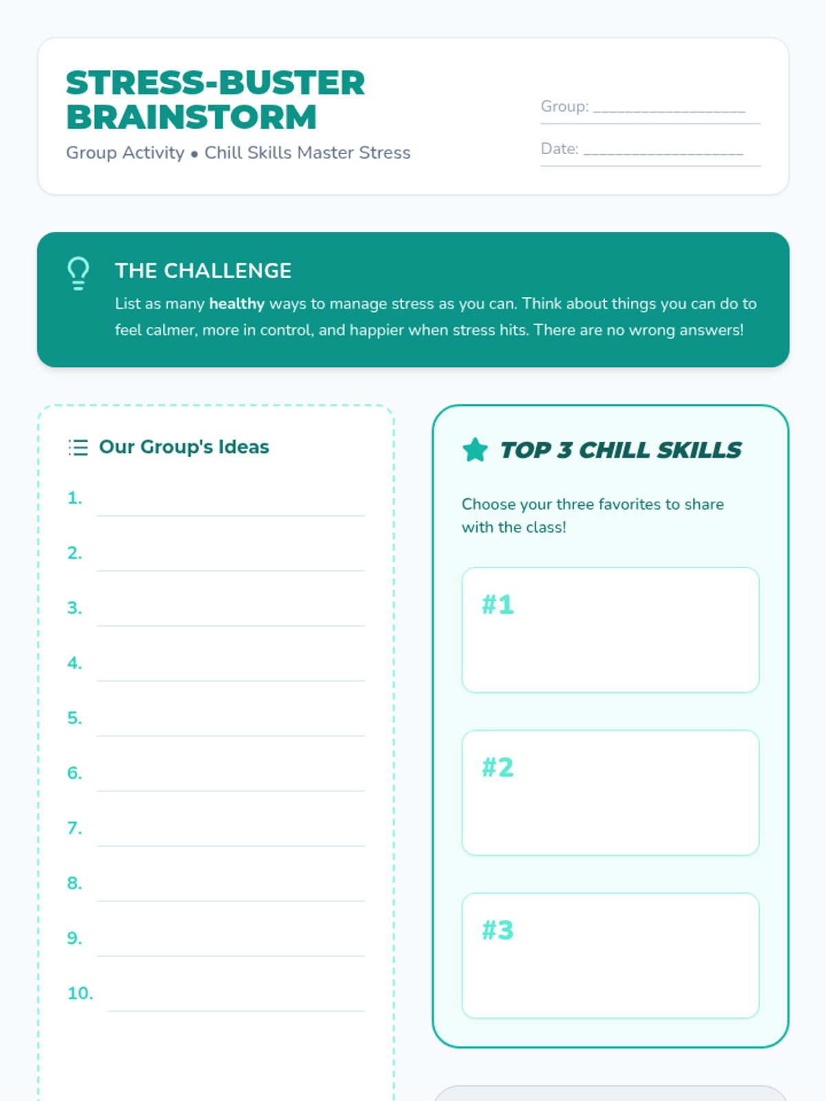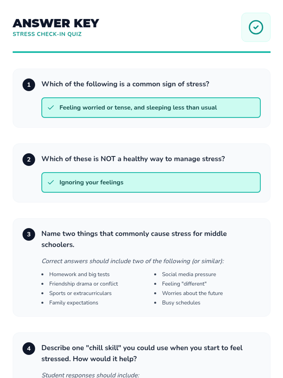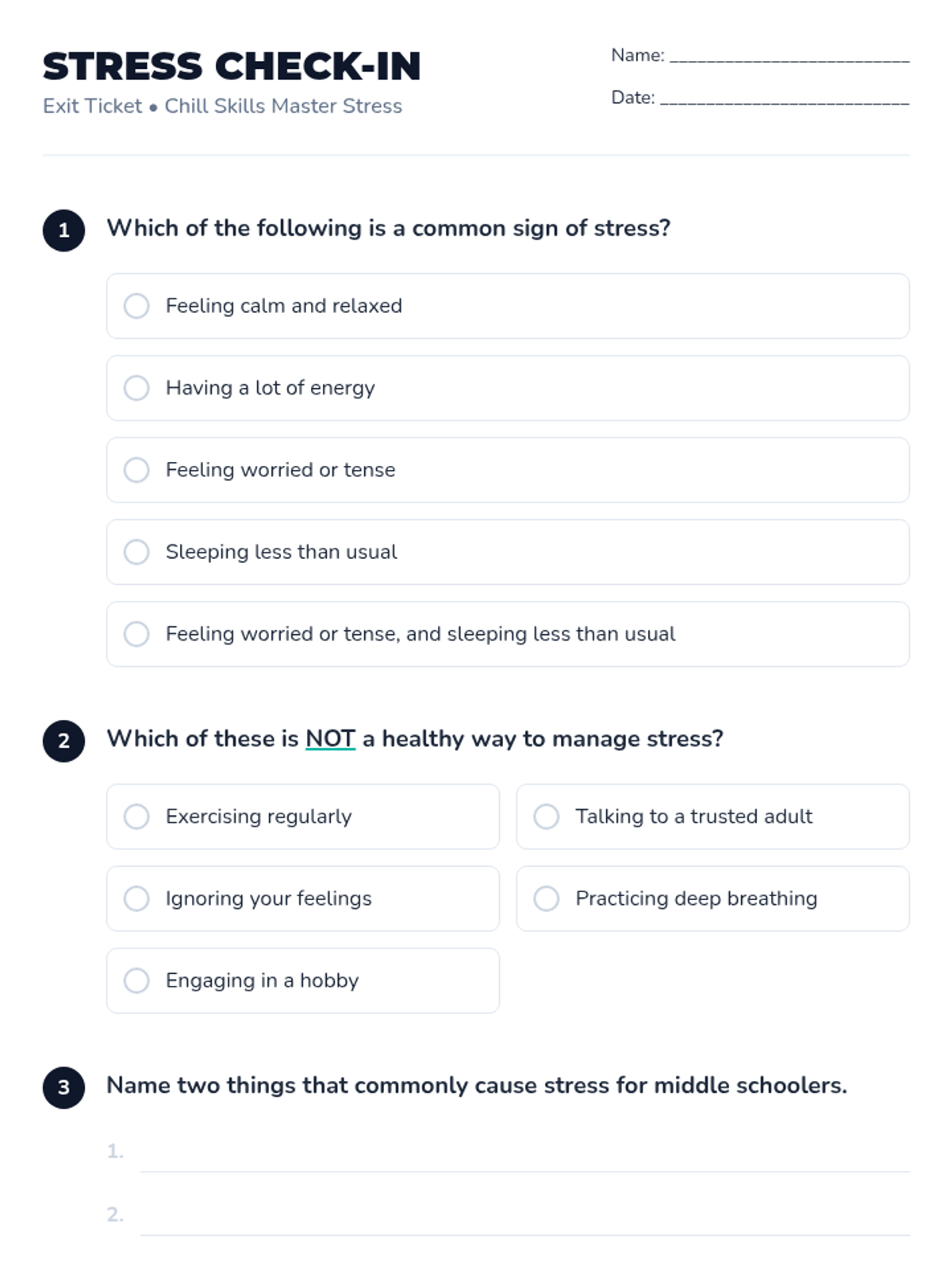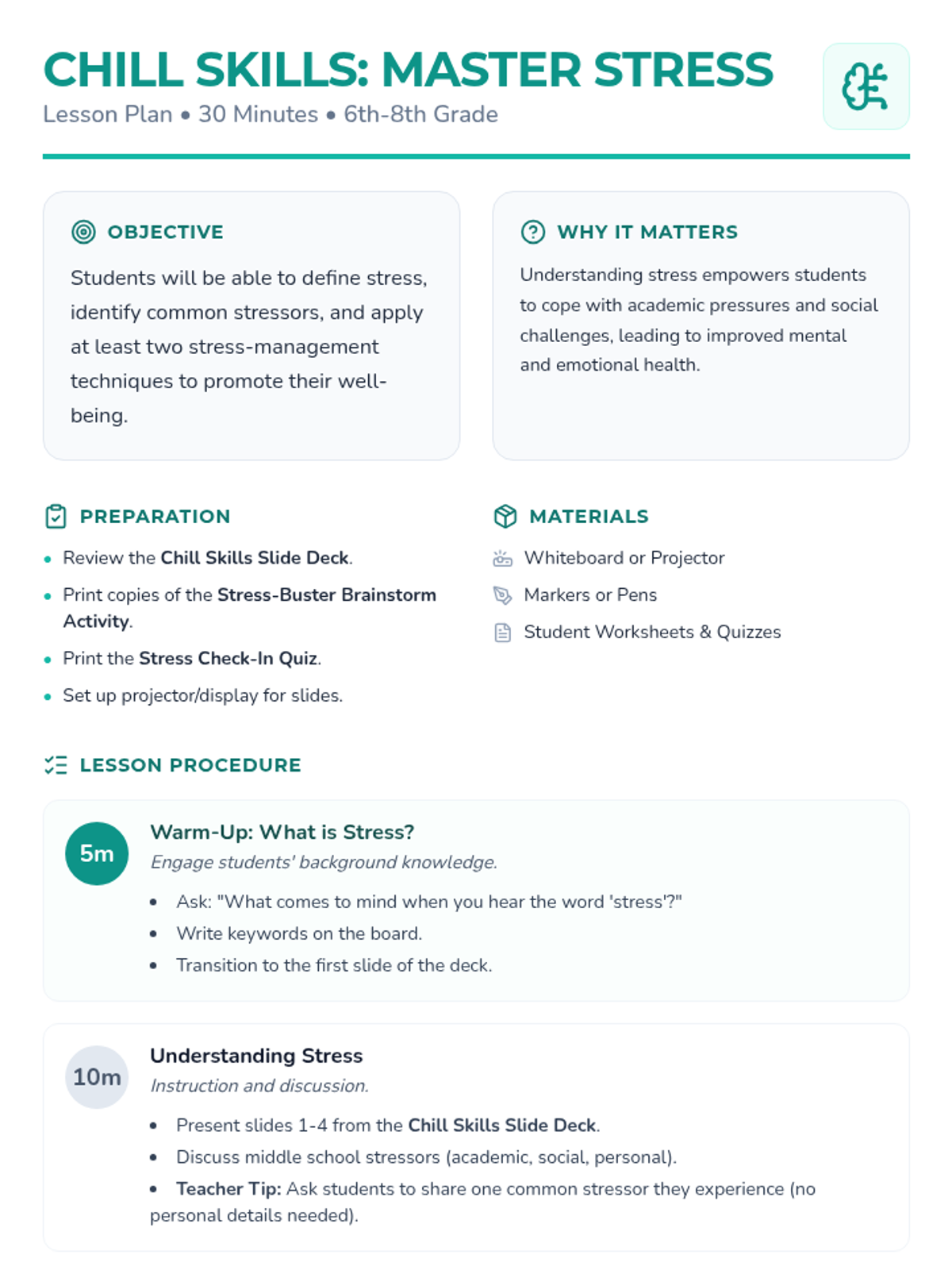 A 30-minute lesson for middle schoolers to understand stress, identify stressors, and learn practical management techniques ('chill skills').