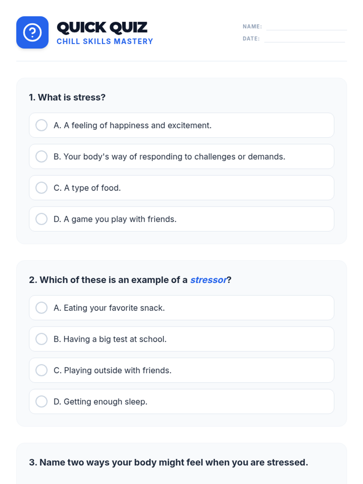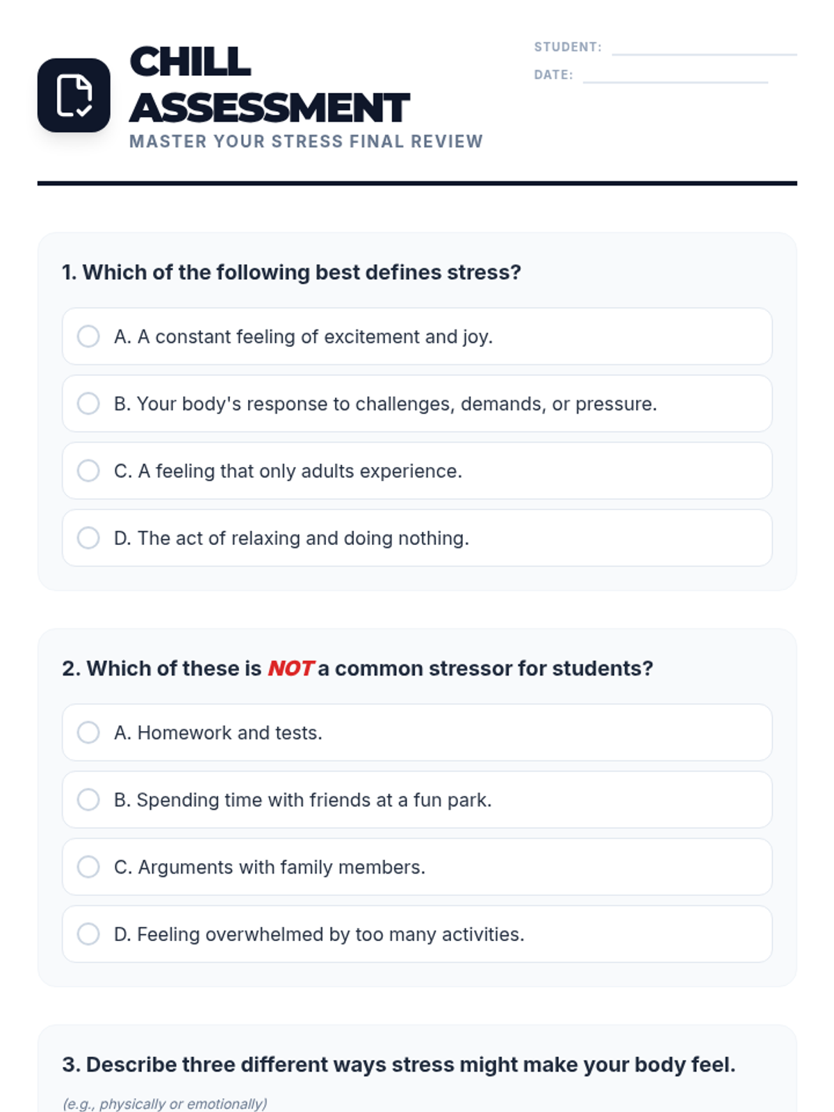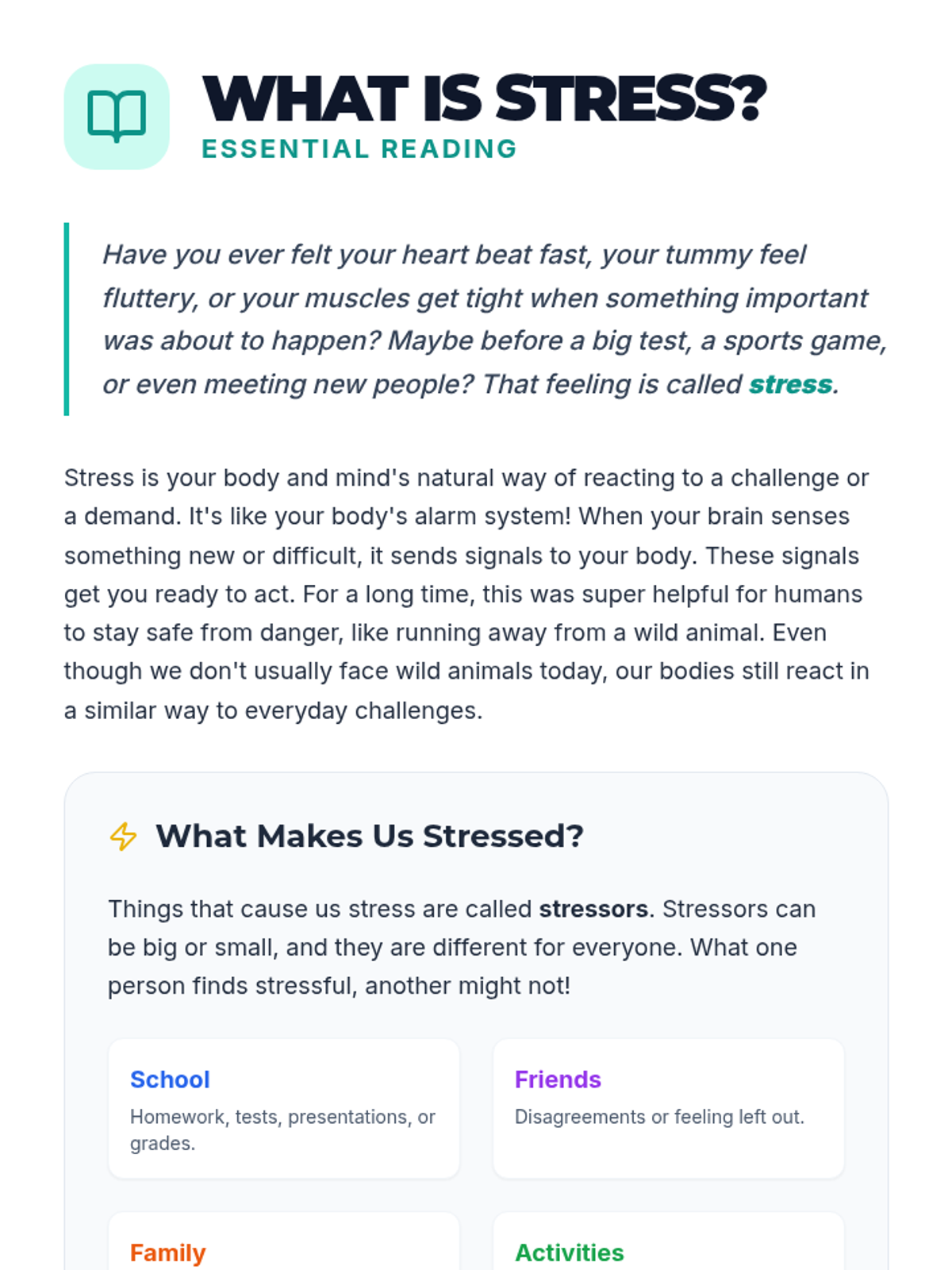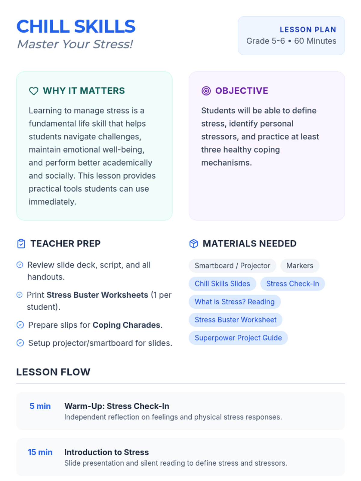 A 60-minute lesson for 5th and 6th graders that introduces the concept of stress, helps identify personal stressors, and teaches healthy coping mechanisms through interactive activities and a creative project.