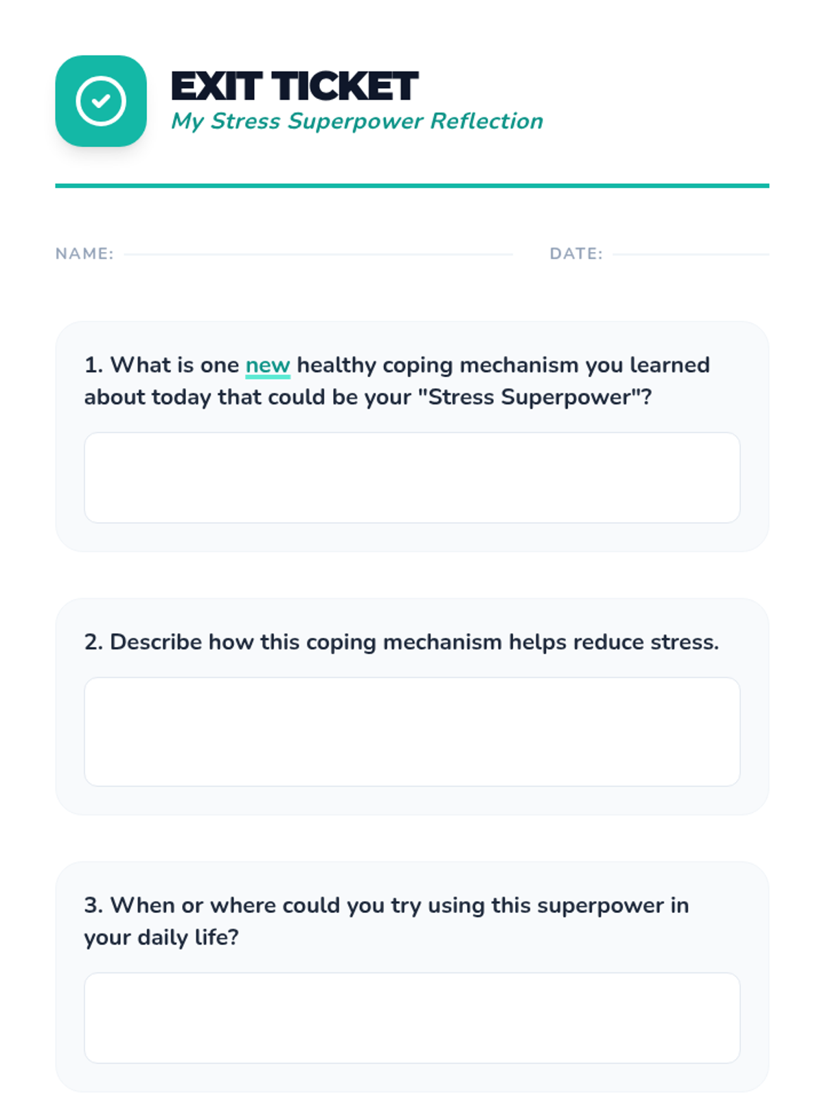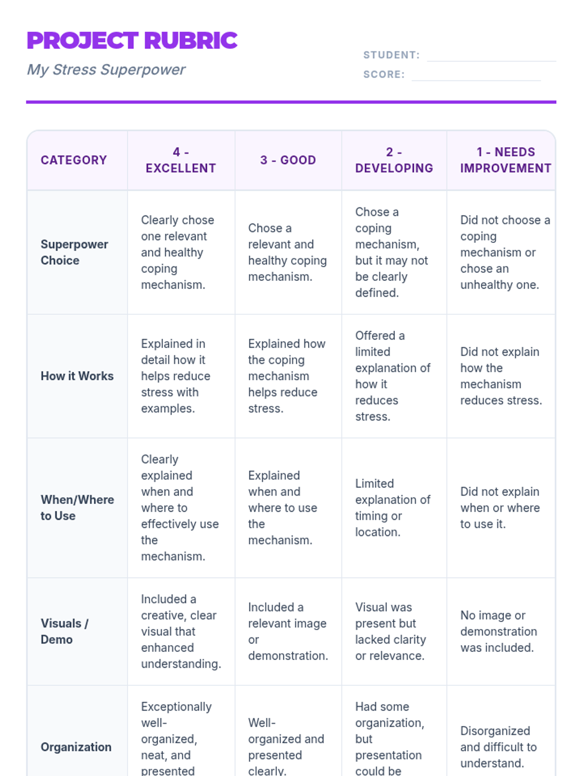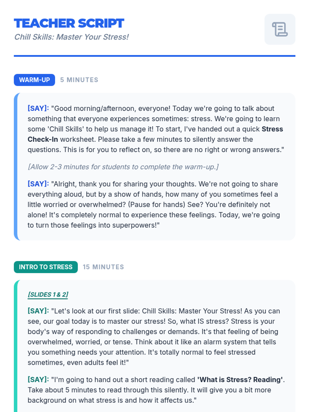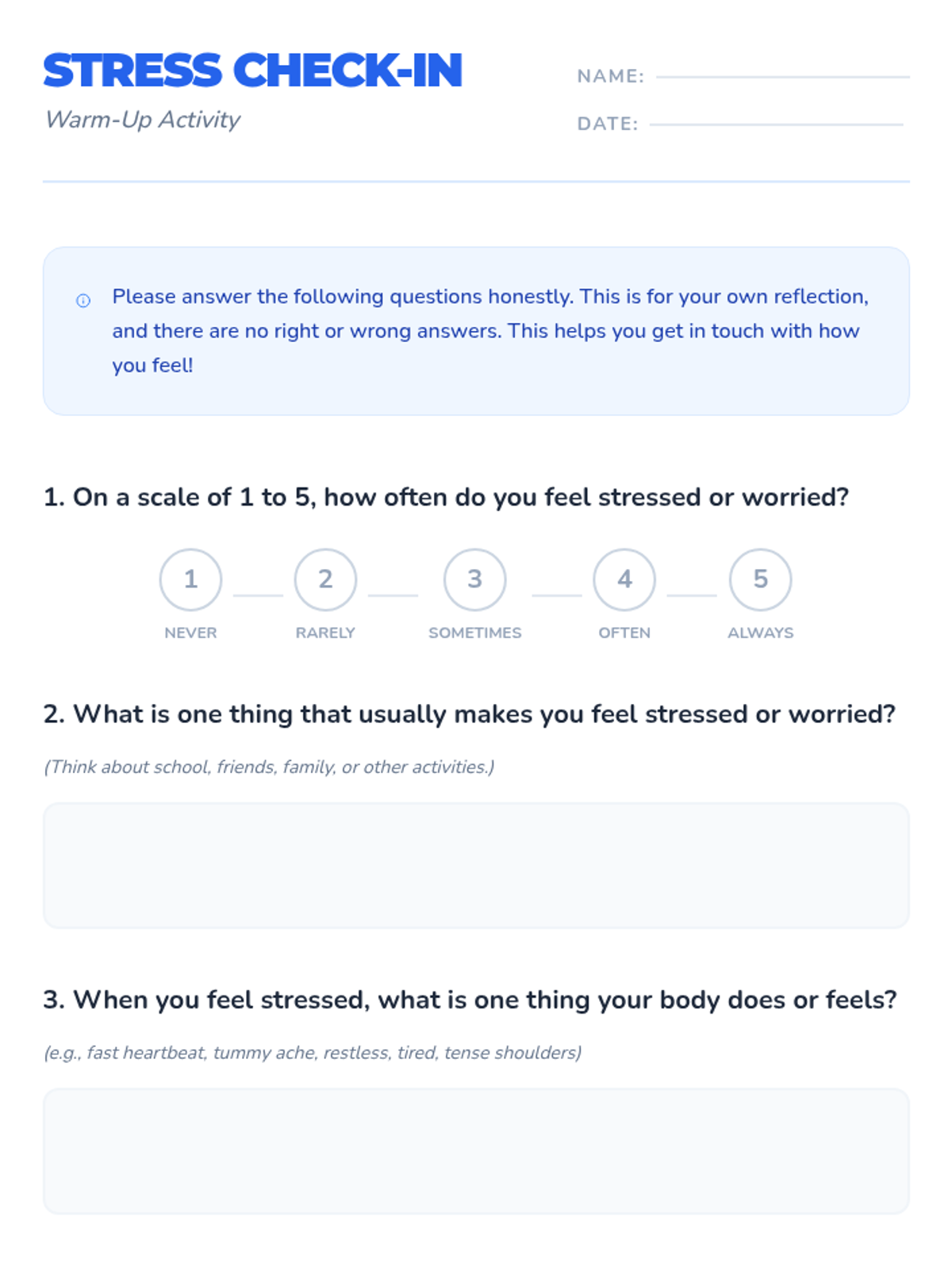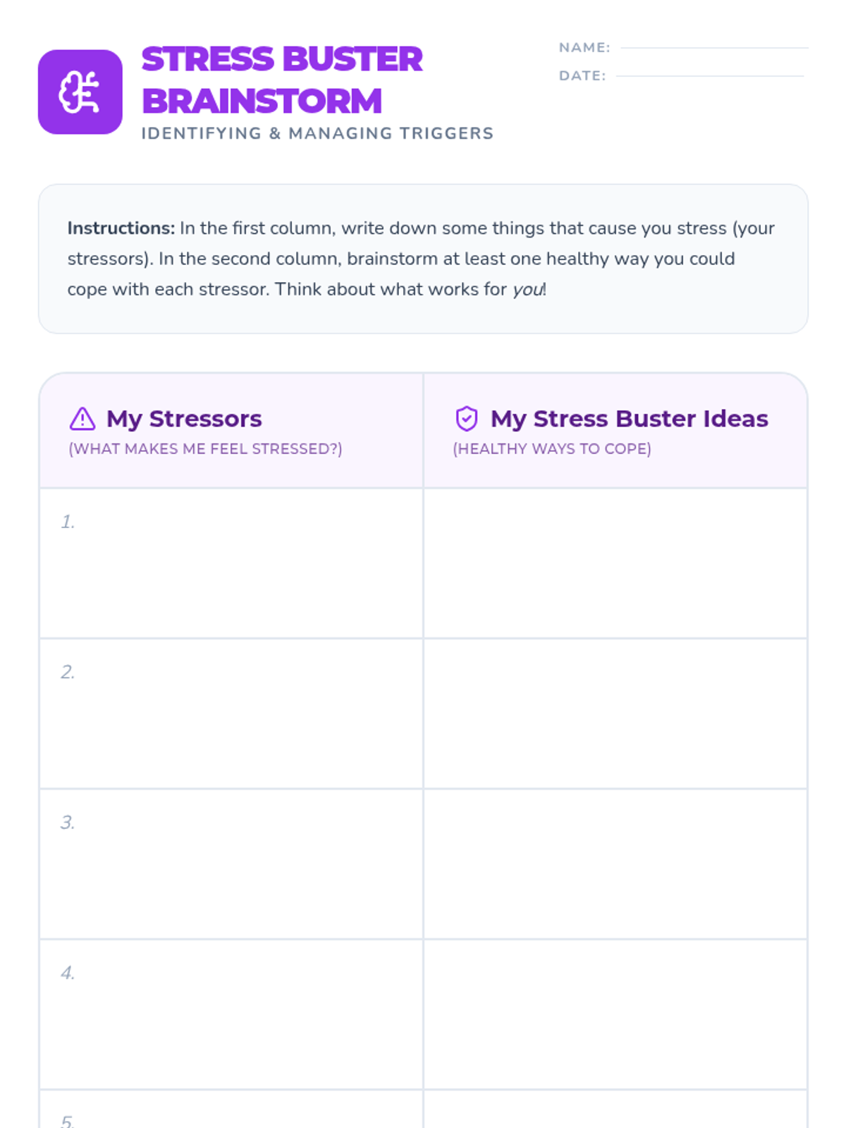 A 60-minute lesson for 5th and 6th graders that introduces the concept of stress, helps identify personal stressors, and teaches healthy coping mechanisms through interactive activities and a creative project.