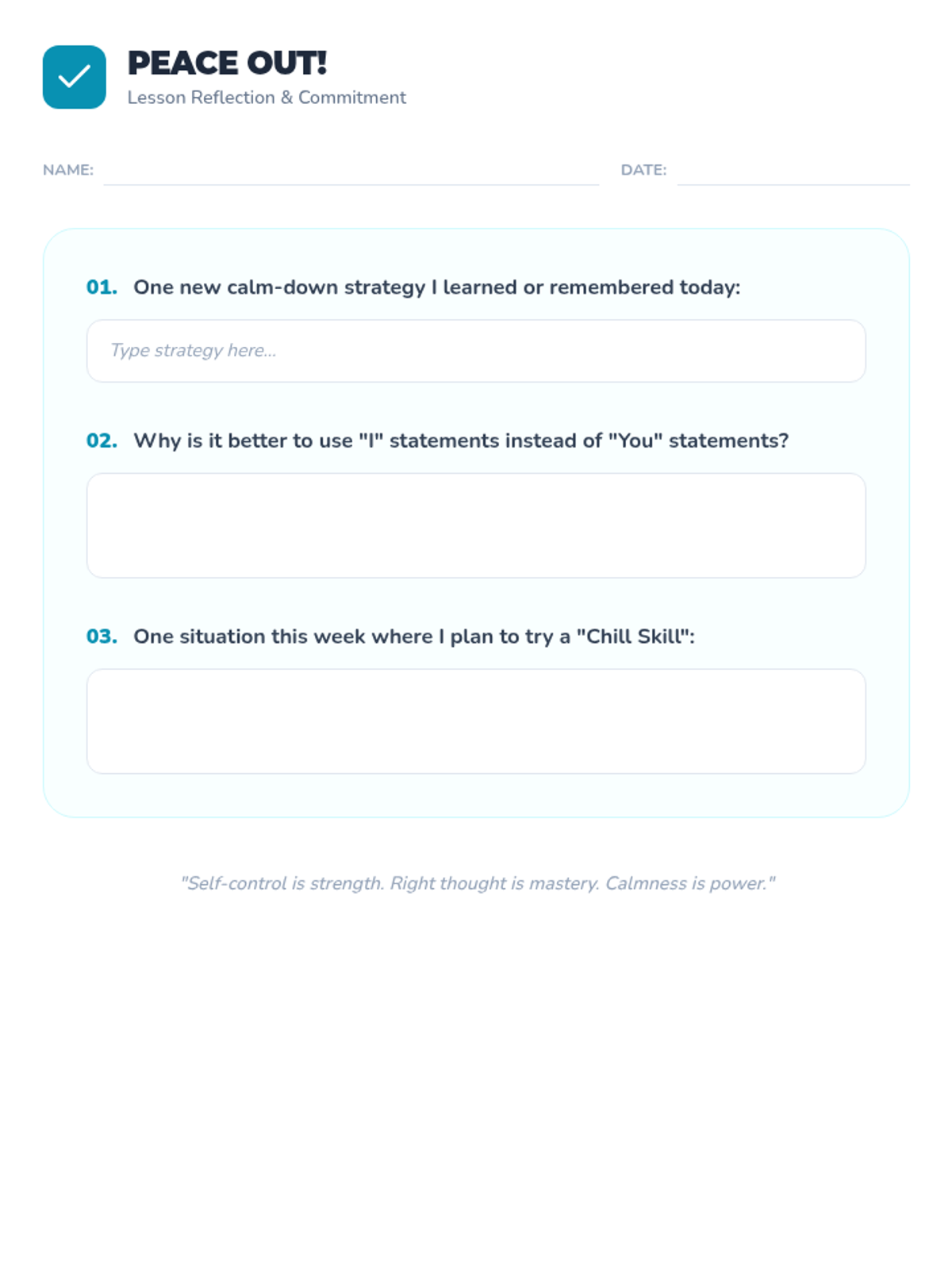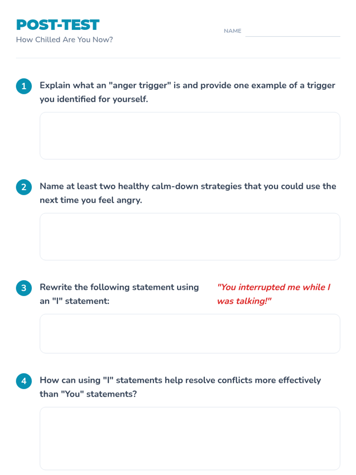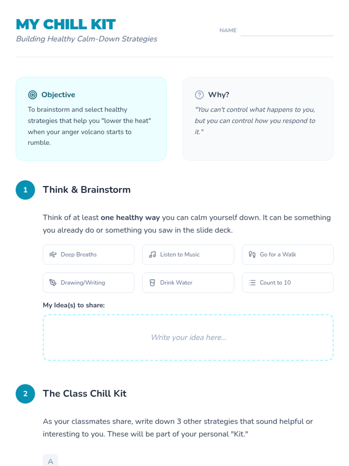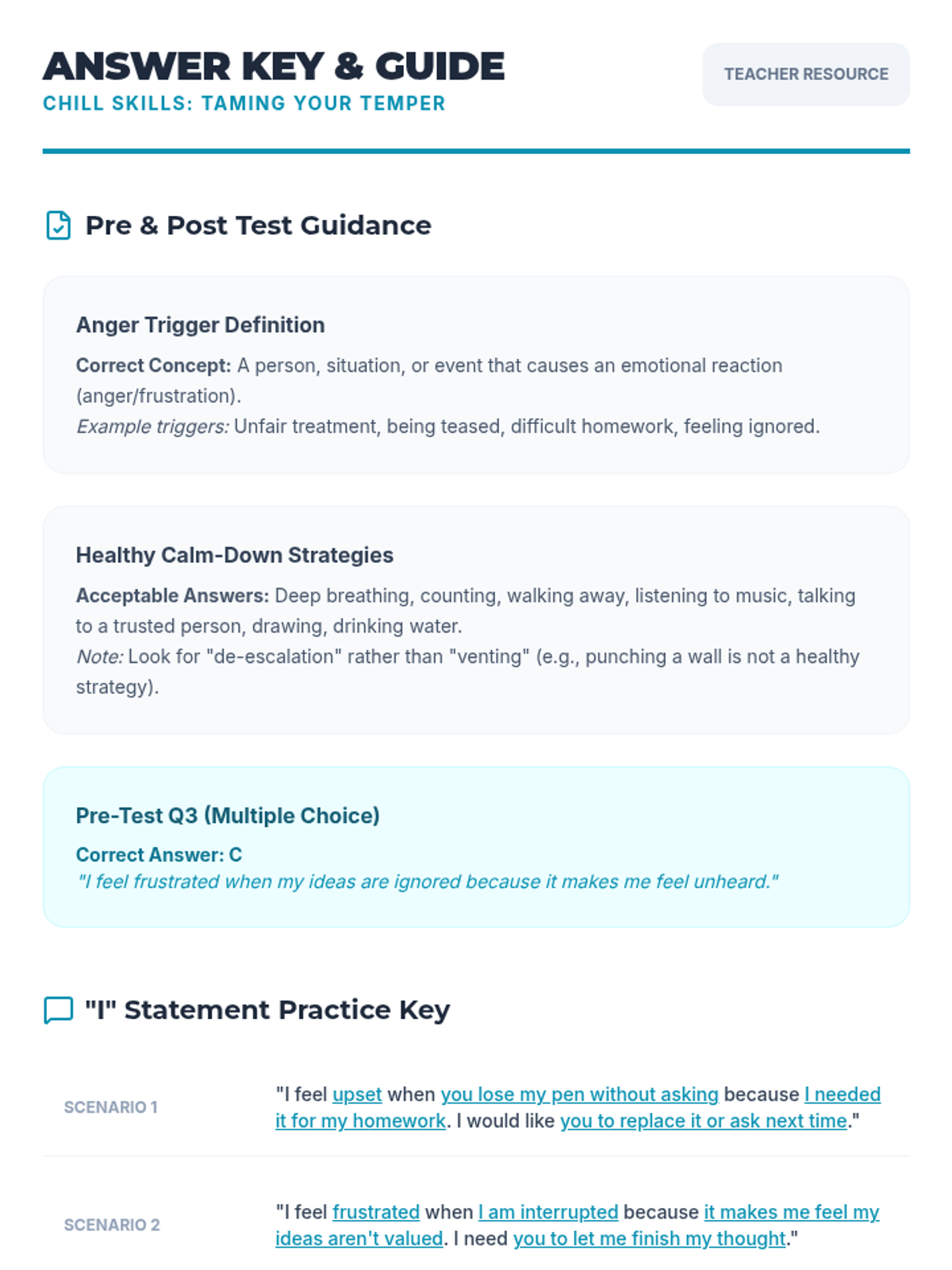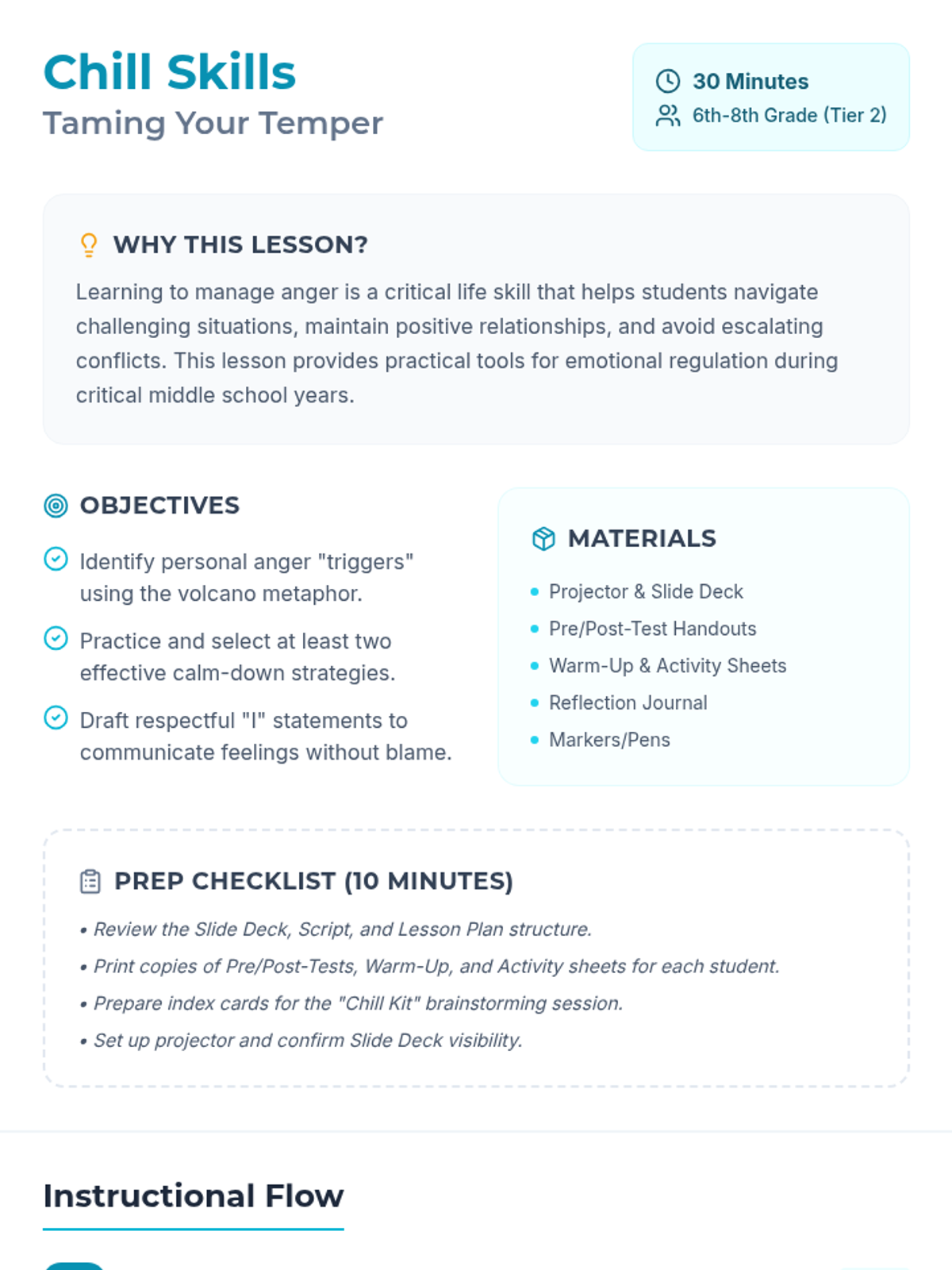A 30-minute interactive lesson for 6th-8th graders focused on recognizing anger triggers, learning calm-down strategies, and using 'I' statements for respectful communication. Students will explore the 'volcano' metaphor for anger and build their own 'chill kit' of coping skills.
