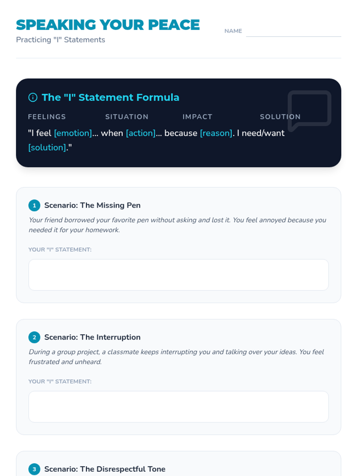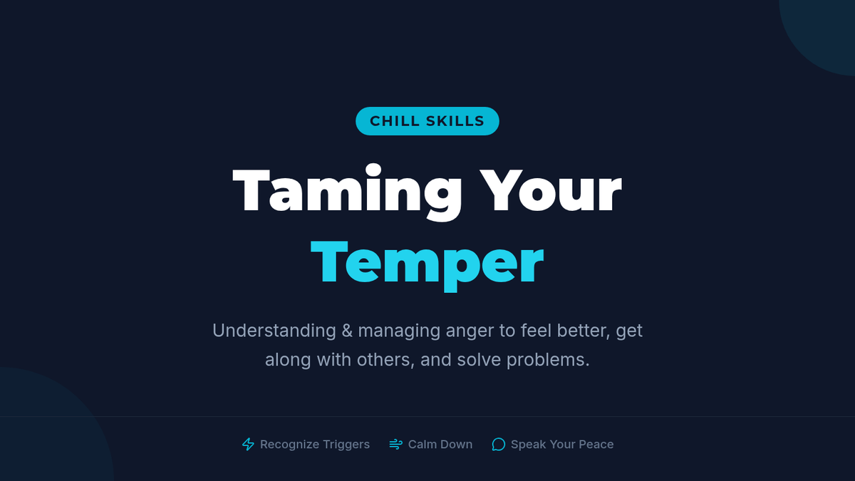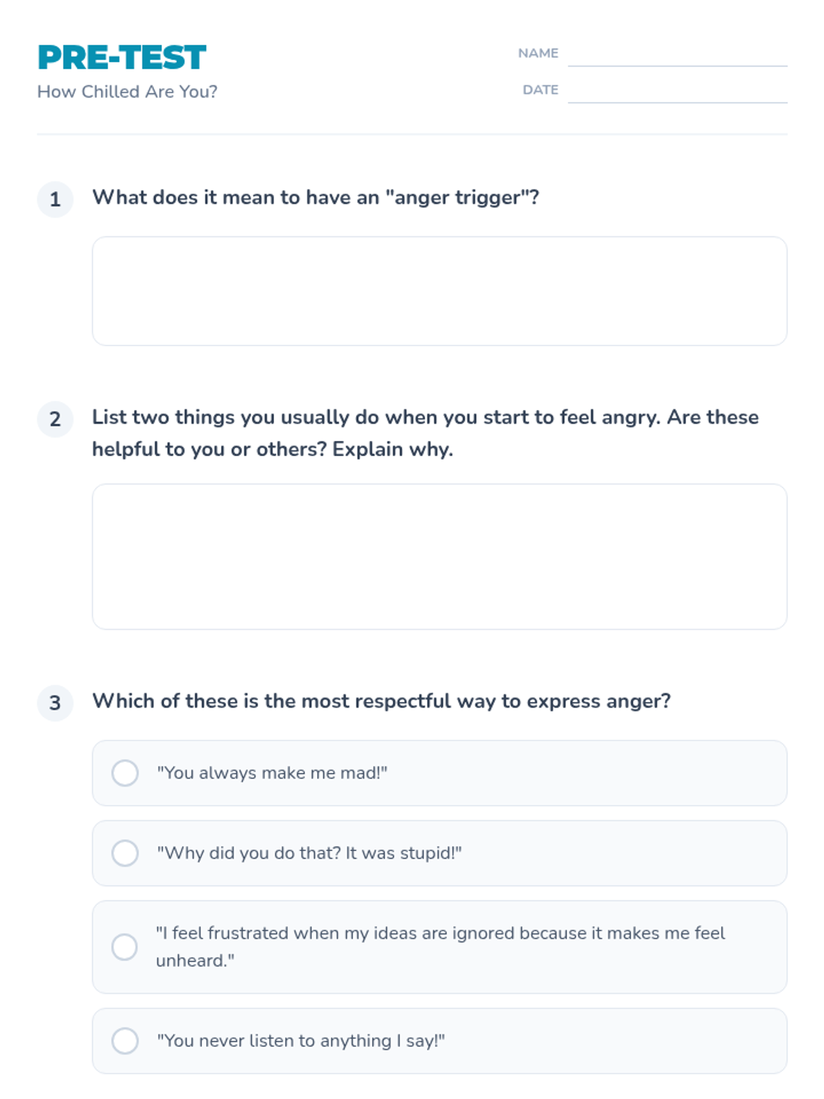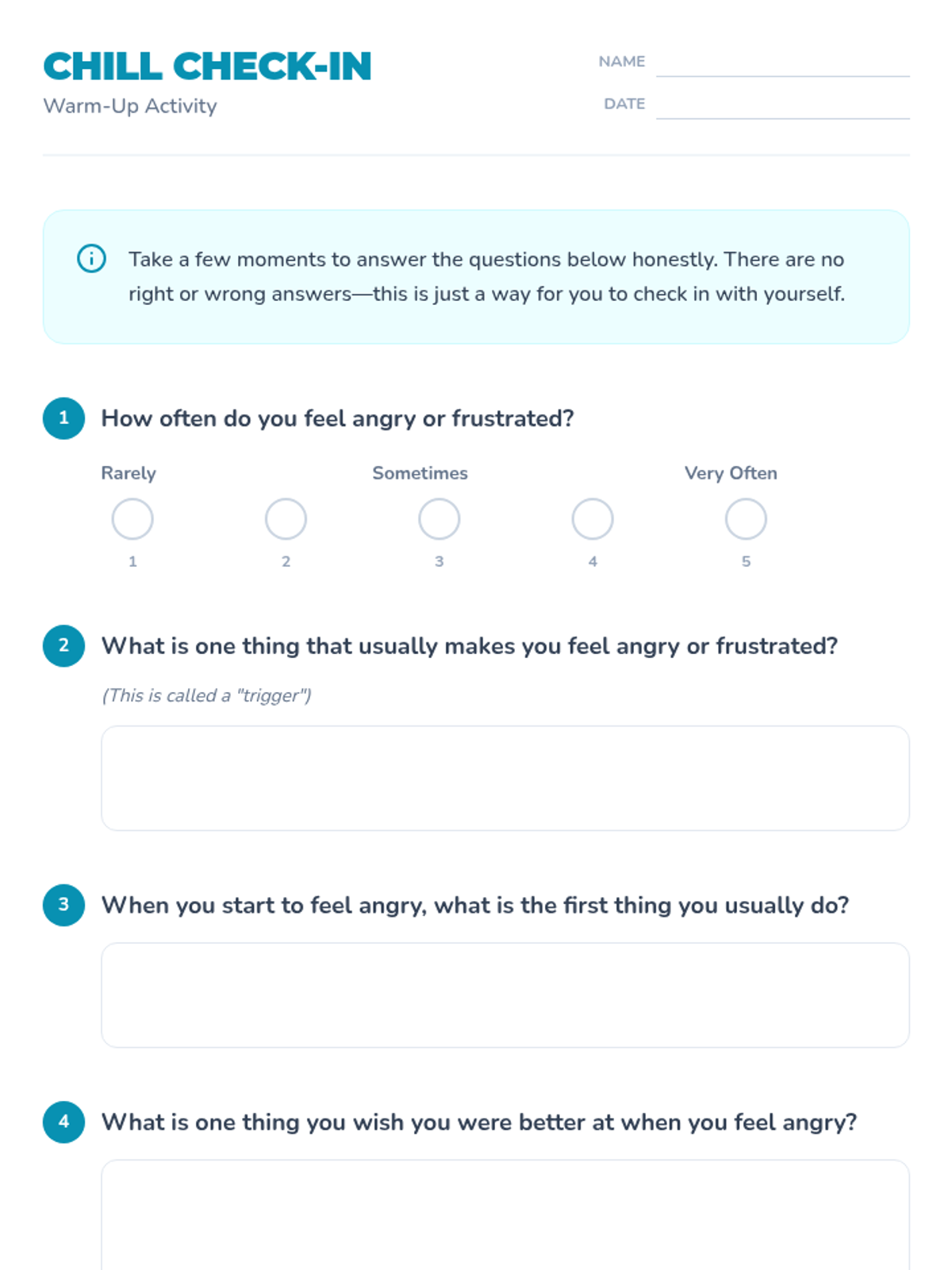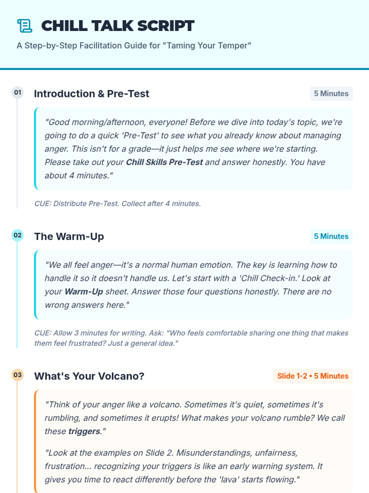 A 30-minute interactive lesson for 6th-8th graders focused on recognizing anger triggers, learning calm-down strategies, and using 'I' statements for respectful communication. Students will explore the 'volcano' metaphor for anger and build their own 'chill kit' of coping skills.