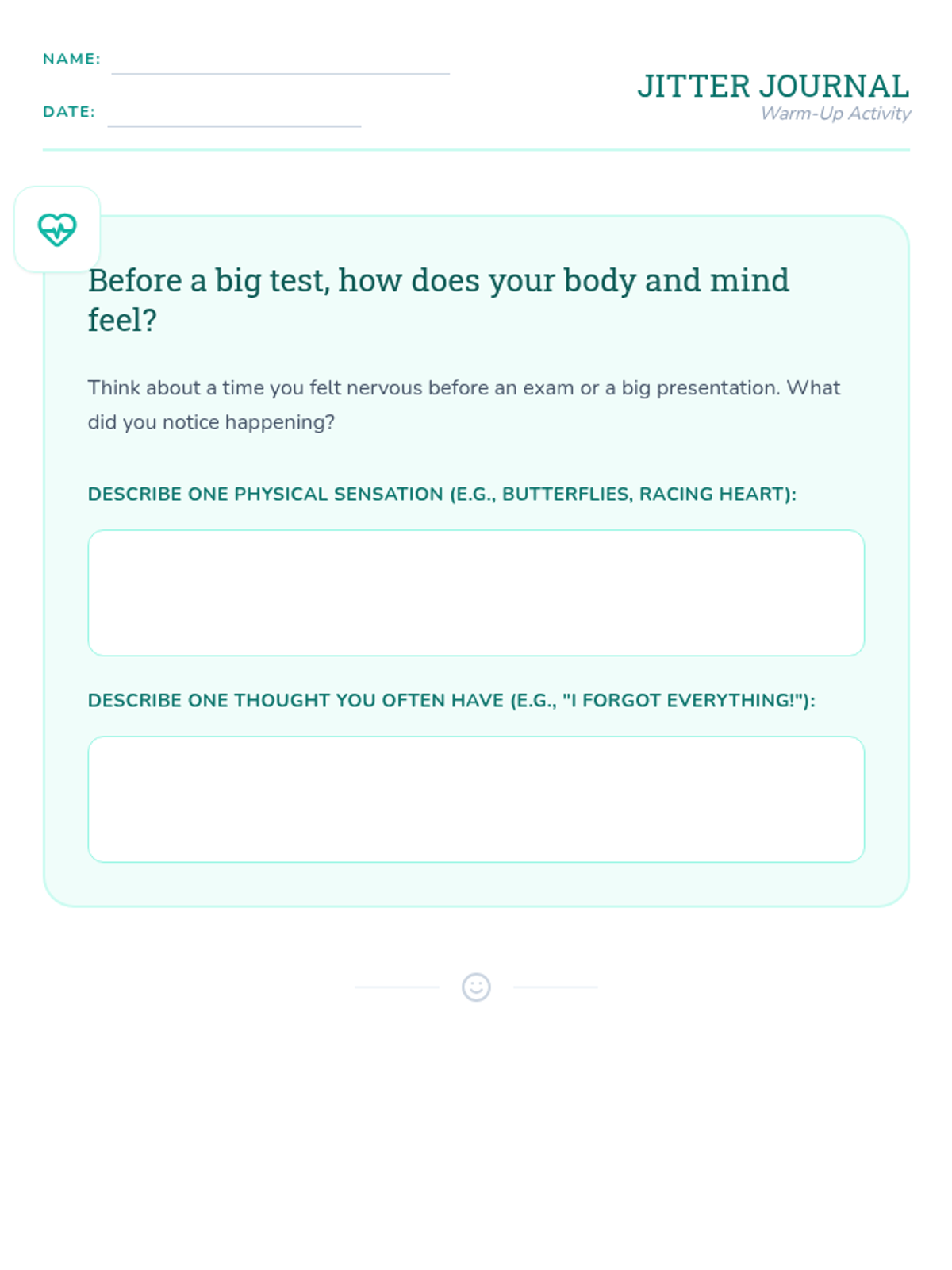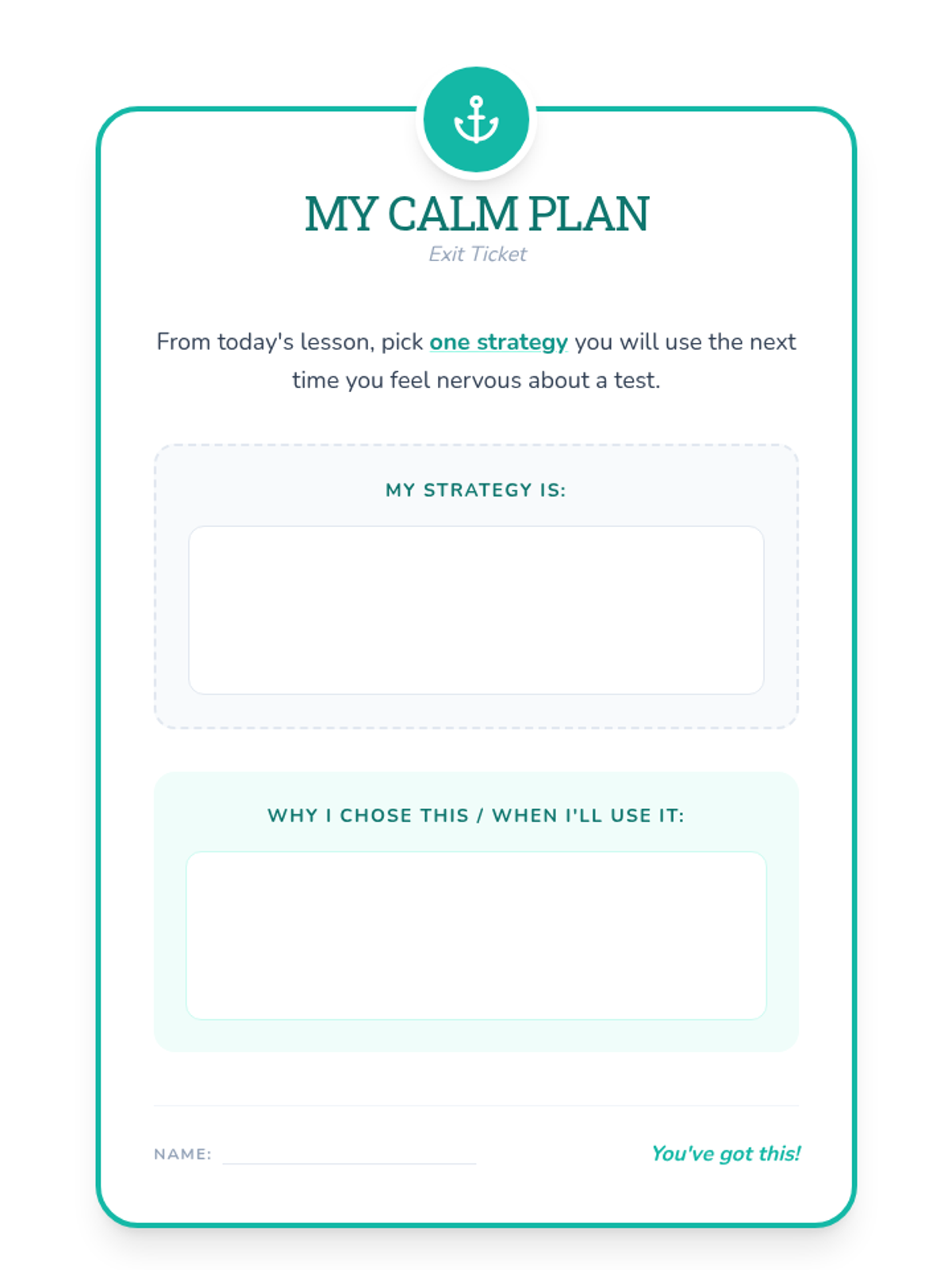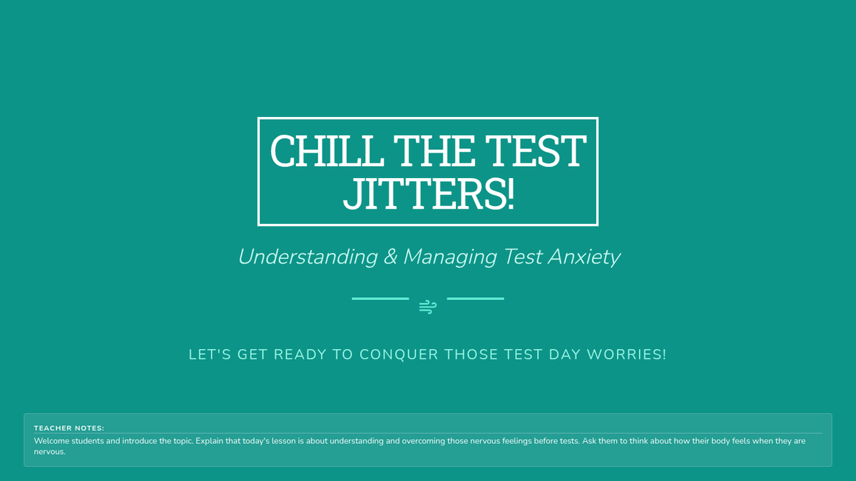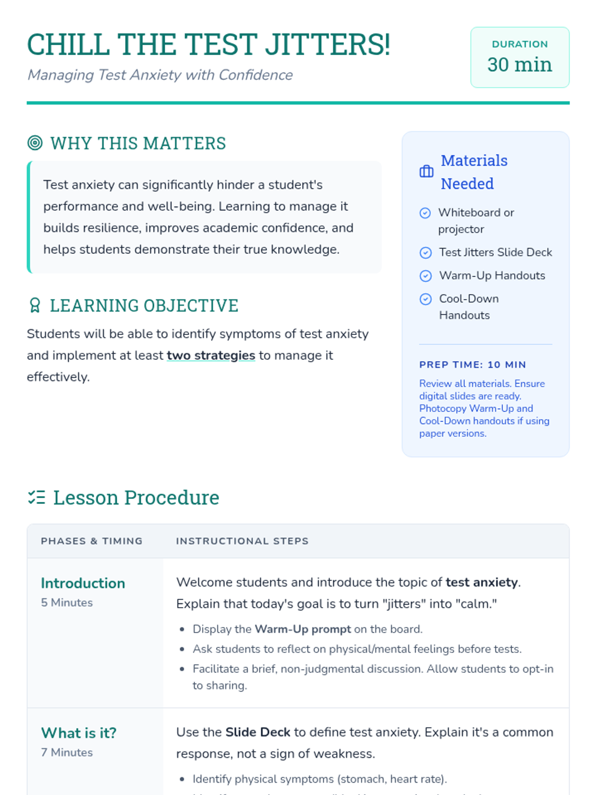 A 30-minute lesson for 6th-grade students to understand test anxiety and learn practical strategies like deep breathing, positive self-talk, and visualization to manage it.