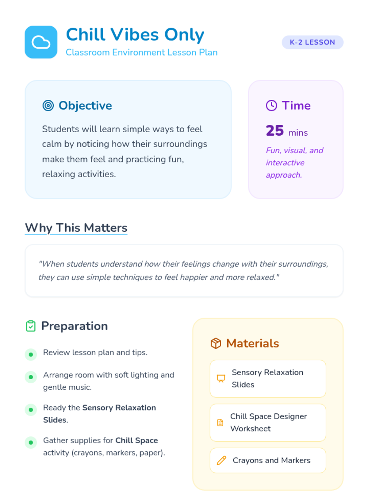 Create a calming classroom environment through sensory activities and relaxation techniques. This lesson helps K-2 students recognize how their surroundings affect their emotions and teaches them practical ways to find peace.