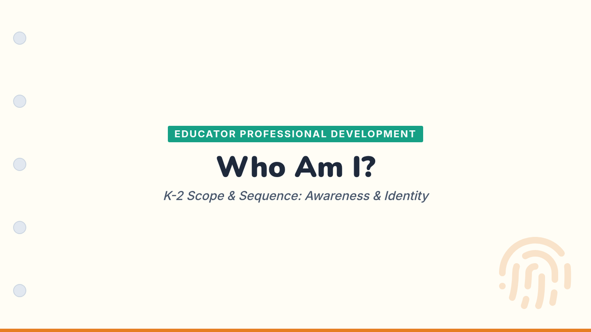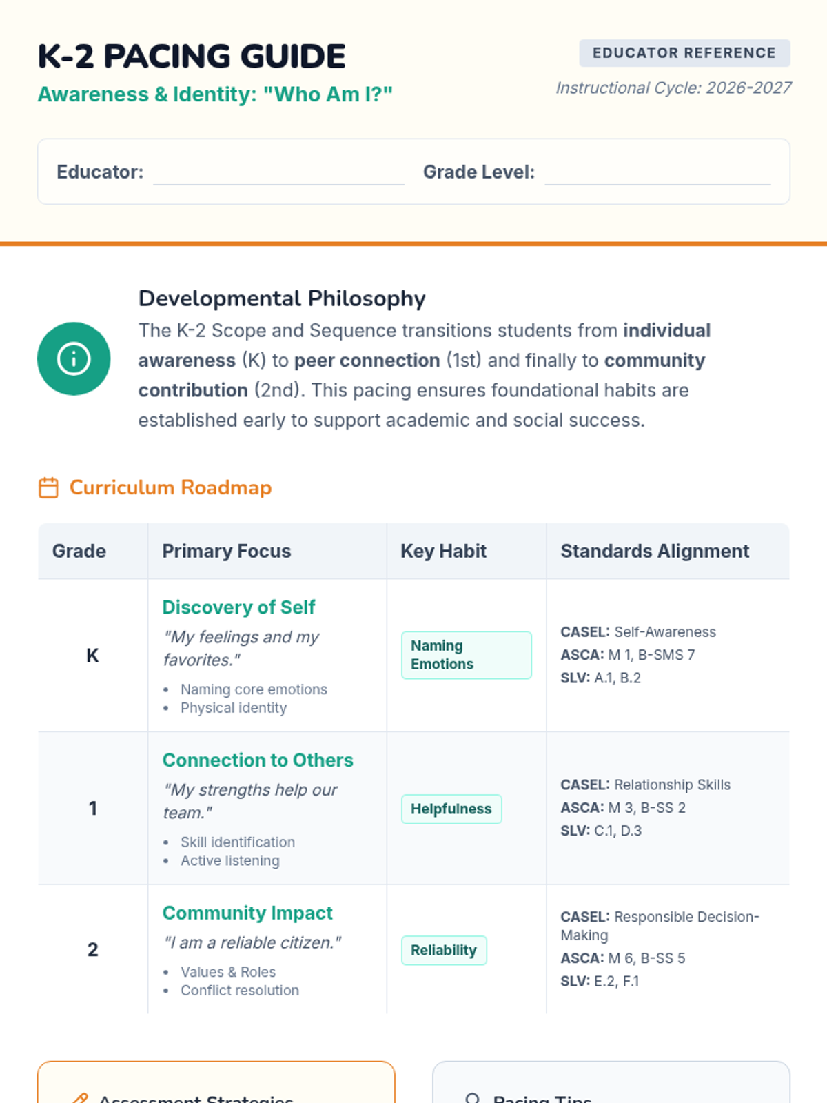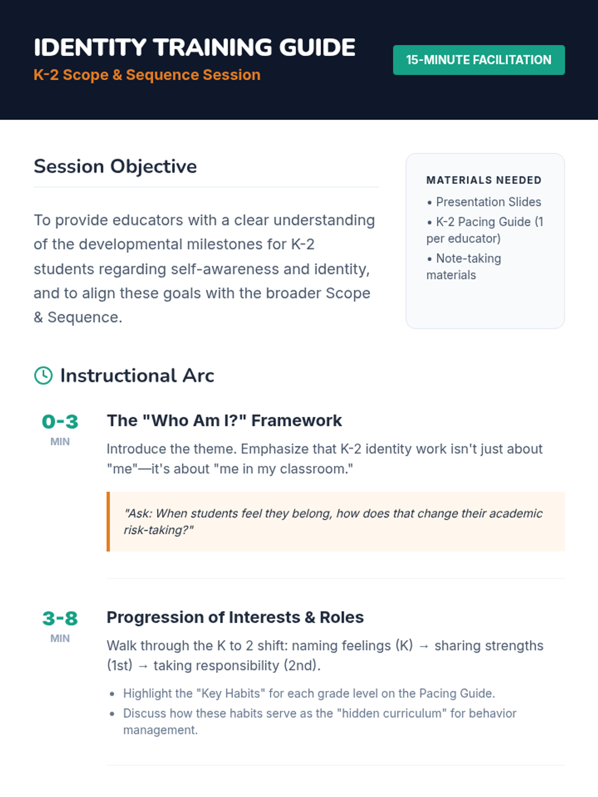 An educator-focused training session reviewing the K-2 developmental progression for self-awareness and identity, mapping curriculum pacing to CASEL and ASCA standards.