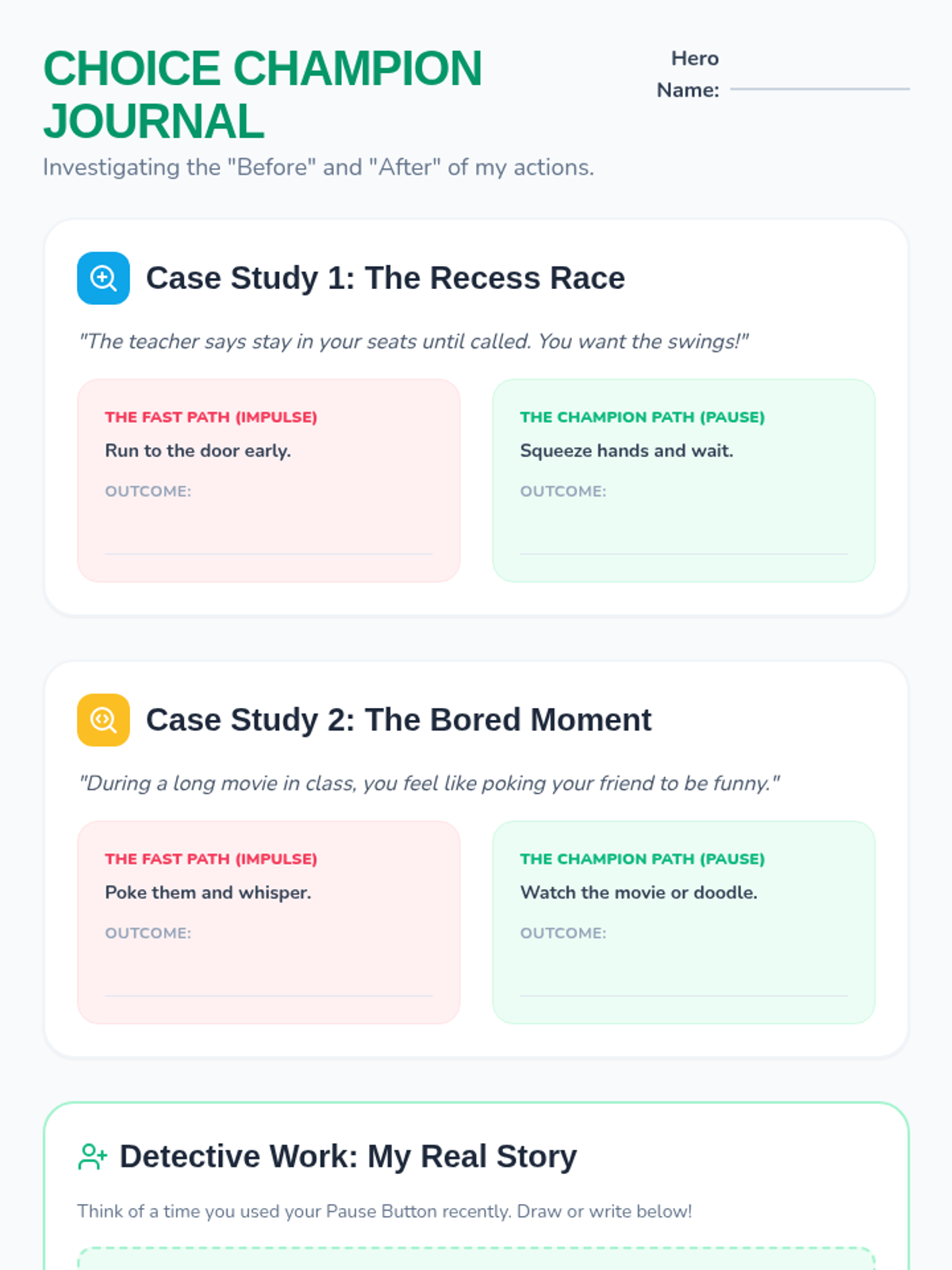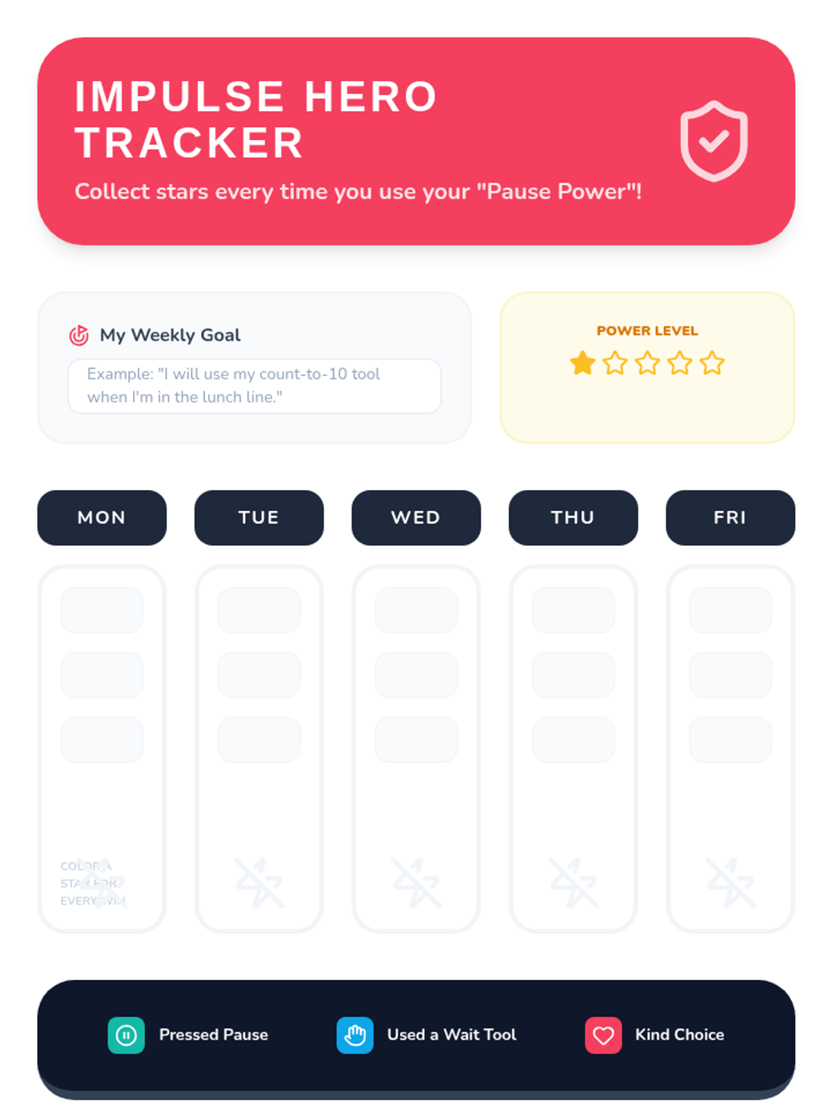Encourages long-term self-regulation through reflection and a daily tracker to celebrate successful 'stops' and 'starts'.