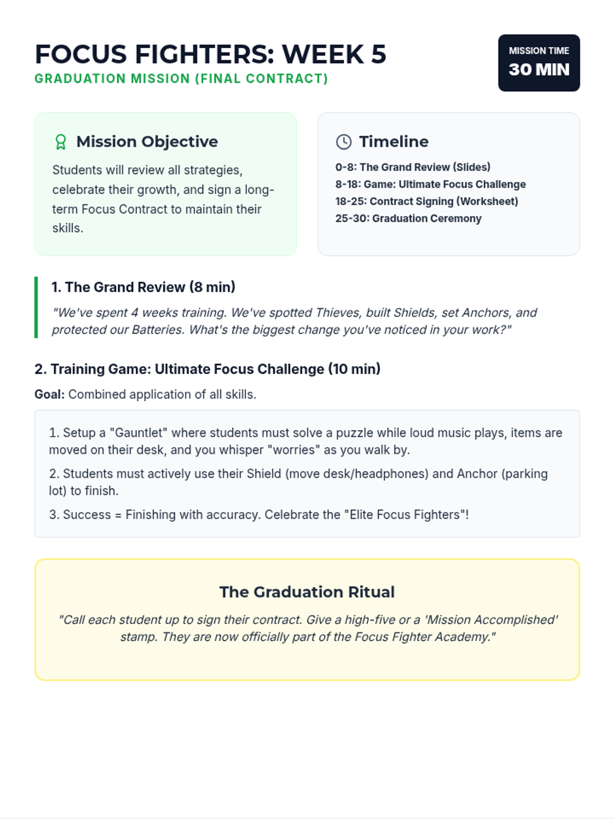 The final mission involving a comprehensive review, graduation ceremony, and the creation of a long-term focus contract.