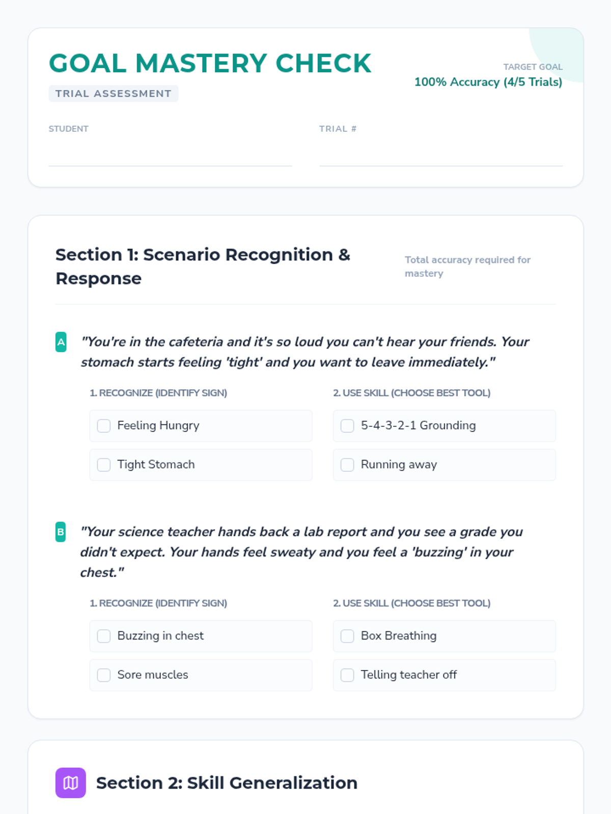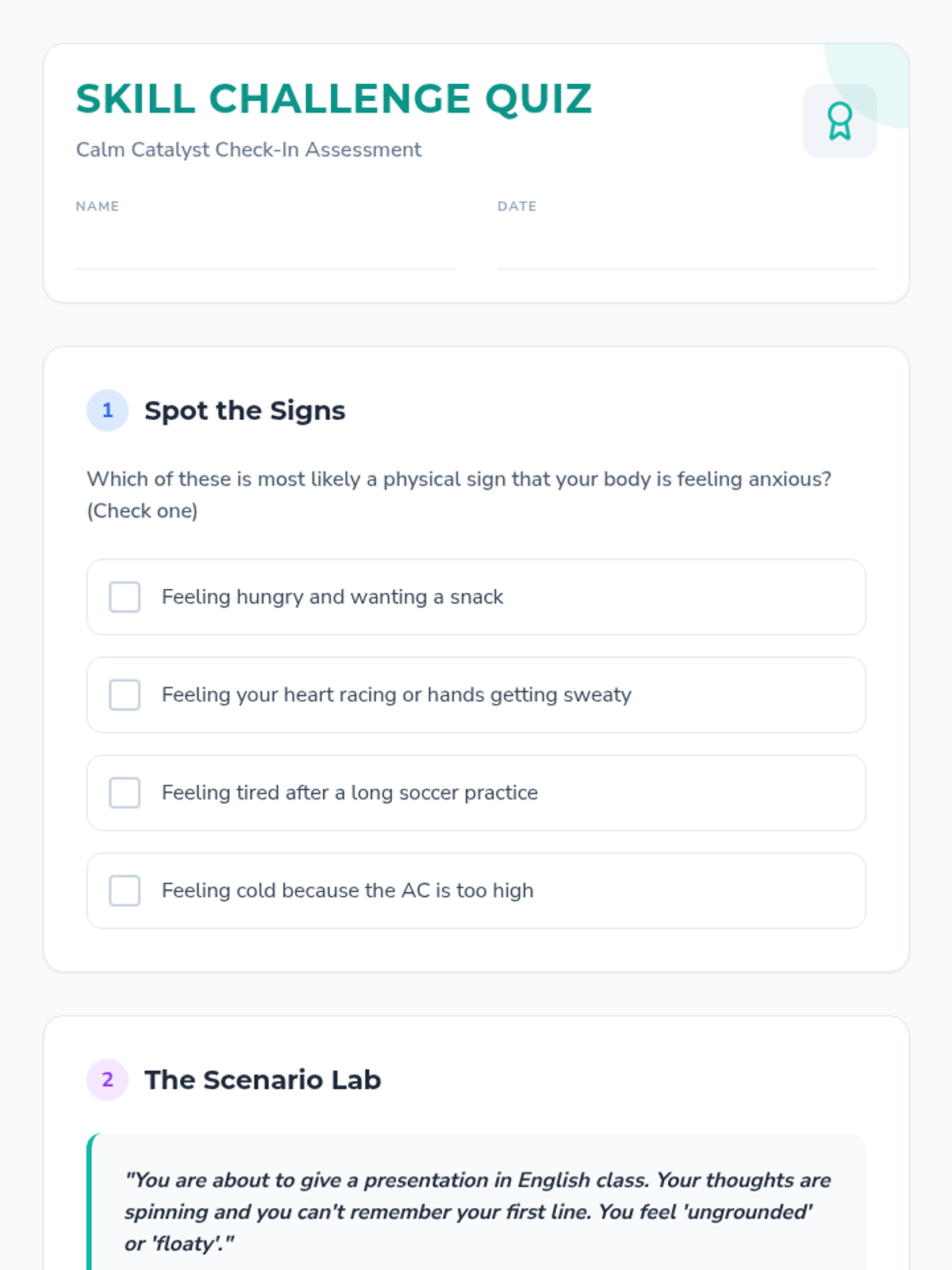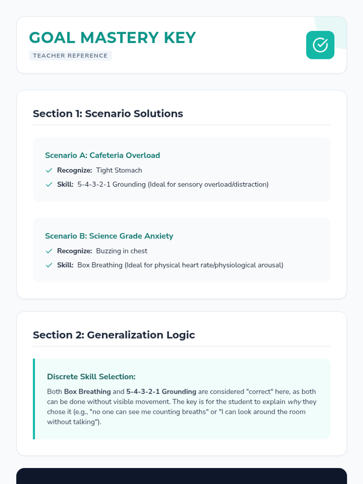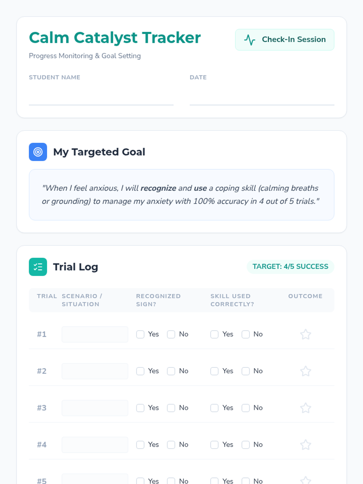 A targeted 15-minute check-in designed for middle schoolers to monitor progress on anxiety-related coping goals. The lesson focuses on identifying and practicing calming breaths and de-escalation techniques through scenario-based trials.
