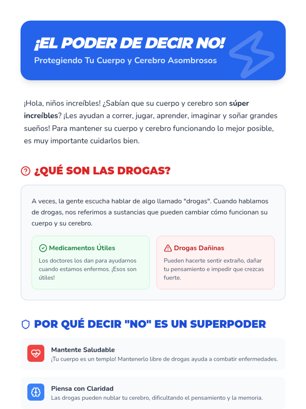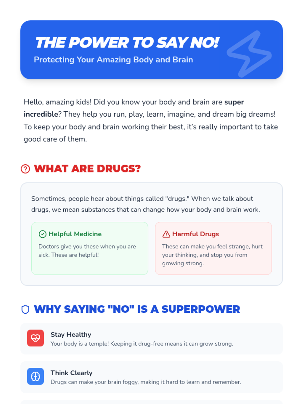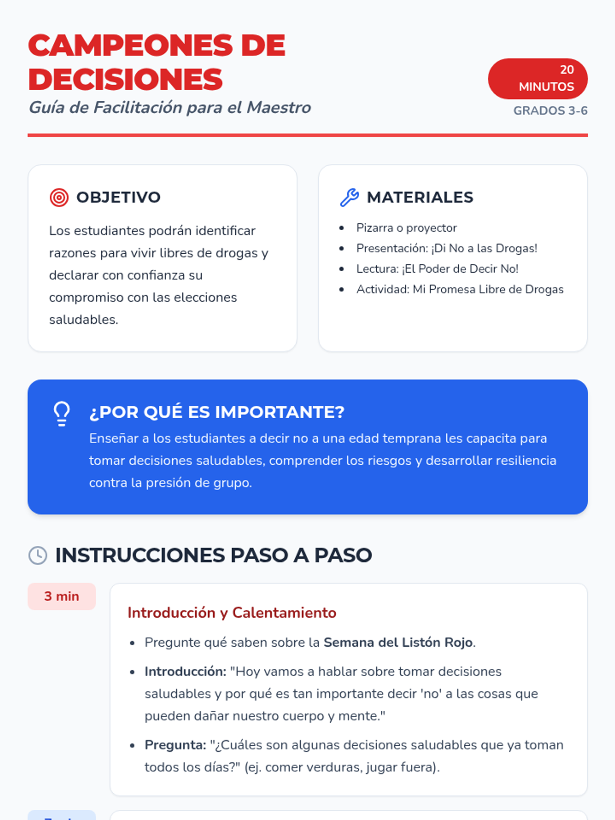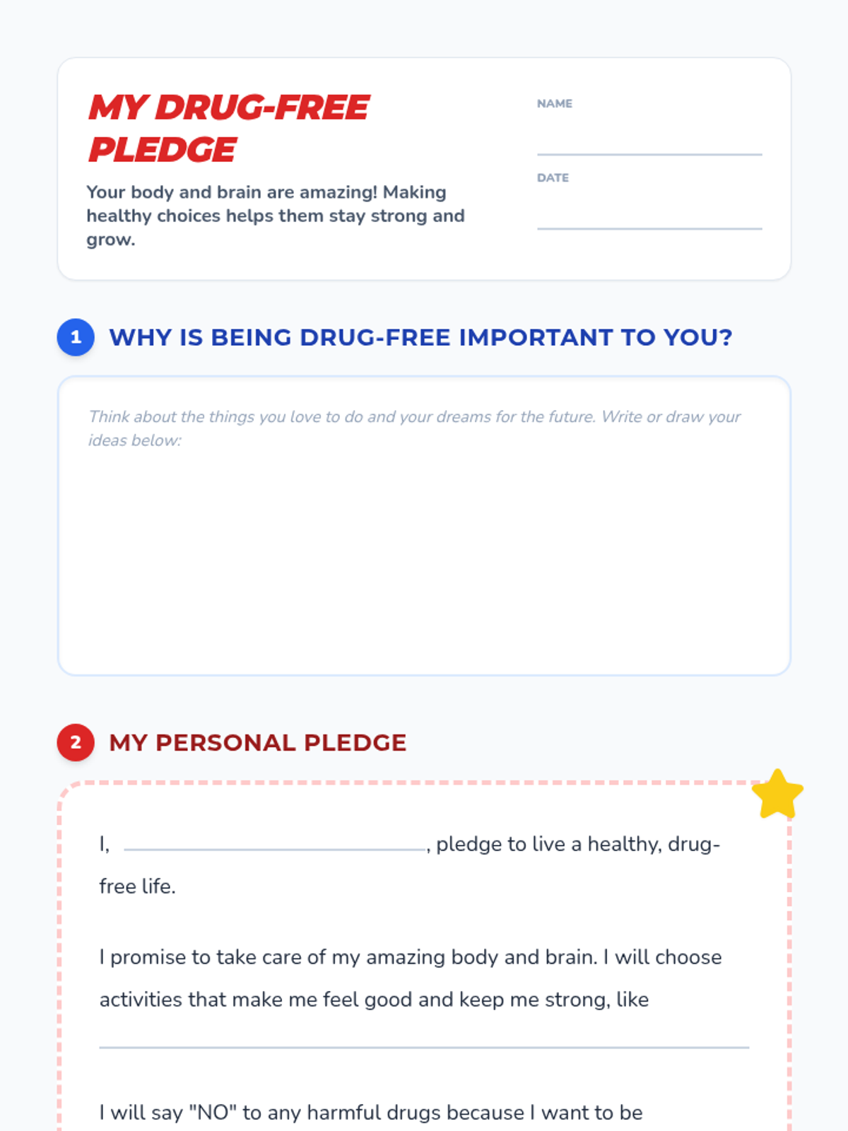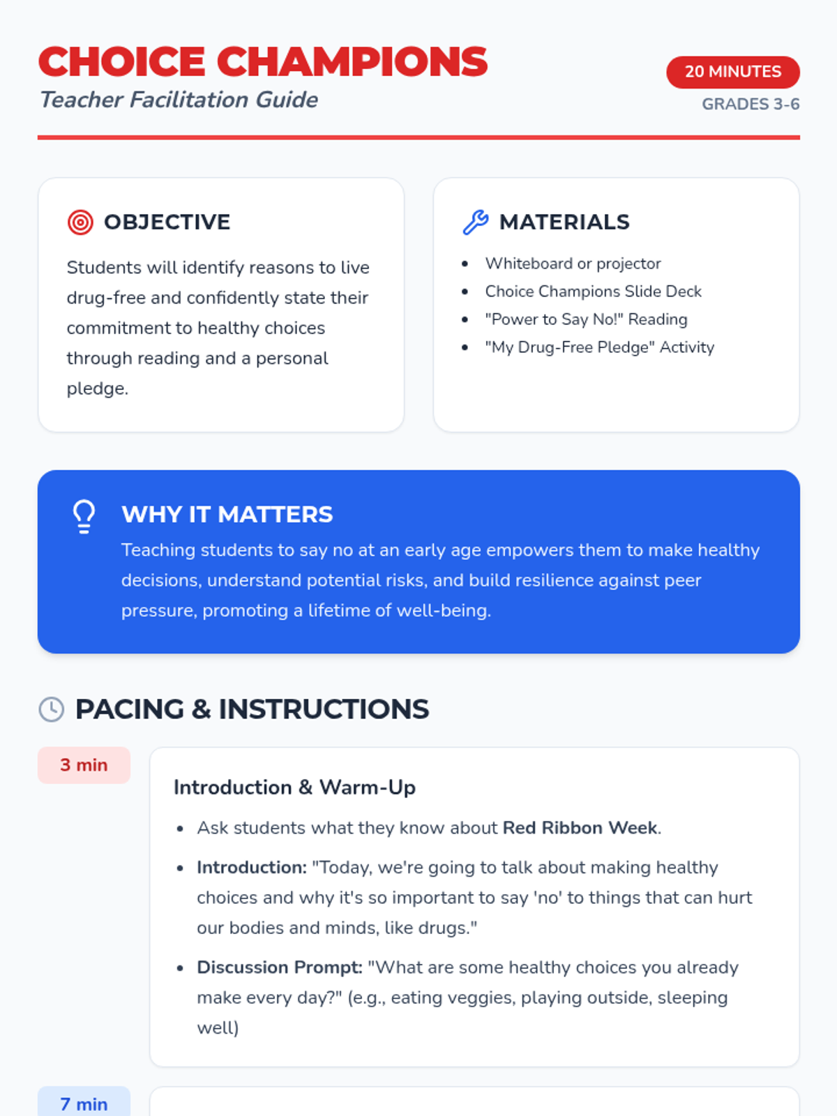 A quick, 20-minute session designed to empower students to make healthy choices and commit to a drug-free lifestyle through interactive discussion and personal pledges.