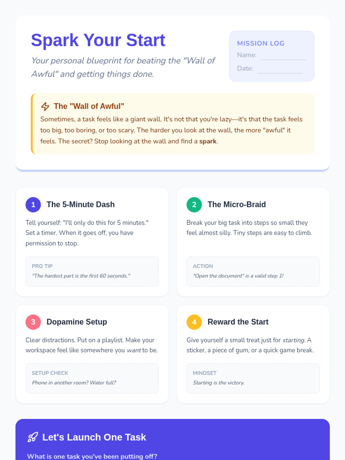 This lesson focuses on task initiation and overcoming procrastination for middle school students, providing concrete strategies to move from 'stuck' to 'started'.