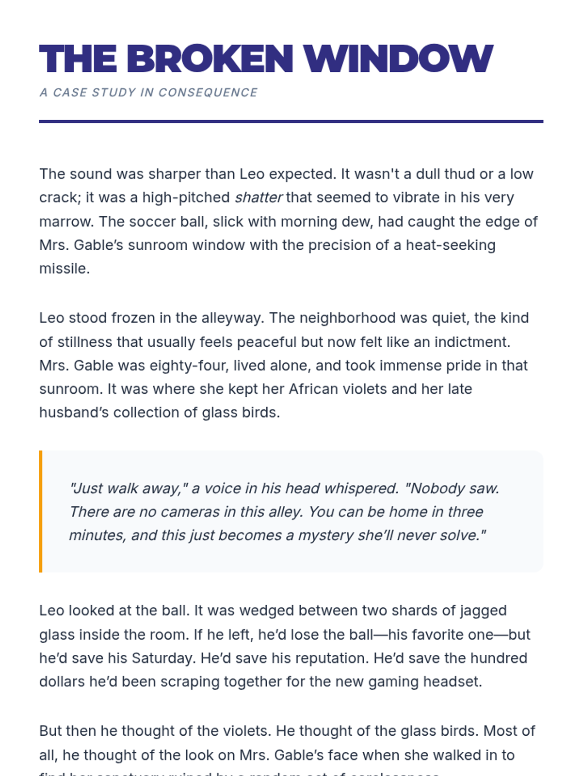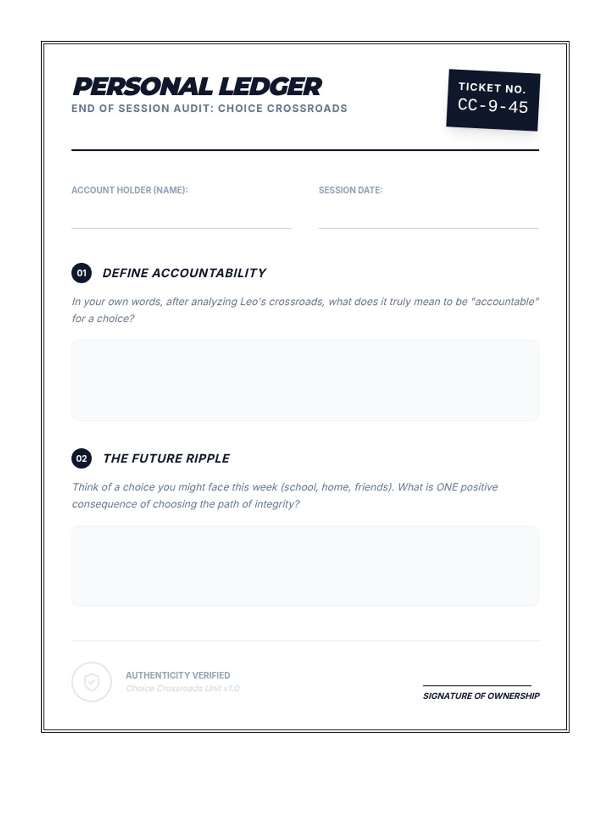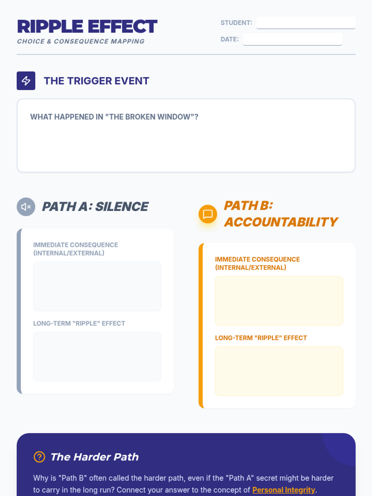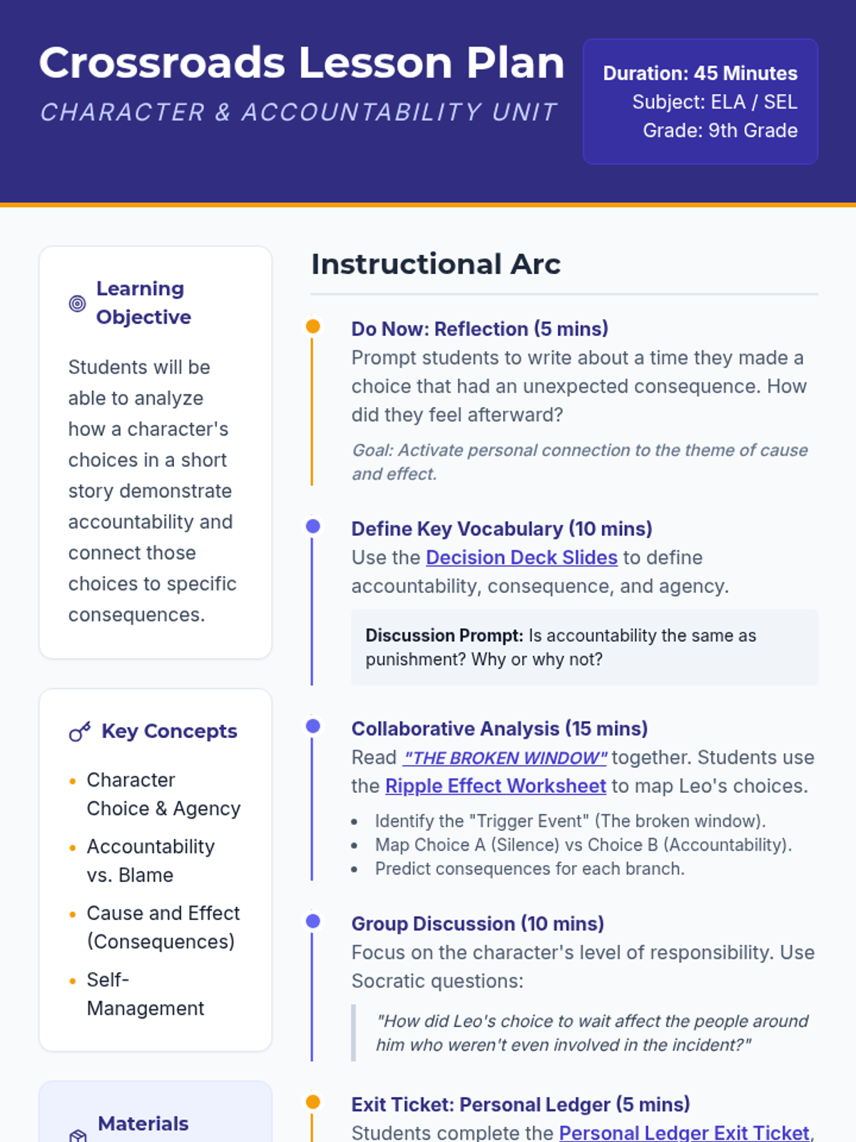 A 9th-grade ELA/SEL lesson where students analyze the relationship between character decisions, accountability, and resulting consequences through a short story analysis.
