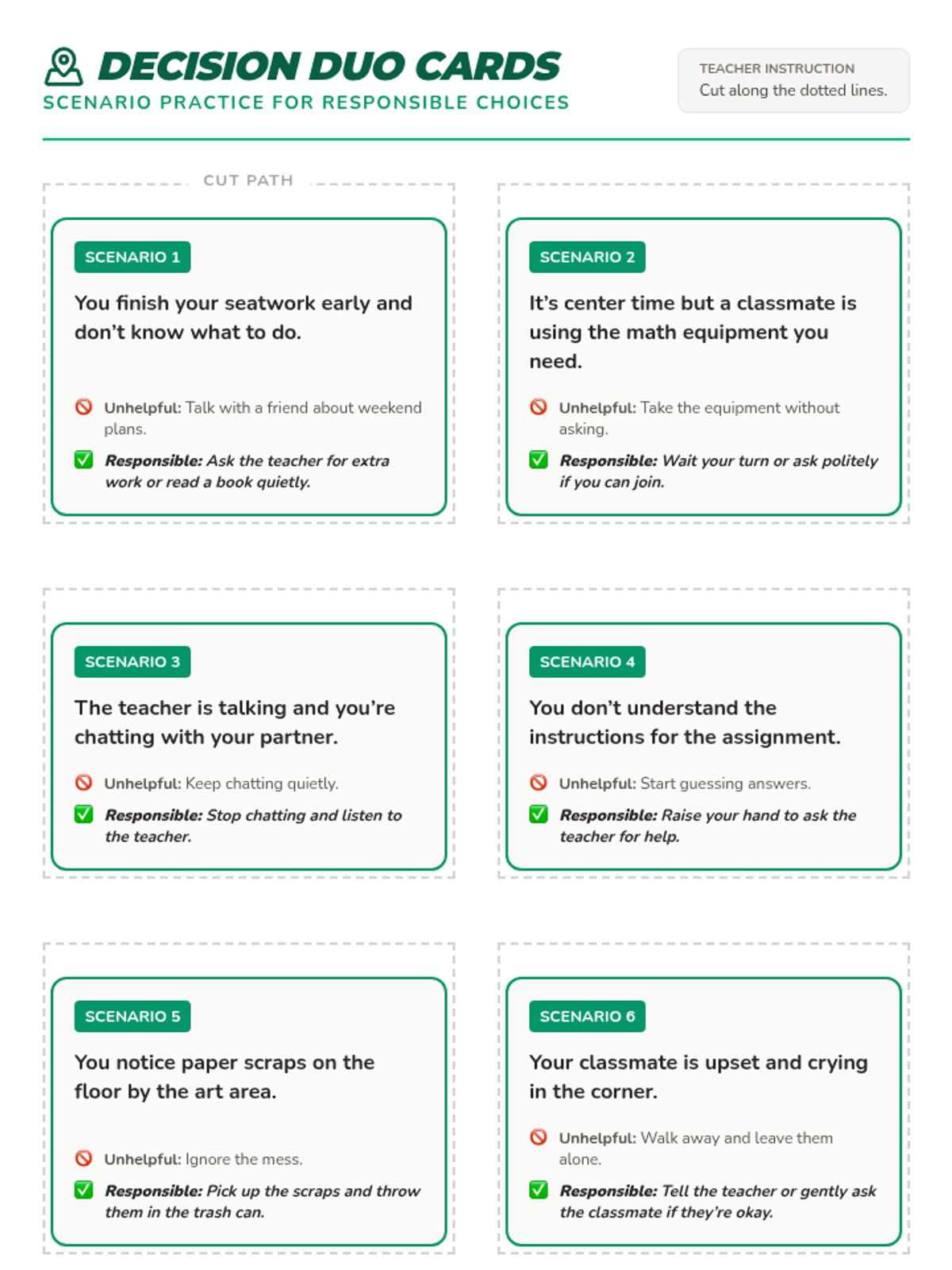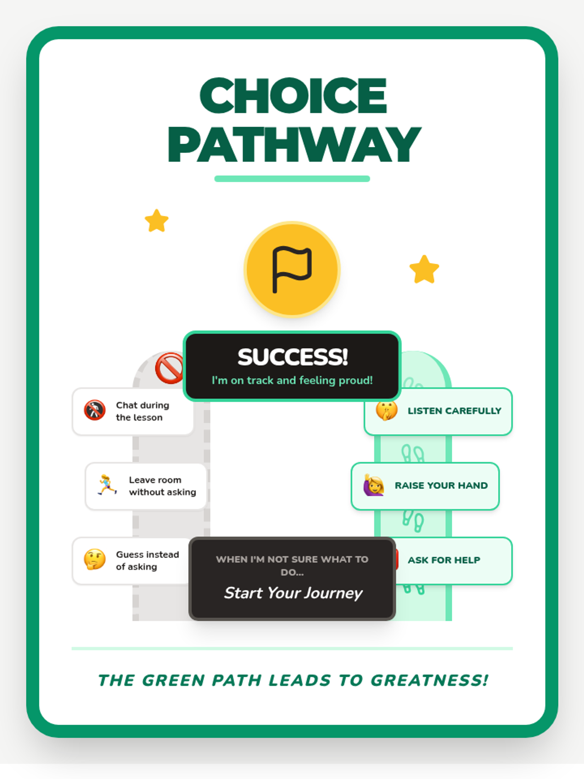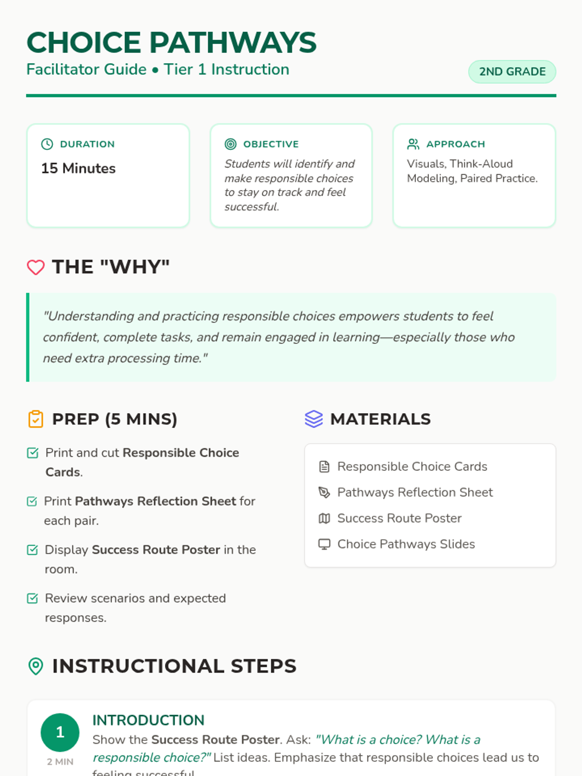 A 15-minute social-emotional learning lesson for 2nd graders that uses visual pathways and modeling to help students with slower processing identify and make responsible classroom choices.