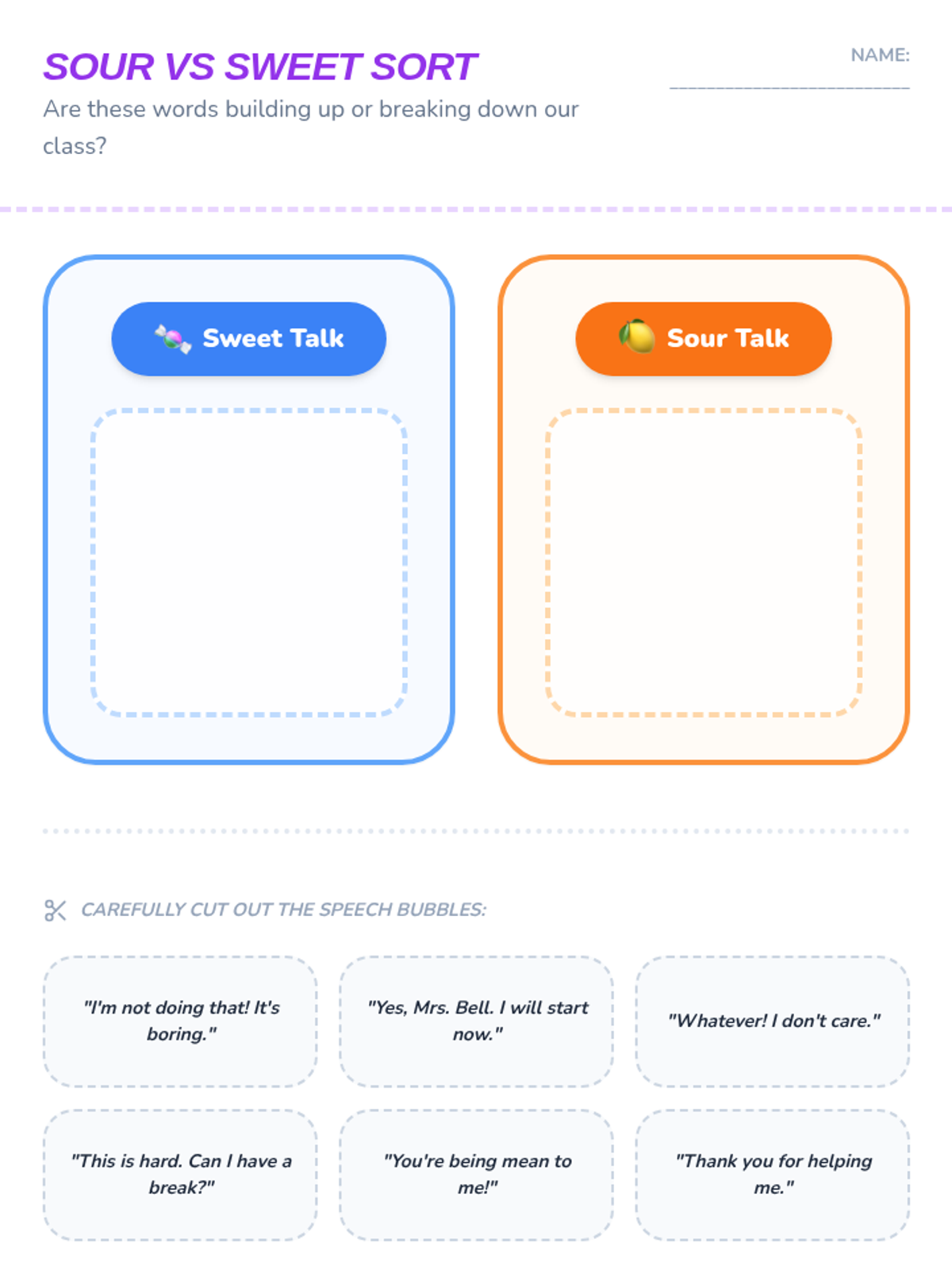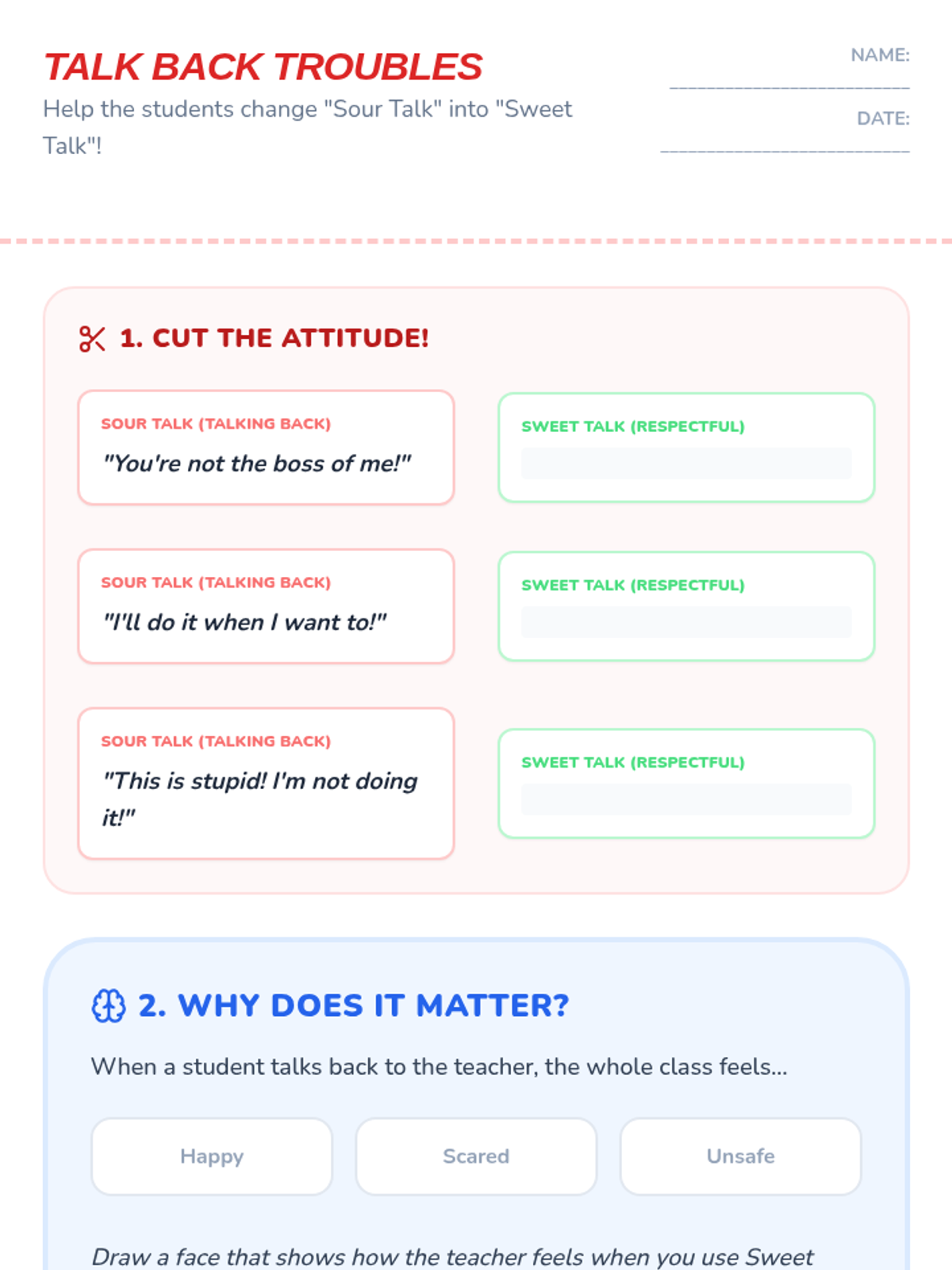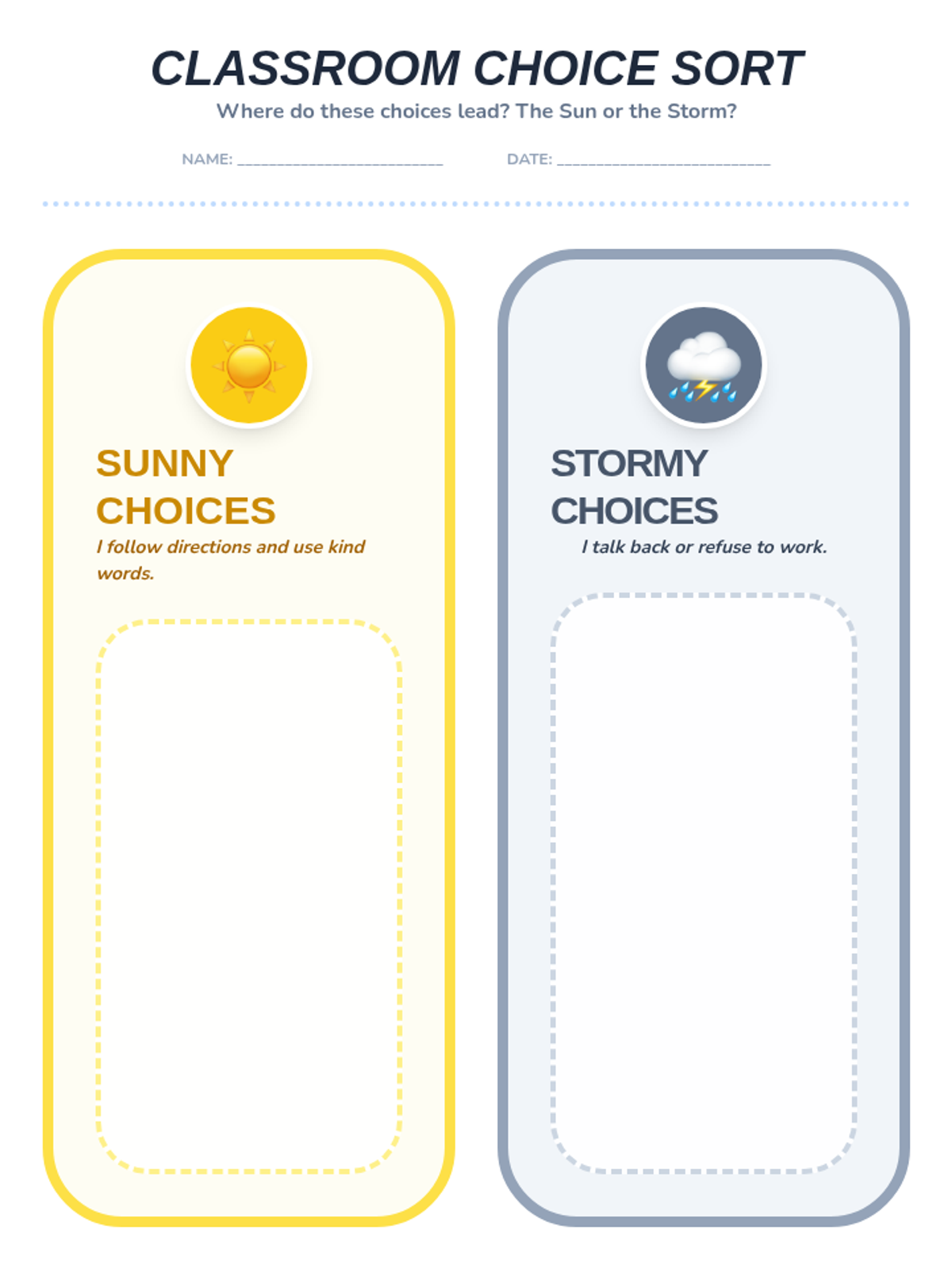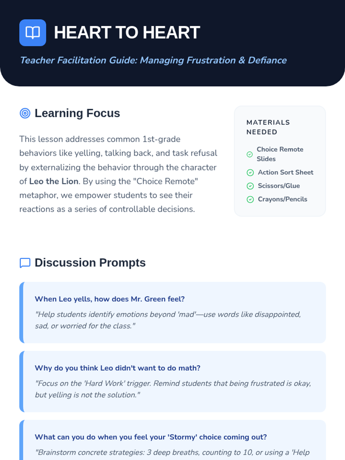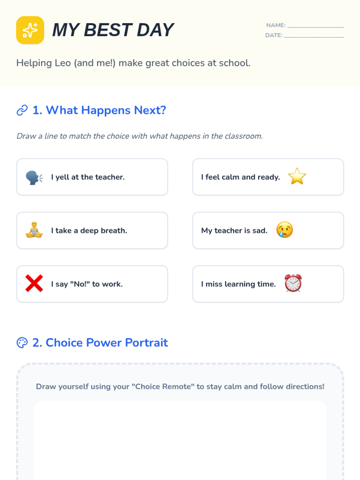 A social-emotional learning lesson designed for 1st-grade students to explore the impact of their choices on the classroom community. Through a choose-your-own-adventure story and interactive sorting activities, students learn to manage frustration, communicate respectfully with teachers, and understand the benefits of following directions.