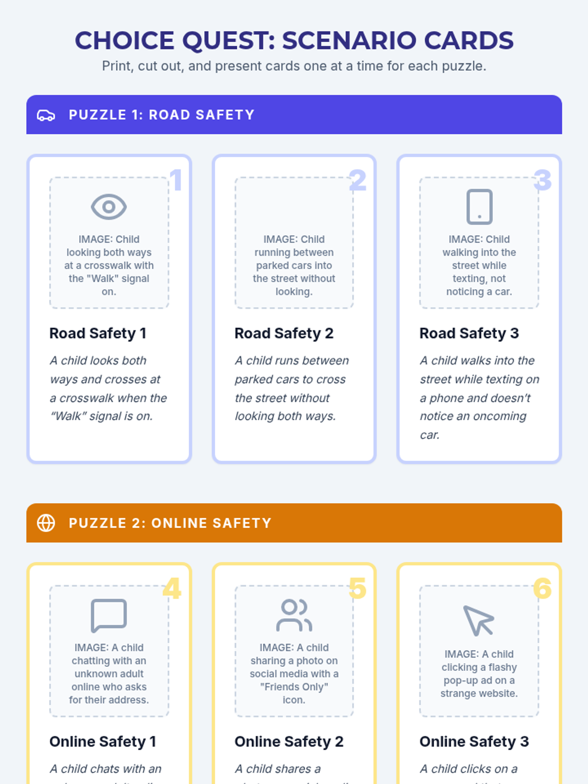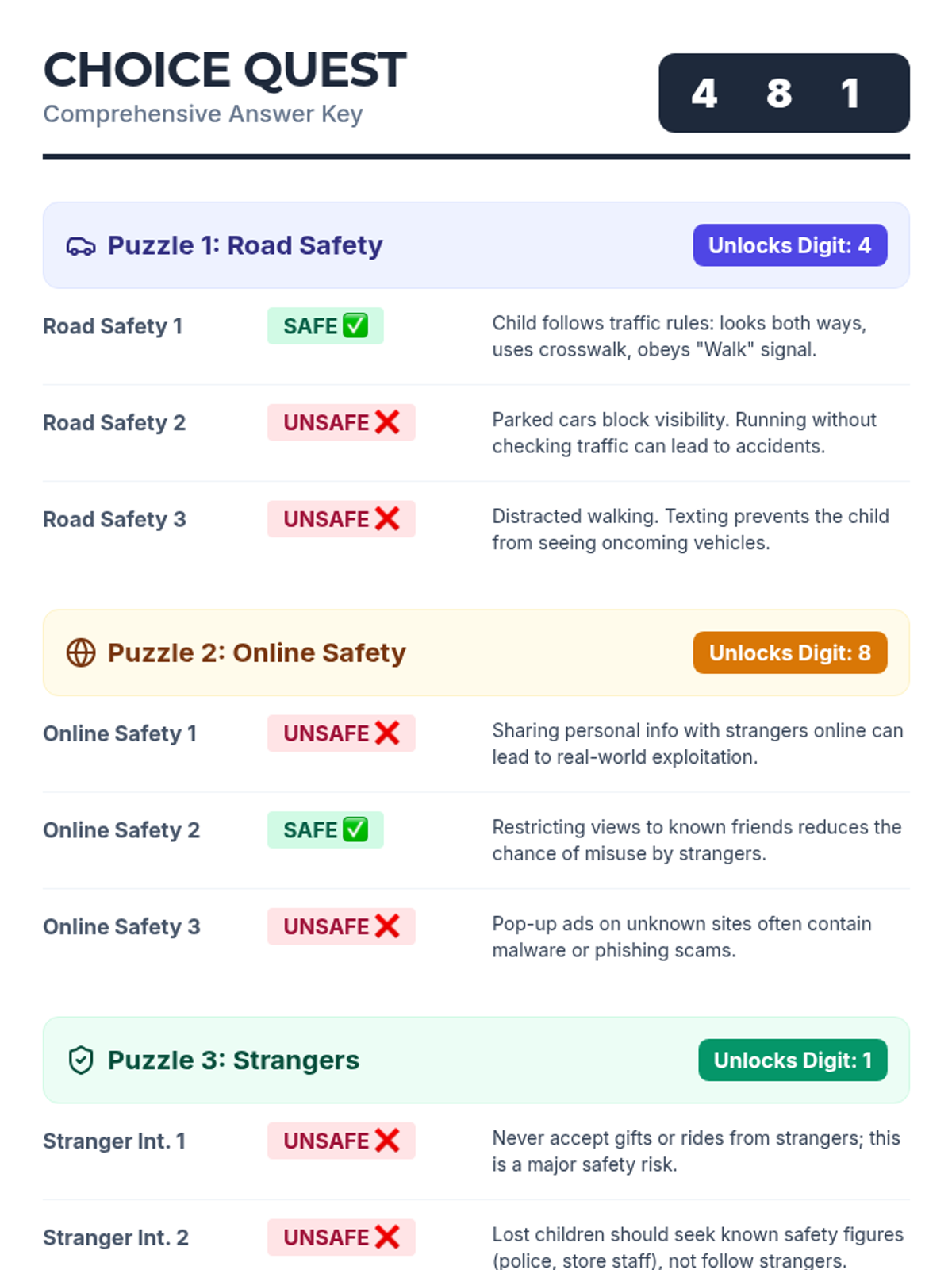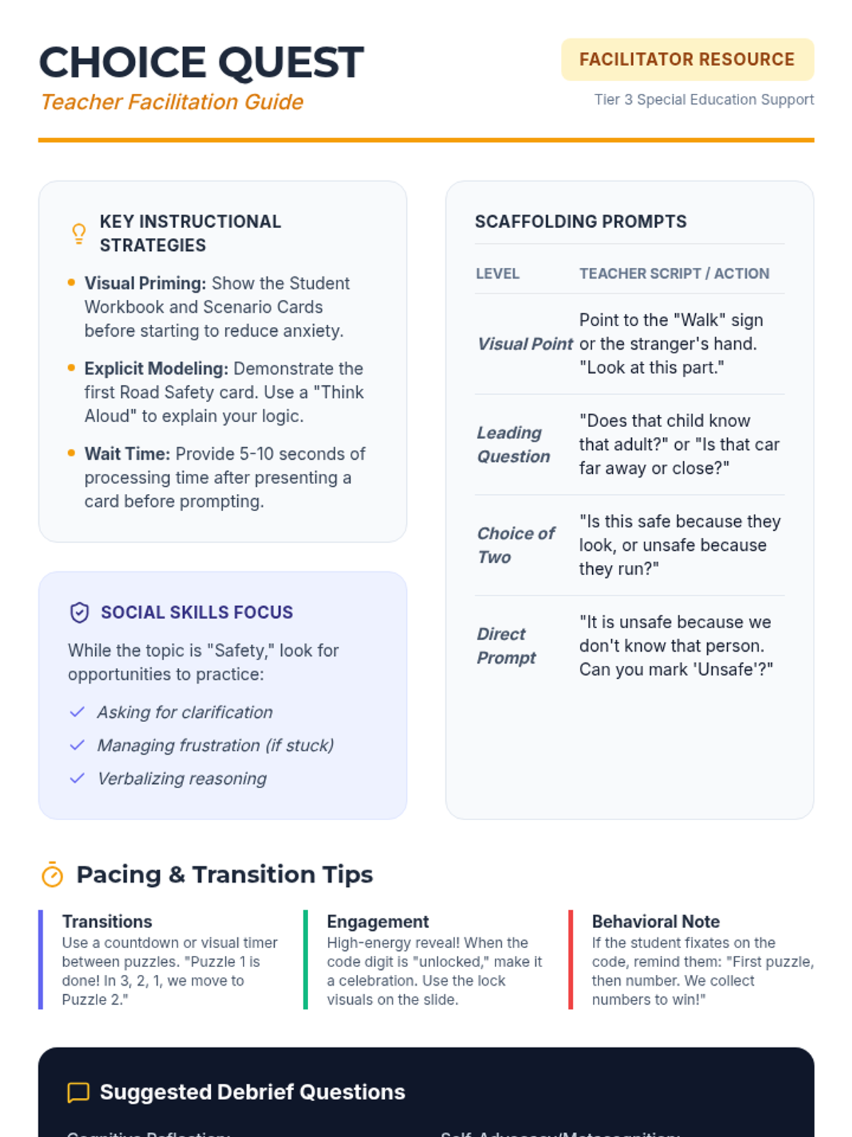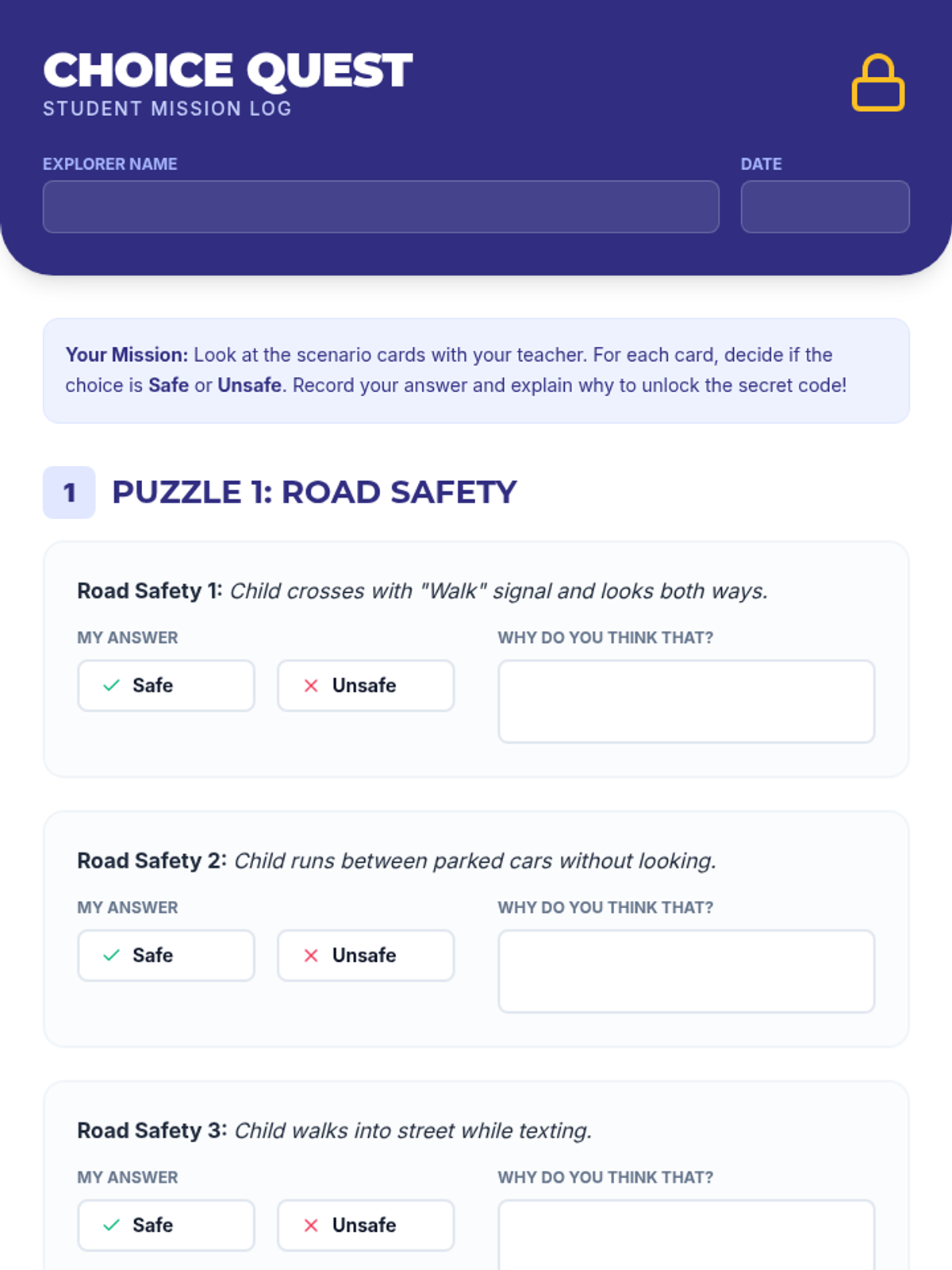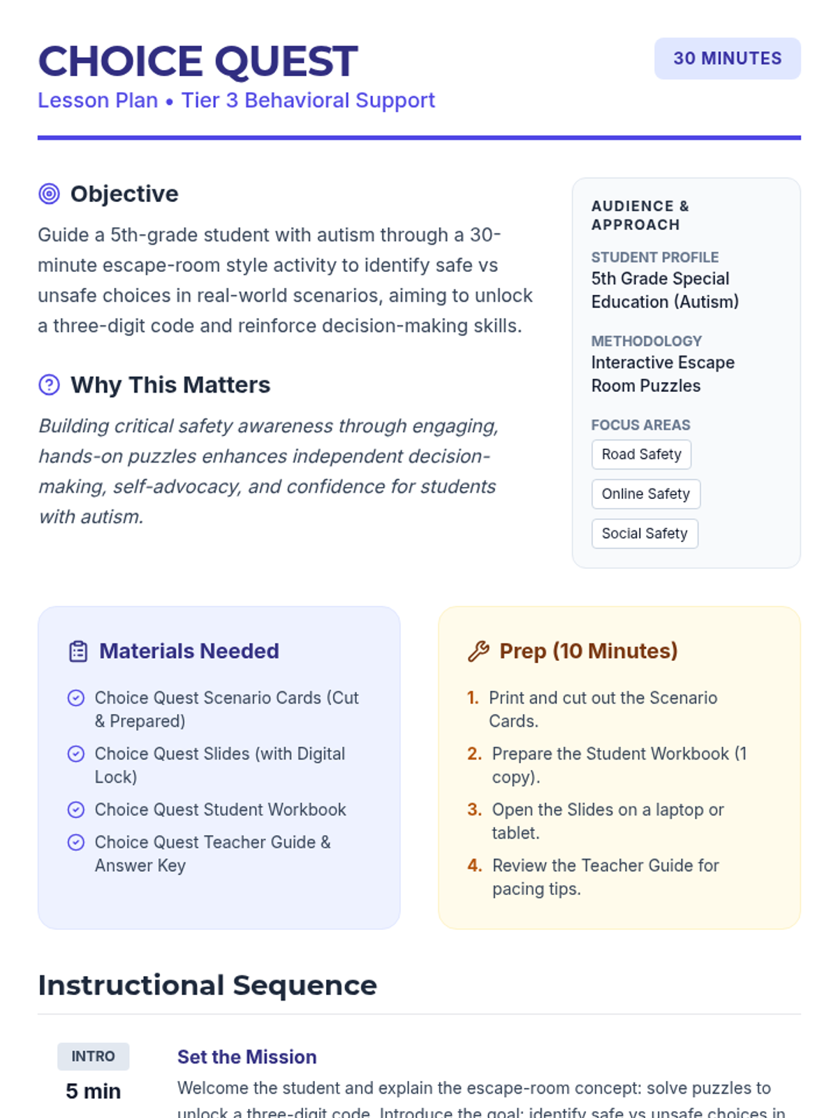 A 30-minute, Tier 3 escape-room style lesson for a 5th-grade student with autism to practice identifying safe versus unsafe choices in real-world scenarios.