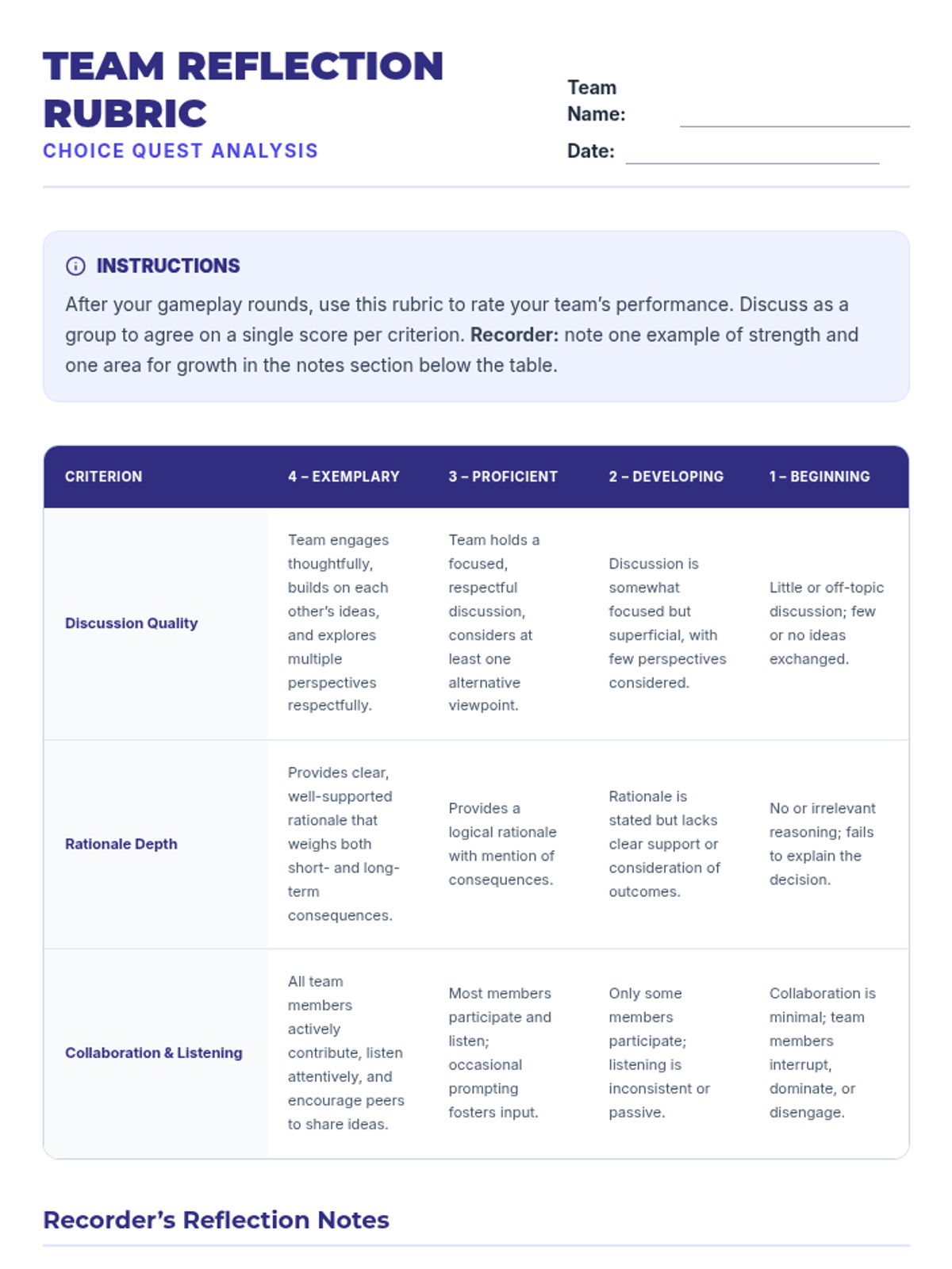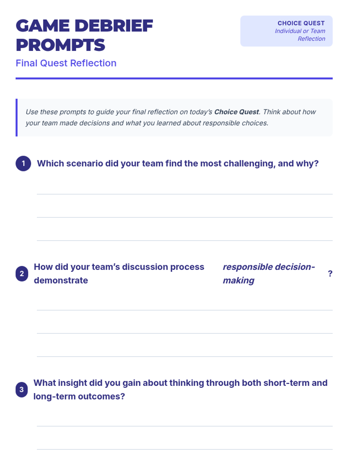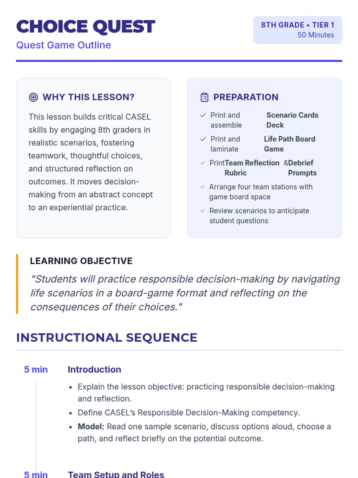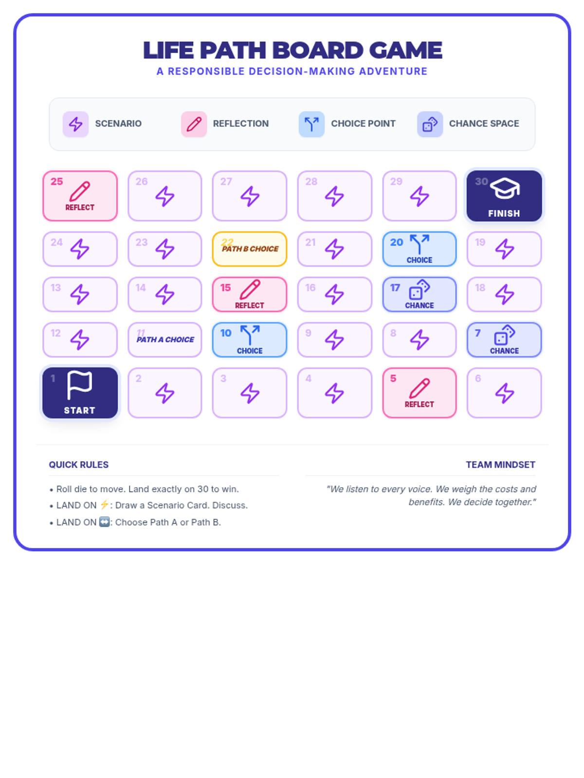 An 8th-grade Tier 1 lesson focused on CASEL's responsible decision-making through a collaborative board-game experience. Students navigate life scenarios, weigh consequences, and reflect on their group's decision-making process.