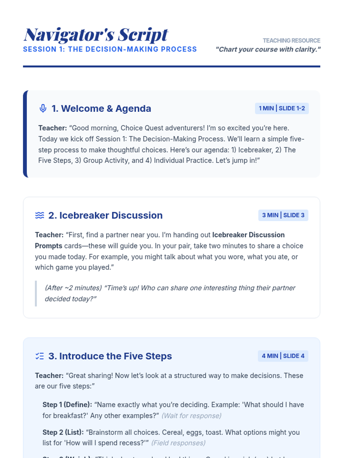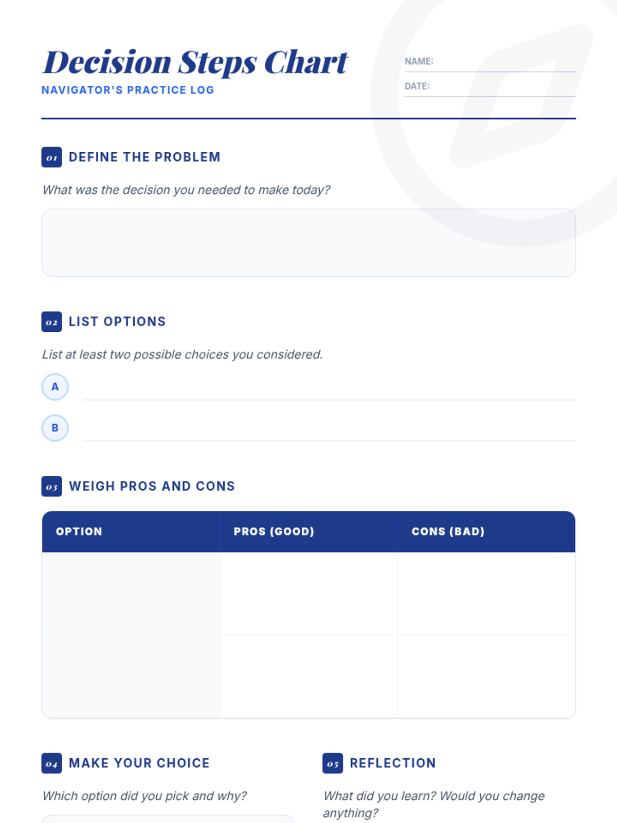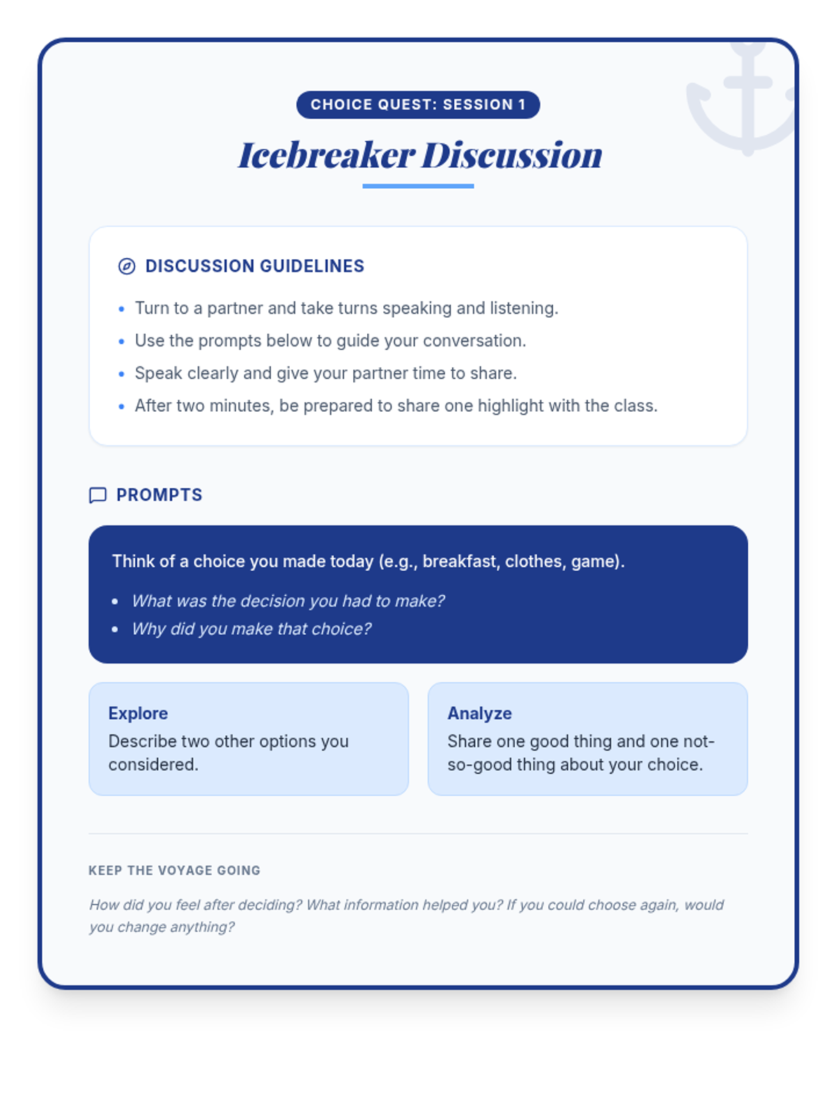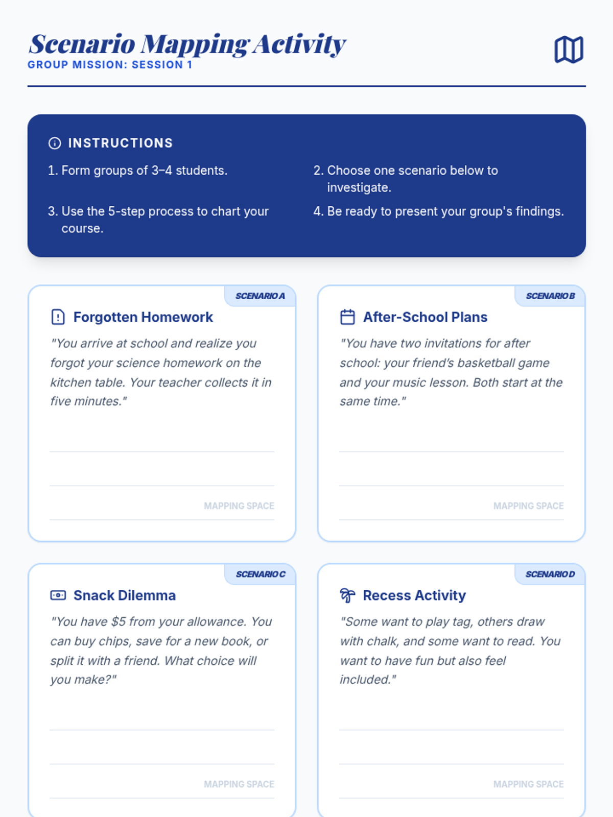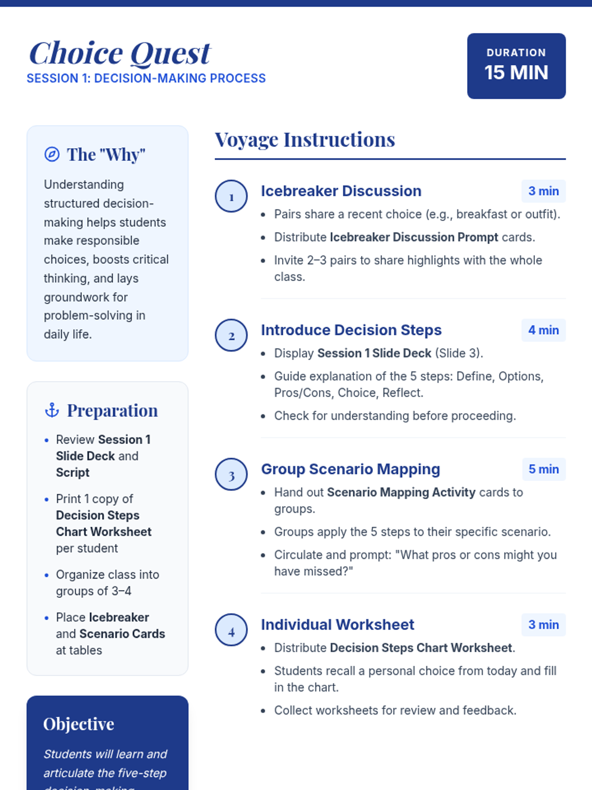 Students learn and apply a five-step decision-making process to real-world scenarios through group activities and individual practice.
