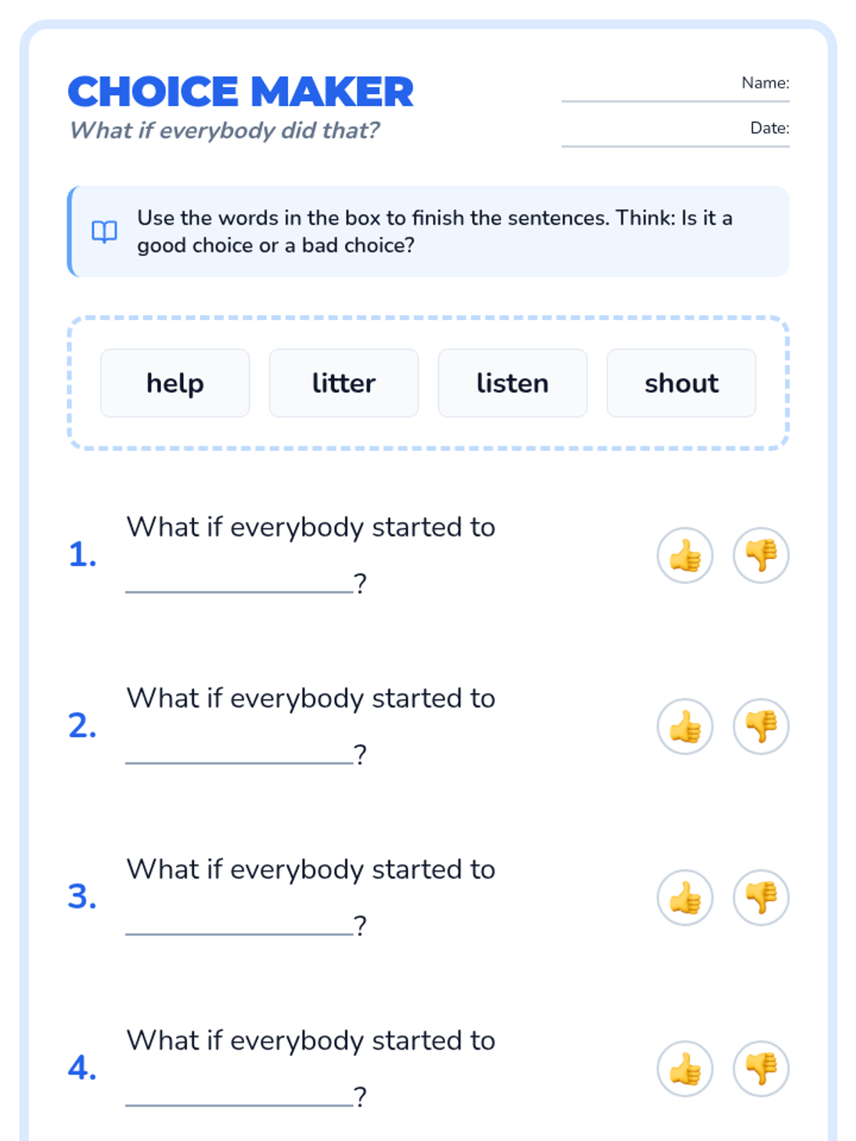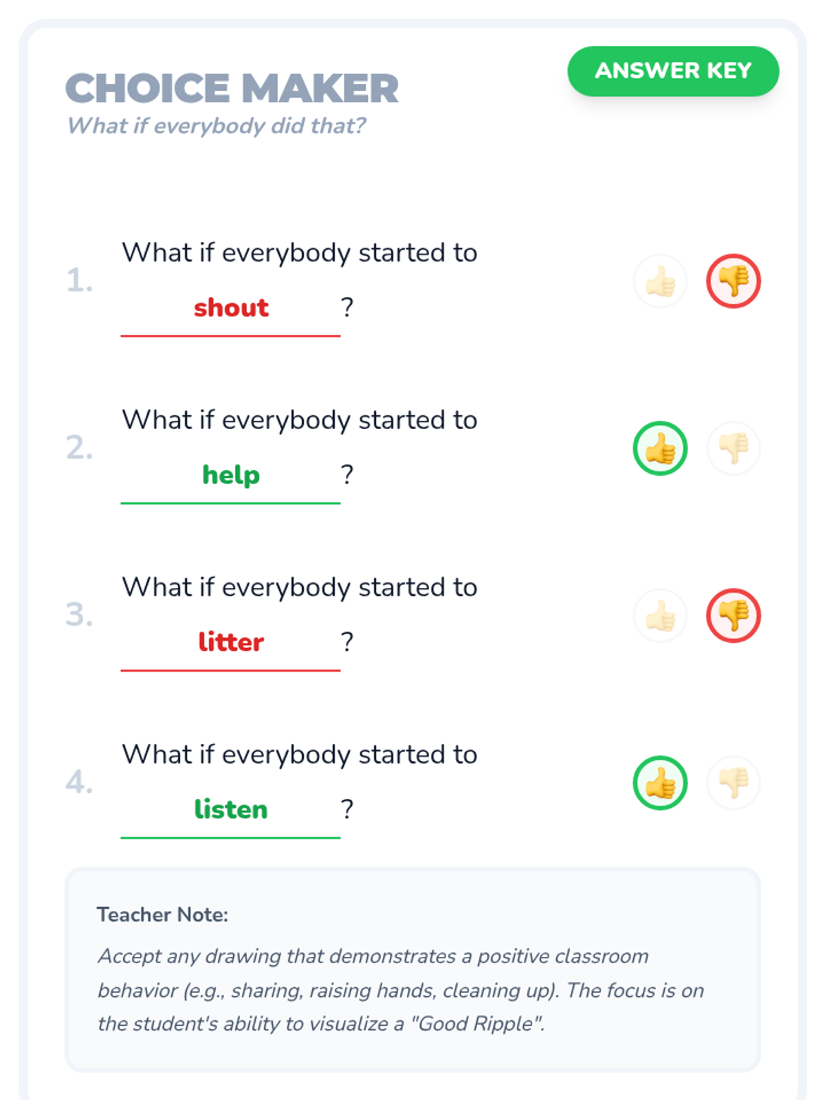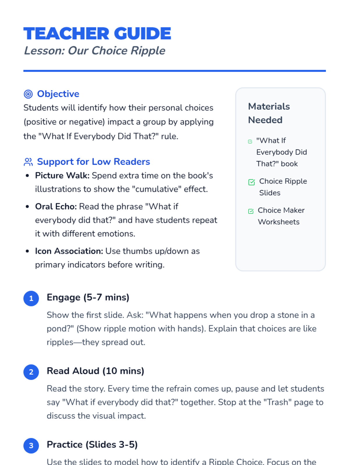 A social-emotional learning lesson for 2nd-grade low readers based on the book 'What If Everybody Did That?', focusing on how individual actions impact the community.