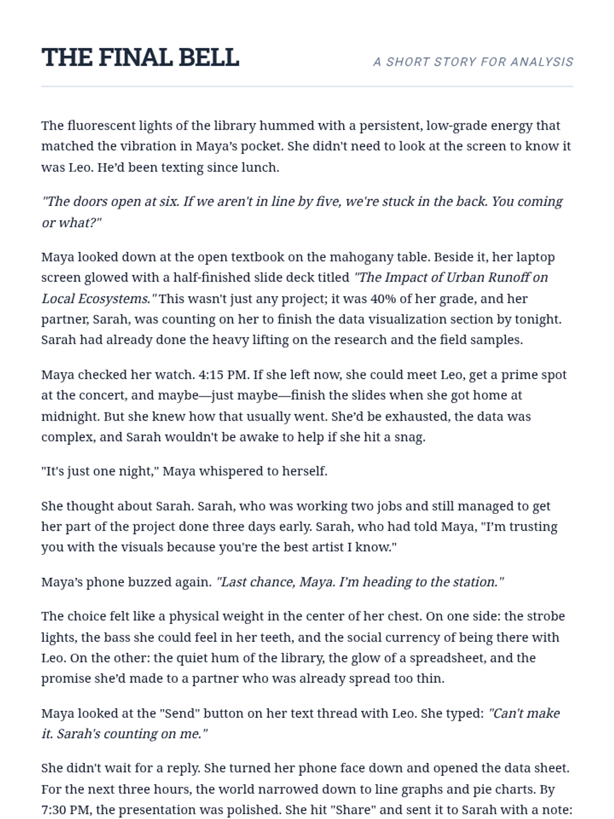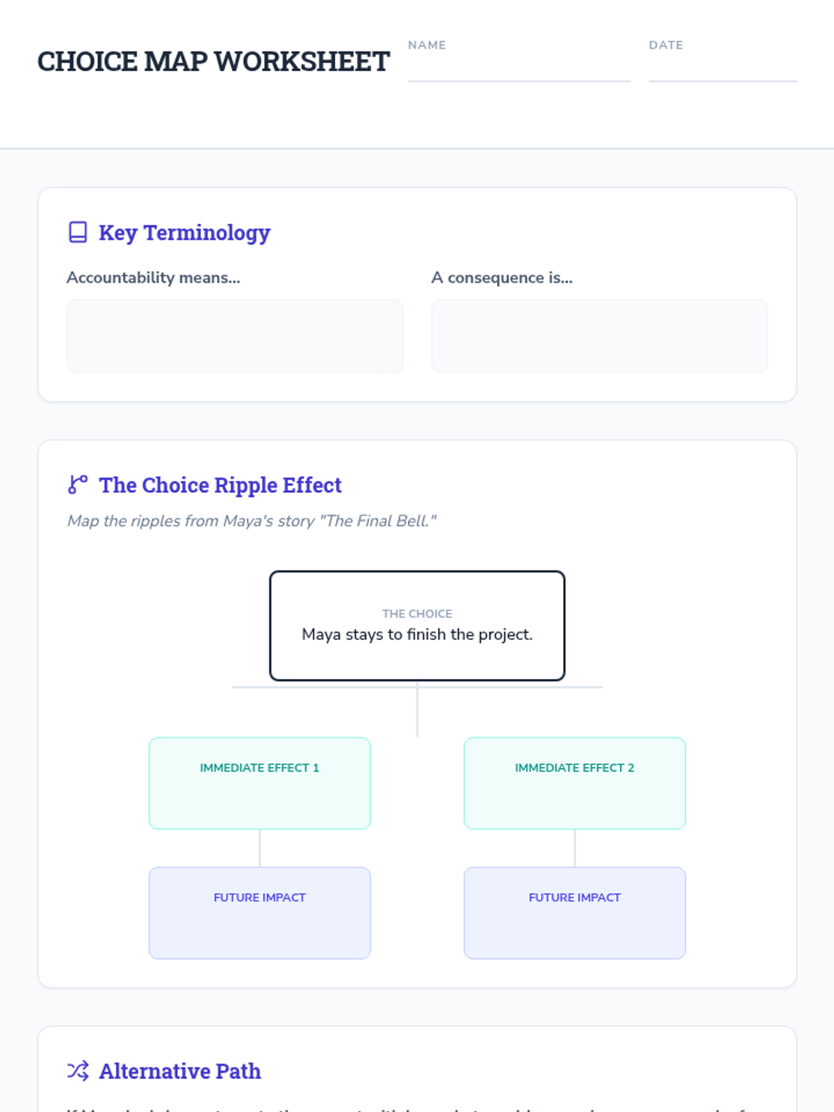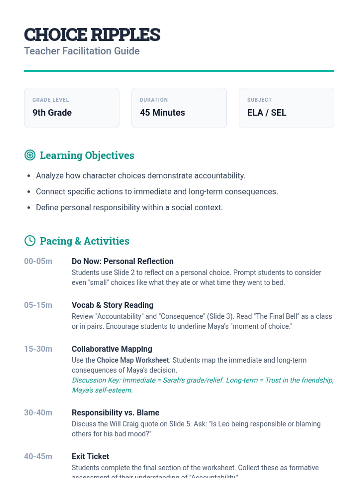 A 9th-grade English and SEL lesson exploring the connection between character choices, accountability, and consequences through short story analysis.
