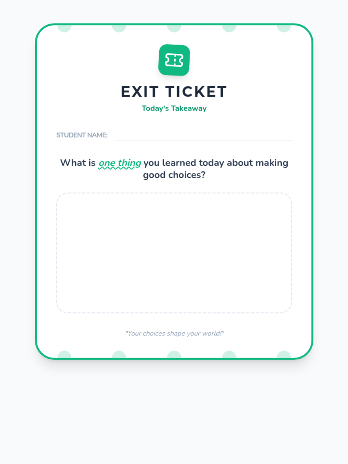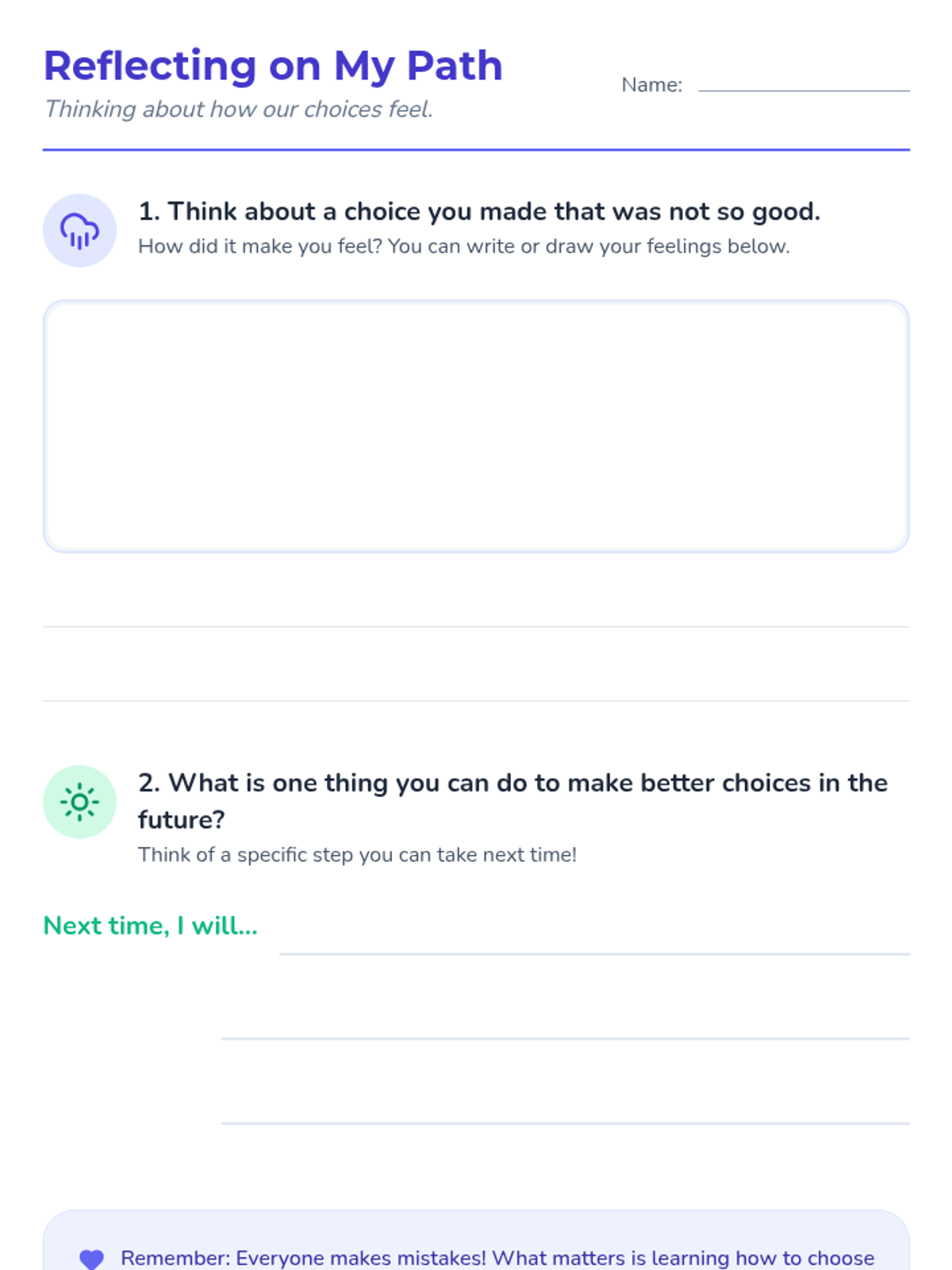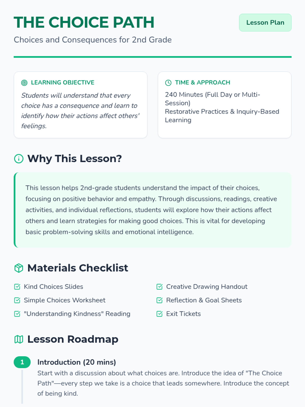 A comprehensive lesson for 2nd graders to understand the impact of their choices through the 'Choice Path' framework, focusing on empathy, kindness, and personal responsibility.