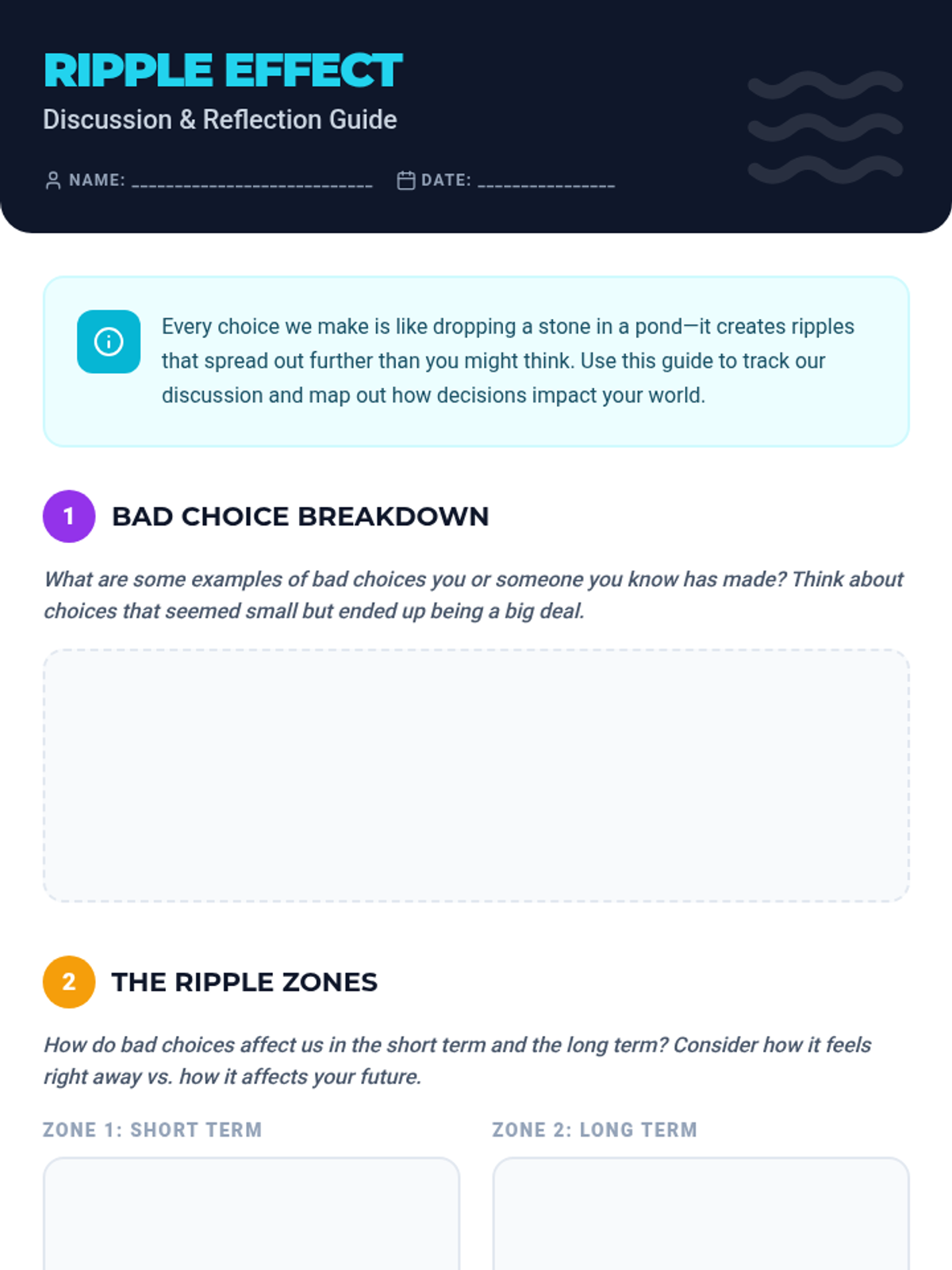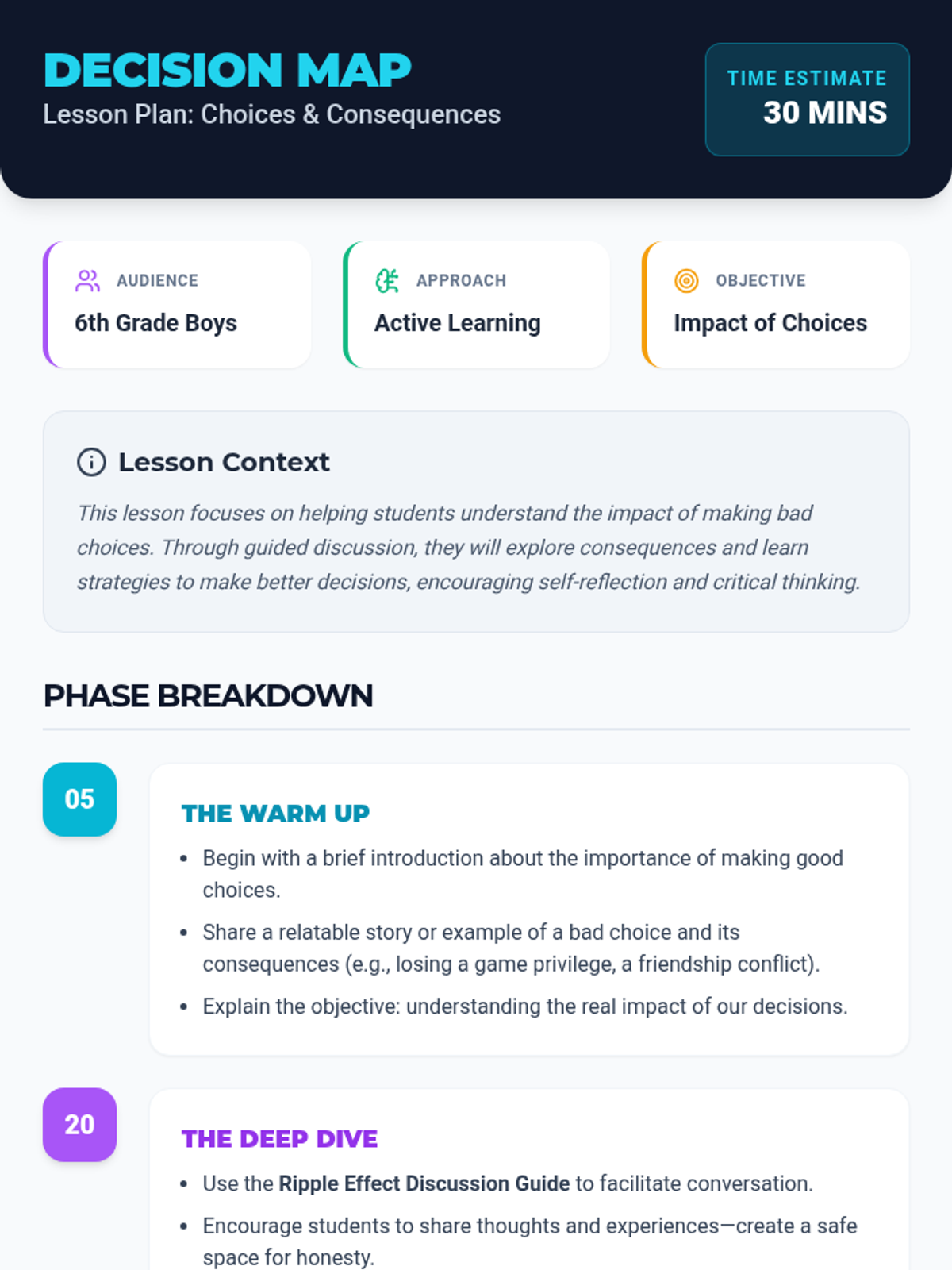 A lesson designed for 6th-grade boys to explore the impact of their choices, understand consequences, and develop strategies for responsible decision-making using a trauma-informed, active learning approach.