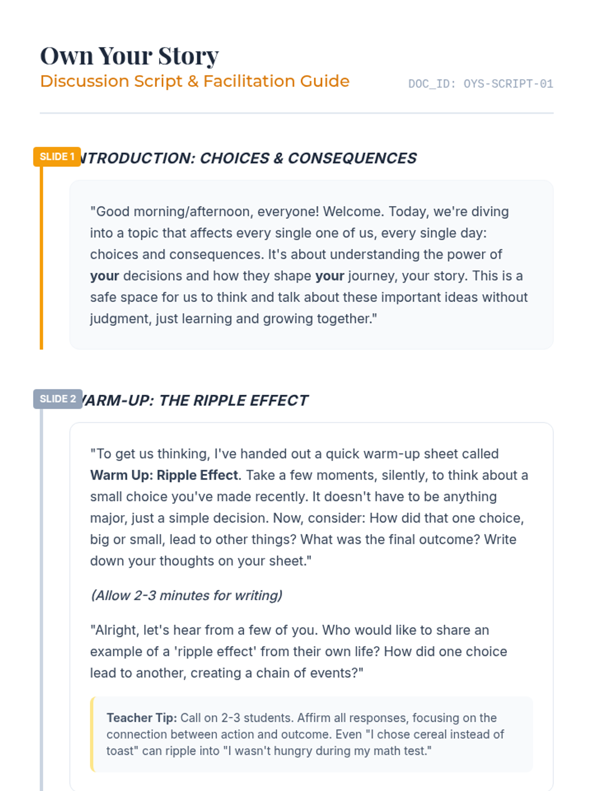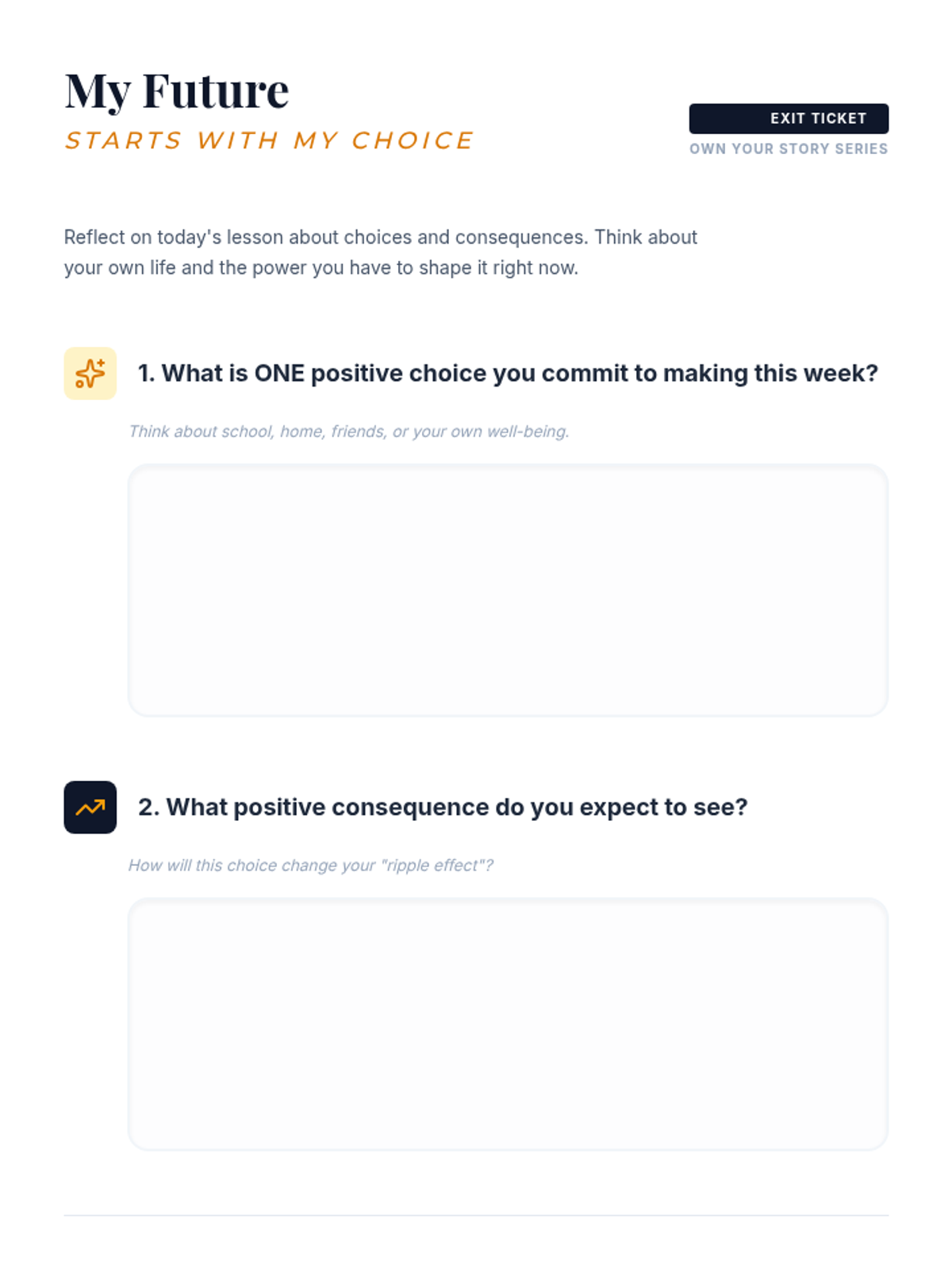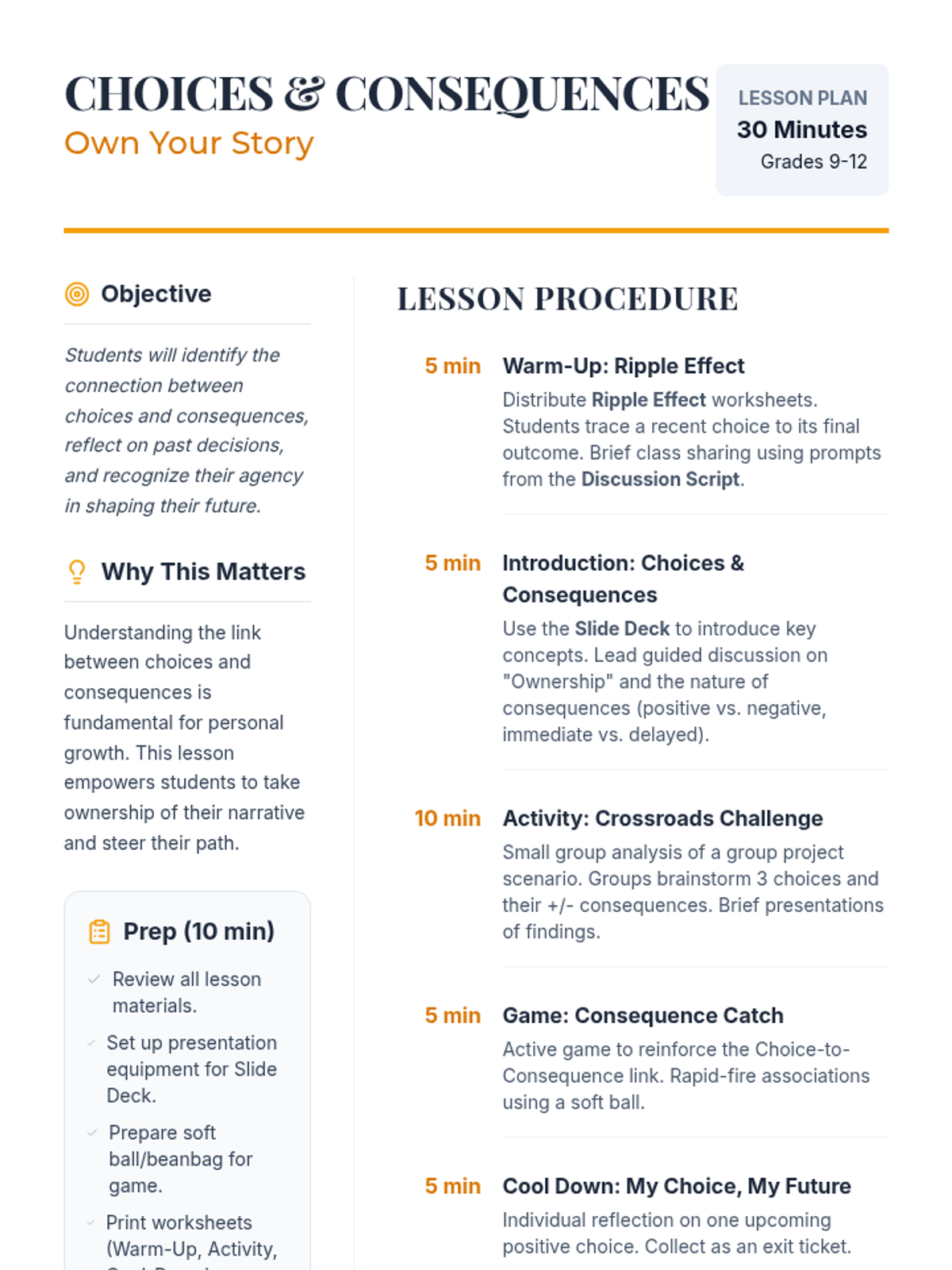 A 30-minute high school lesson focused on the relationship between personal choices and their consequences, empowering students to take ownership of their life narratives.