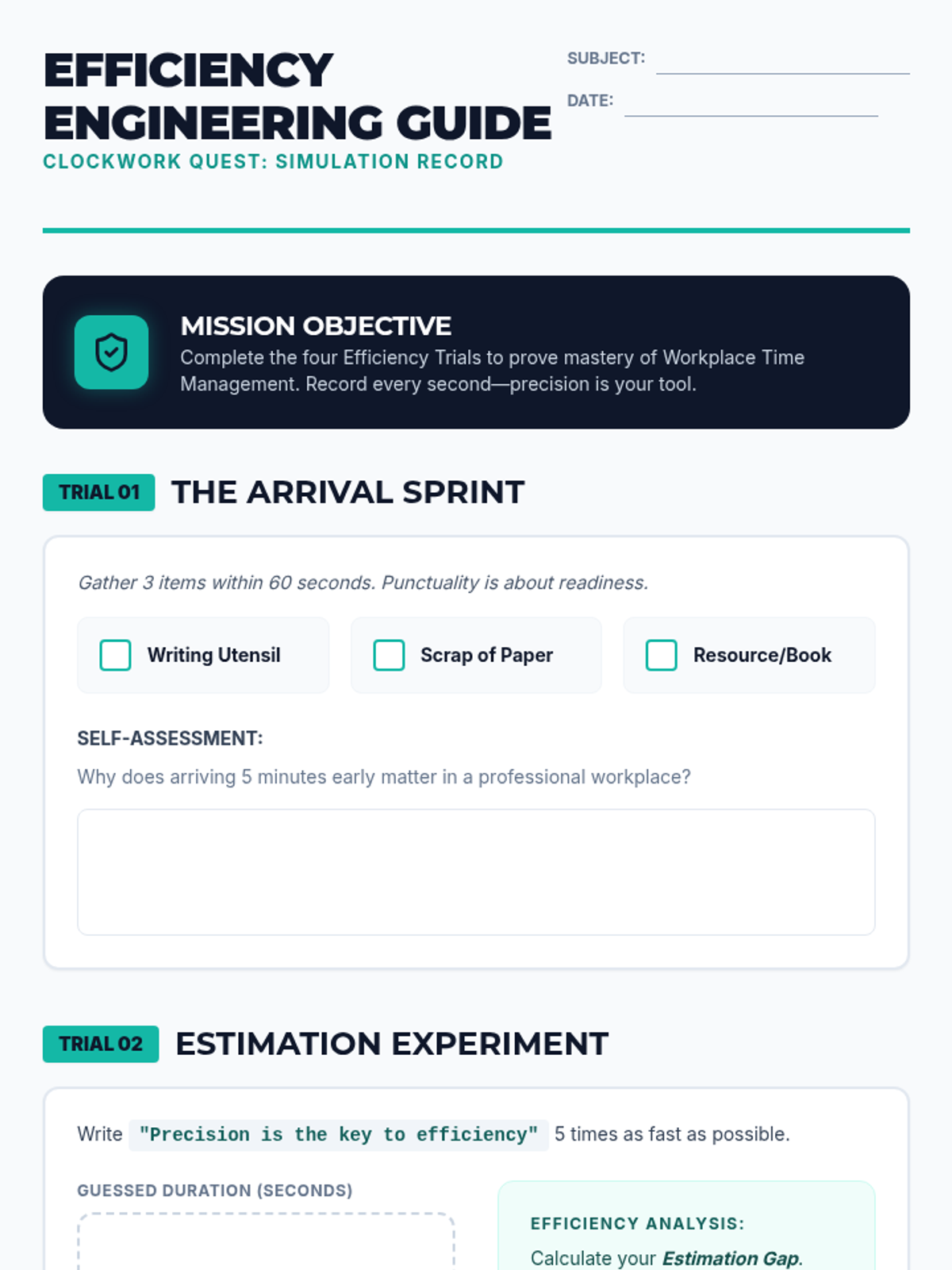 A lesson focused on mastering time management through hands-on 'trials' that teach punctuality, task estimation, scheduling, and focus techniques.