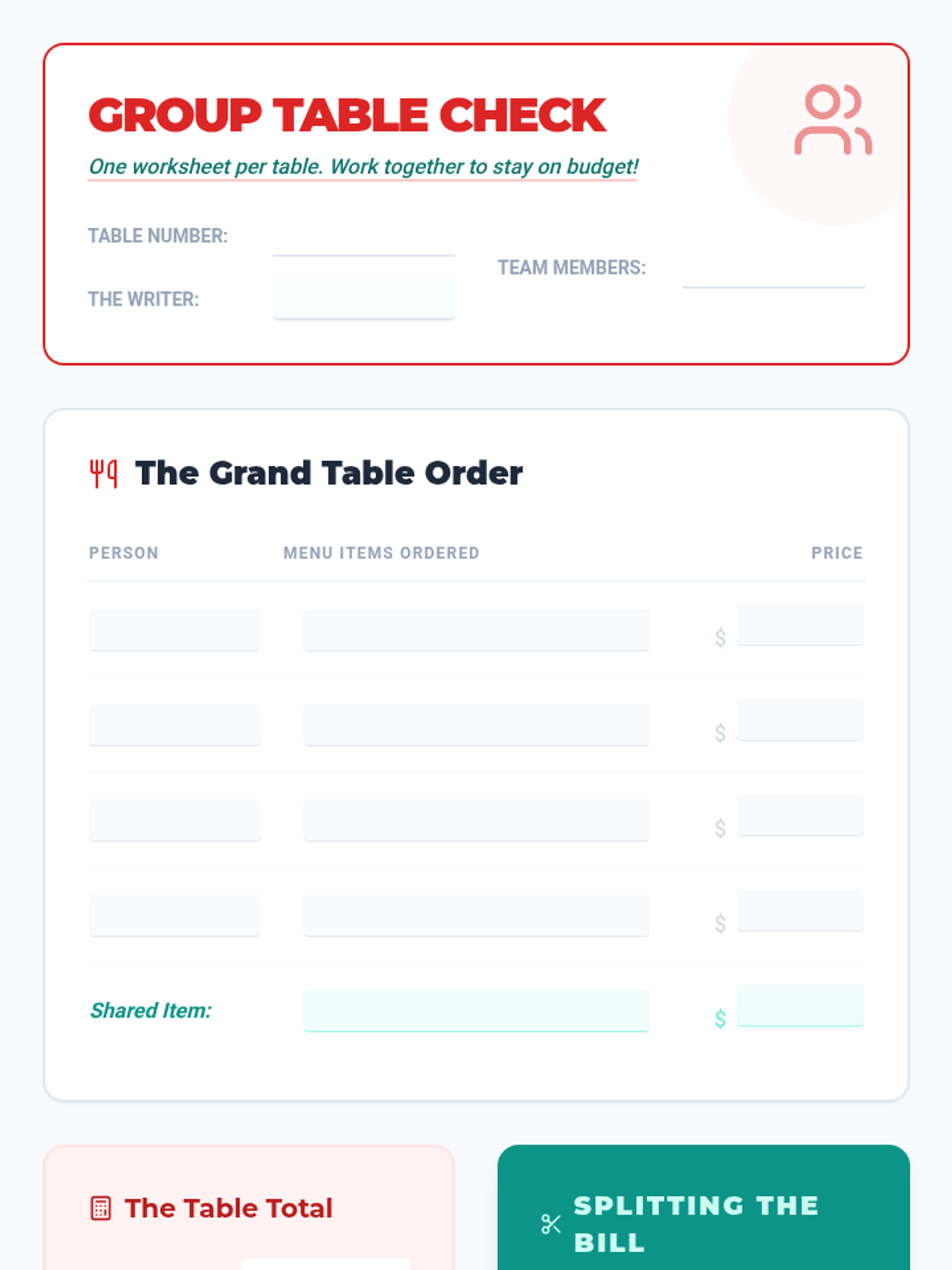 A functional skills lesson focused on navigating a restaurant experience on a budget, covering menu reading, budget planning, social etiquette, and group check splitting.