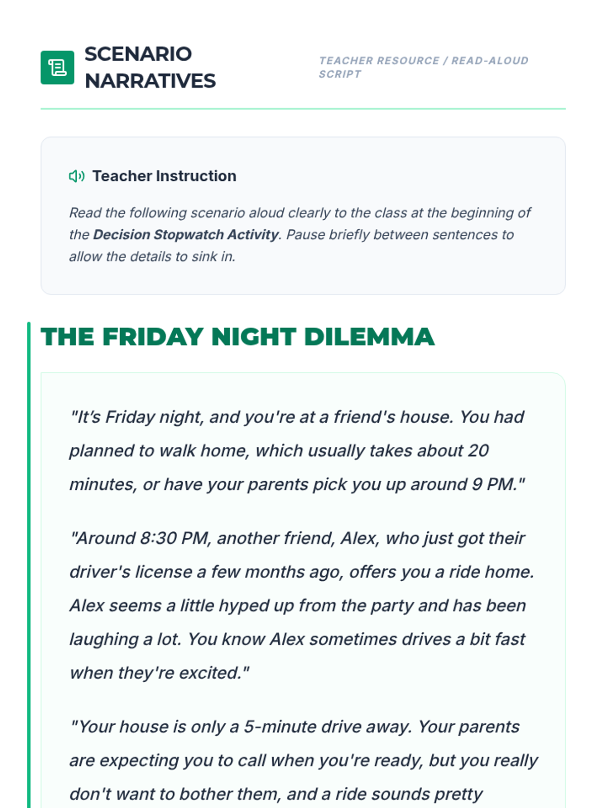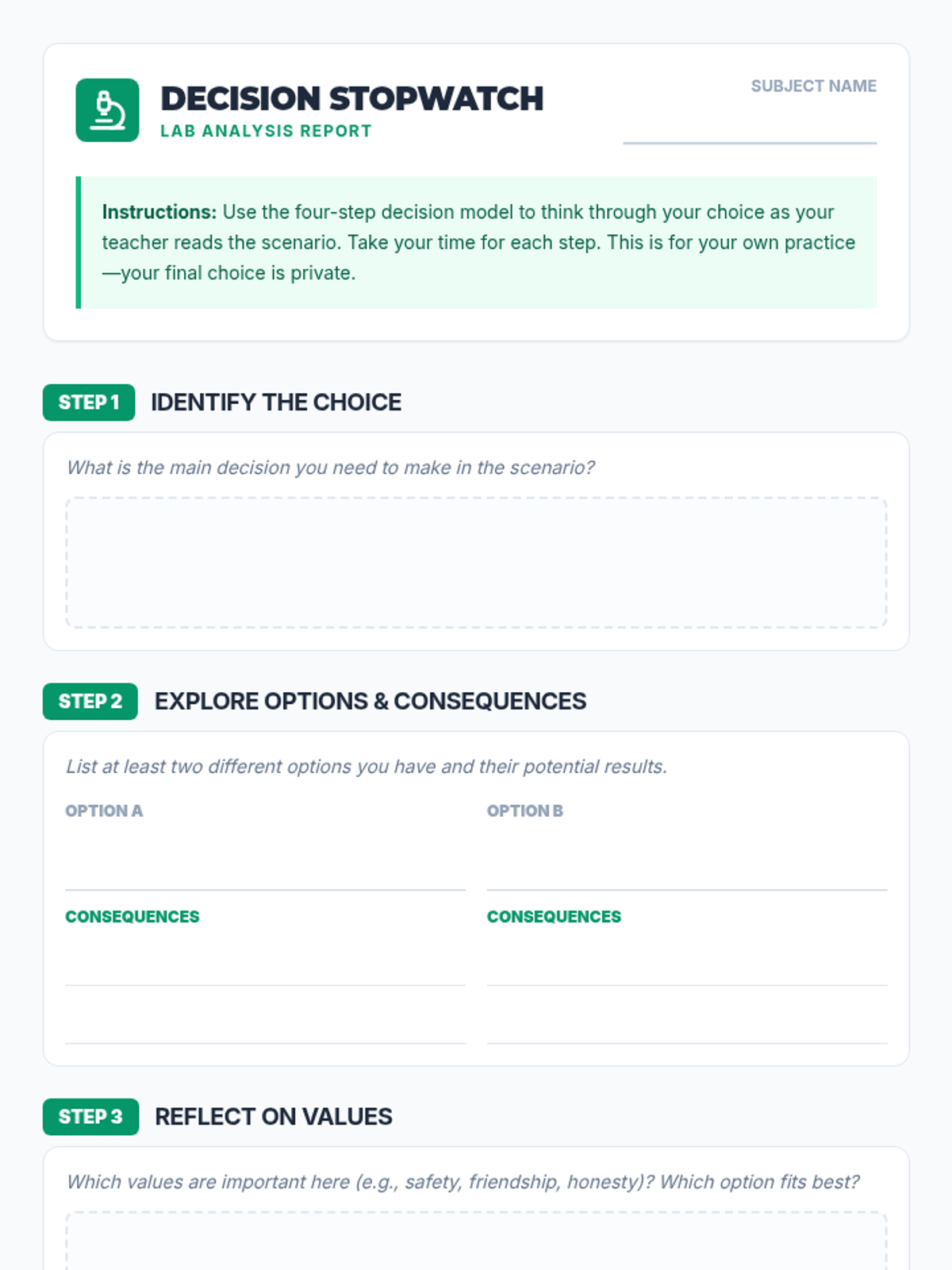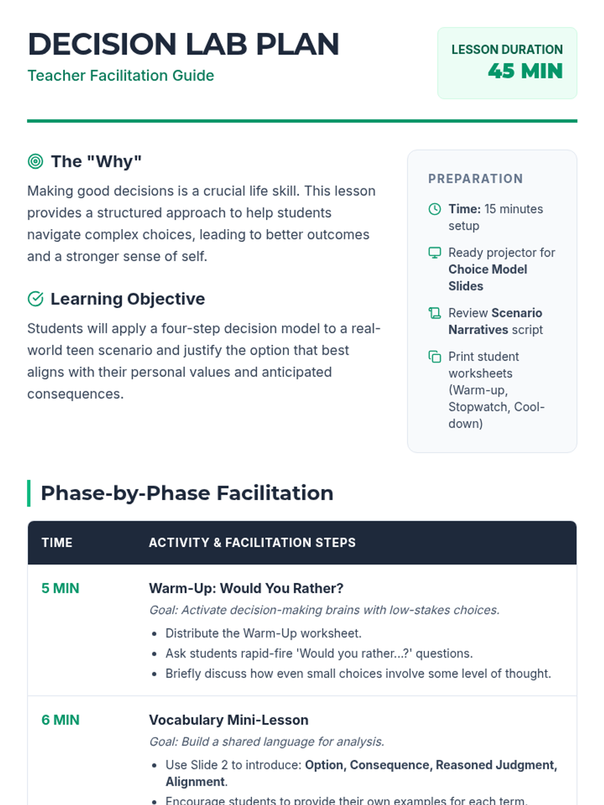 A 45-minute interactive lesson for 9th graders introducing a four-step decision-making model to navigate teen dilemmas using reasoned judgment and value alignment.