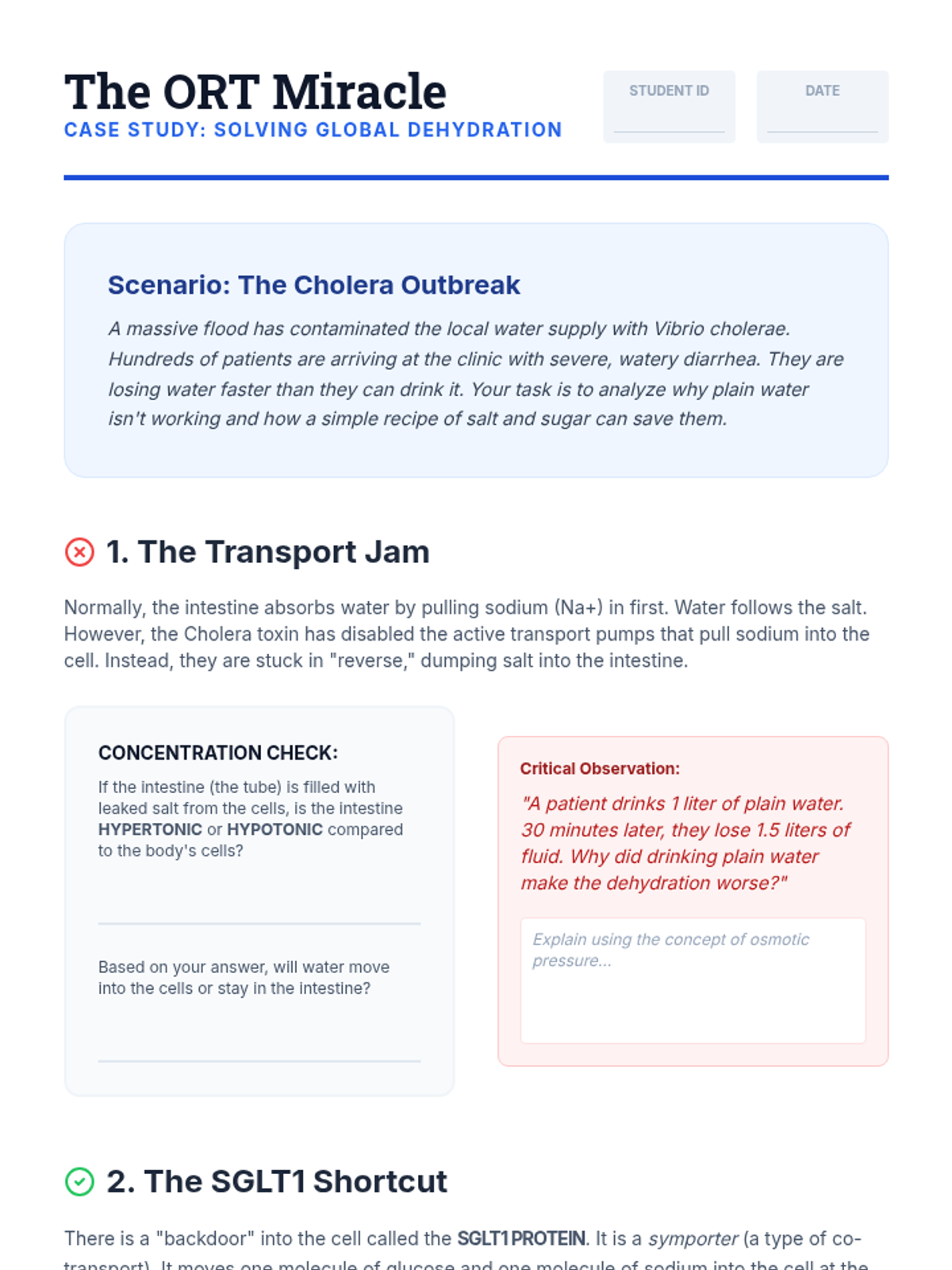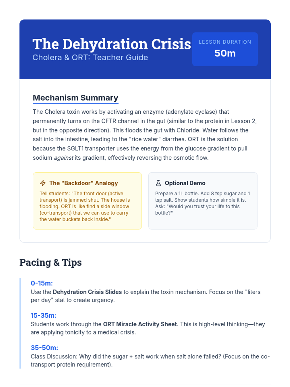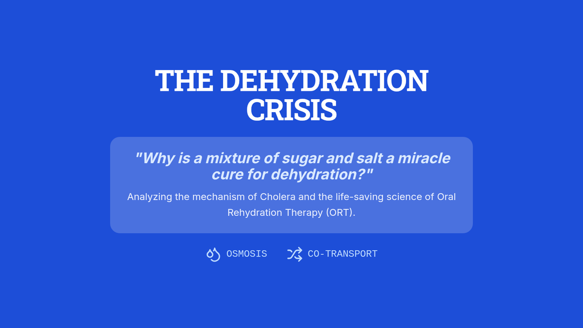 Students analyze the mechanism of the Cholera toxin and the life-saving science behind Oral Rehydration Therapy (ORT). They explore how co-transport of glucose and sodium can reverse extreme dehydration.