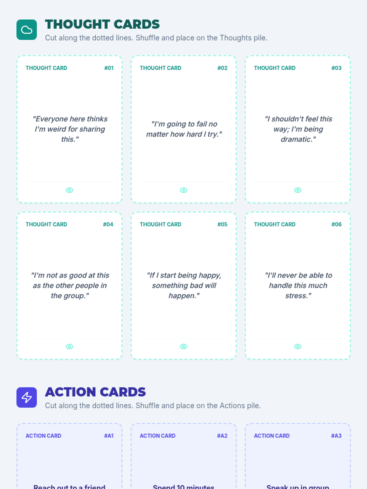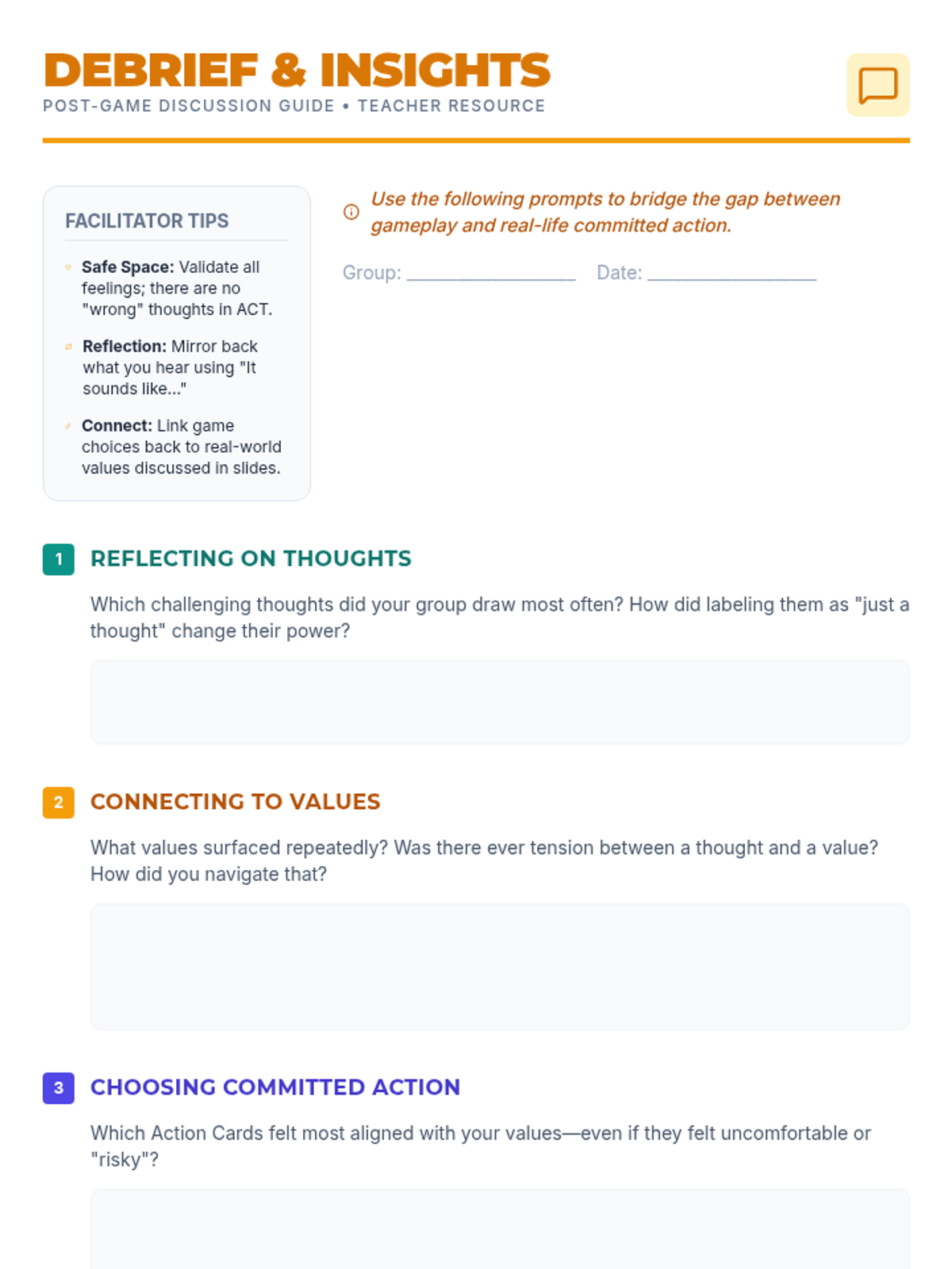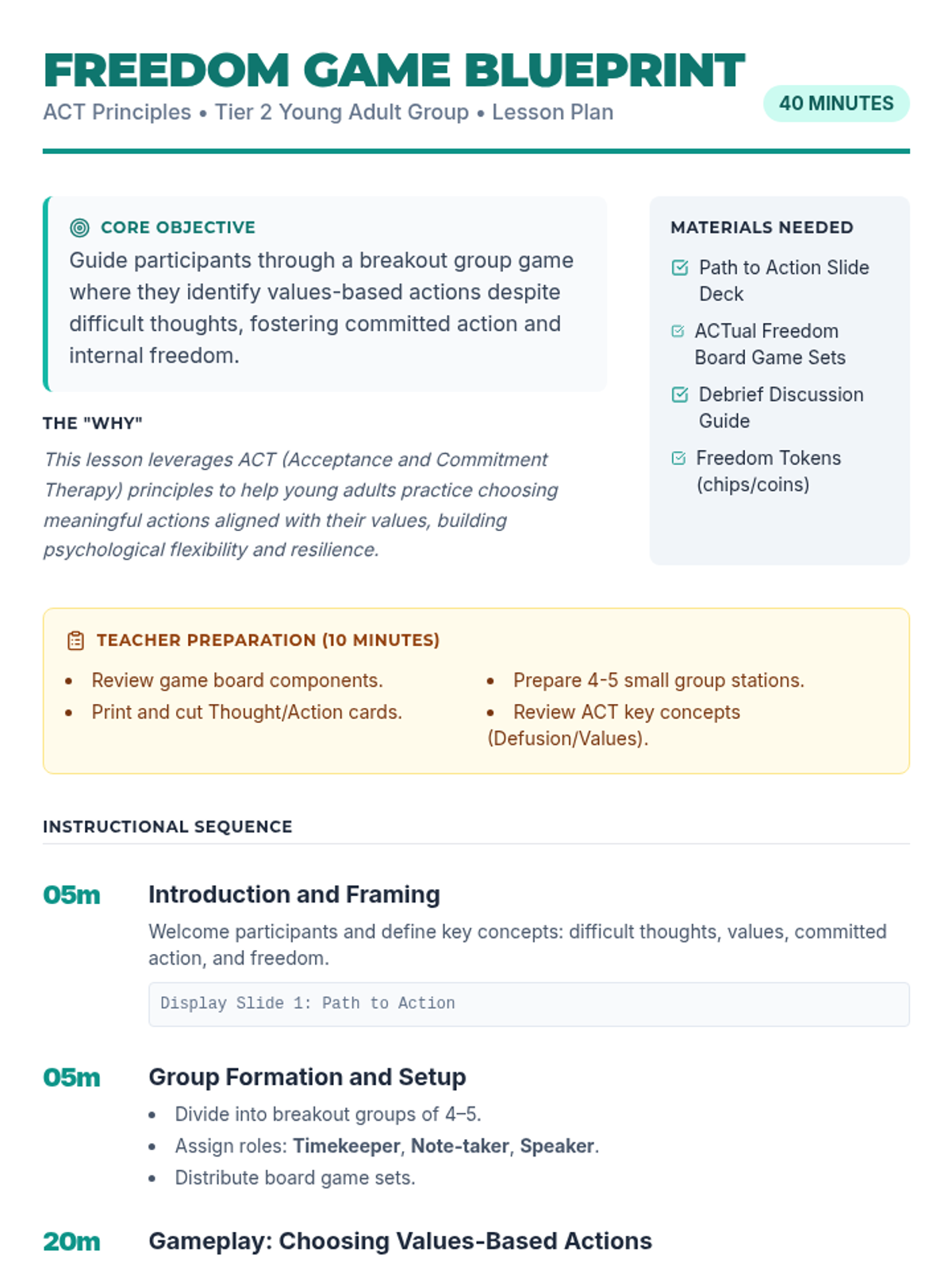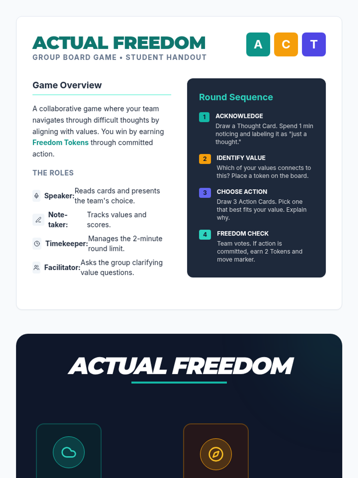 A Tier 2 breakout group game for young adults that uses ACT principles to illustrate how committed action leads to internal freedom despite difficult thoughts.