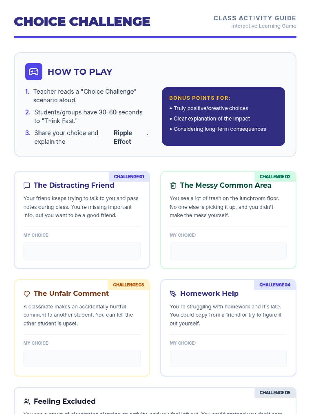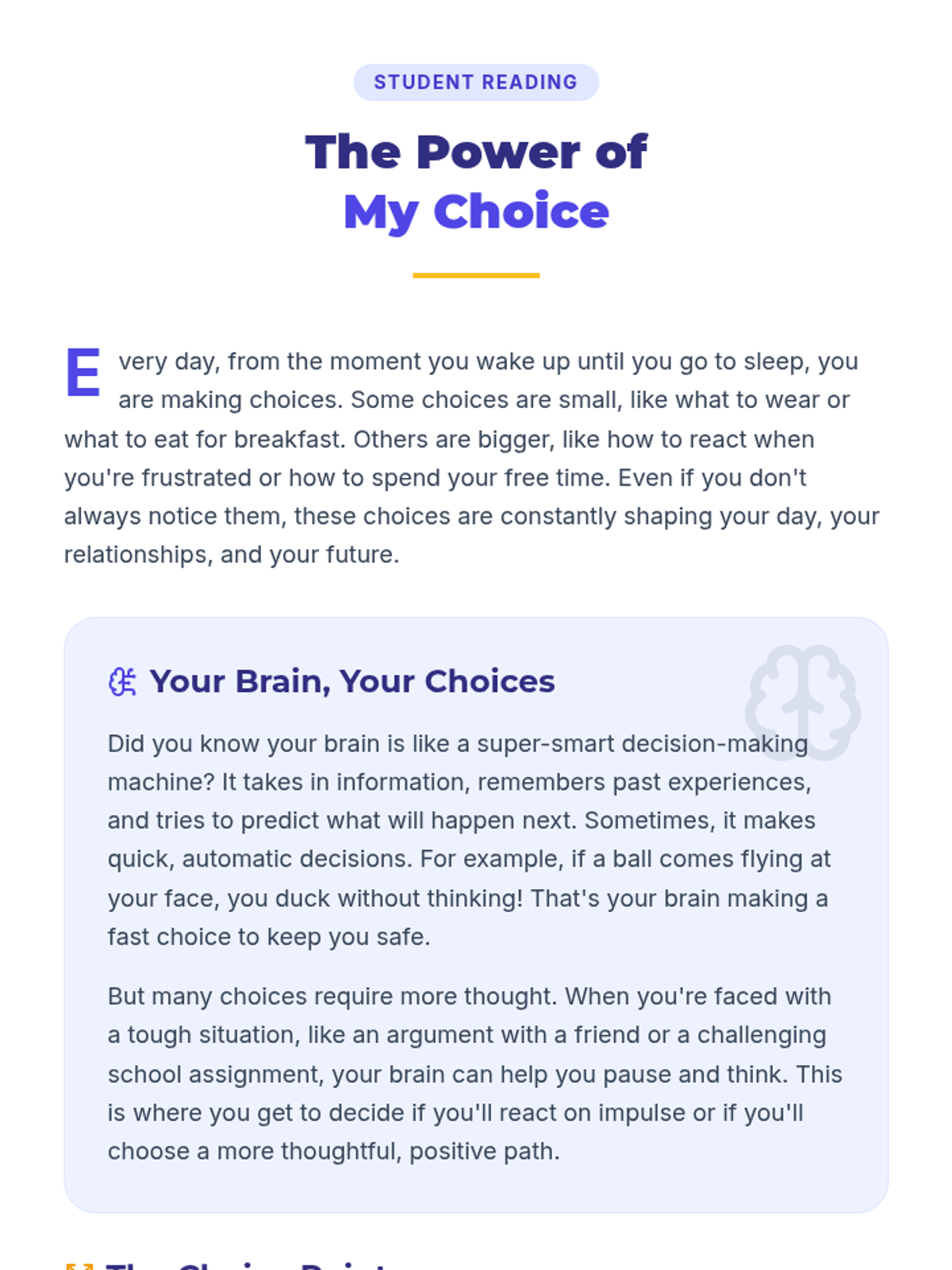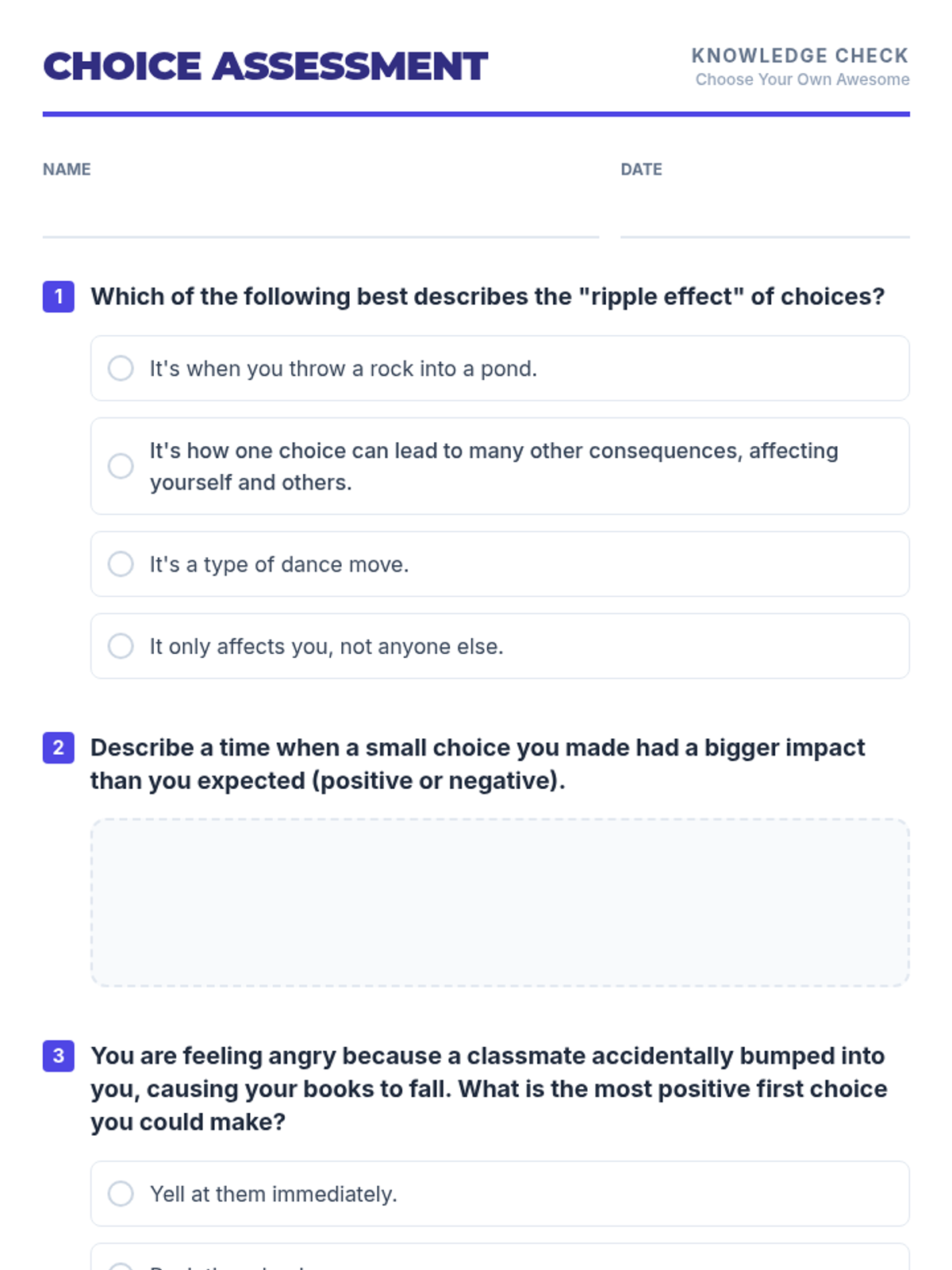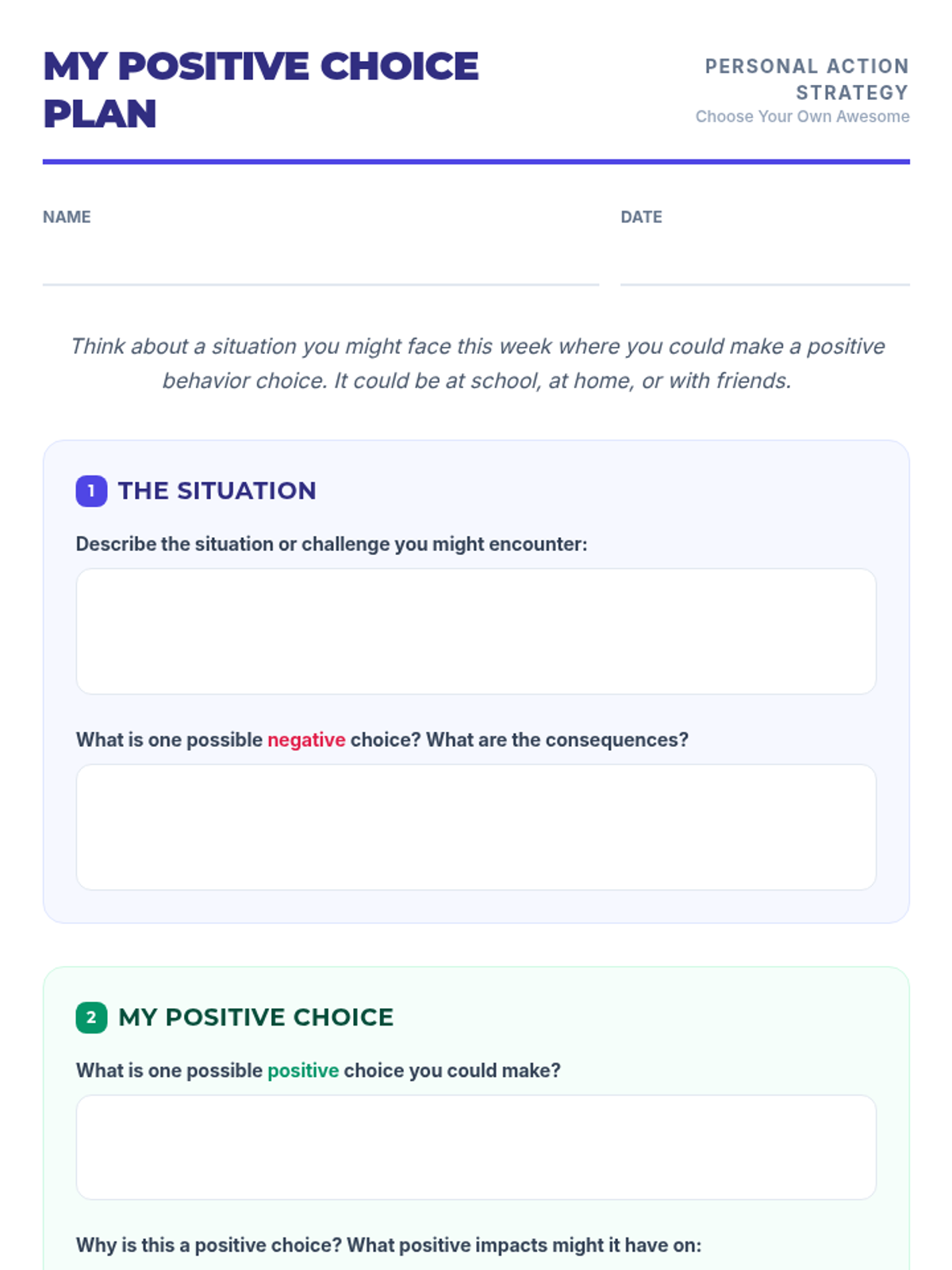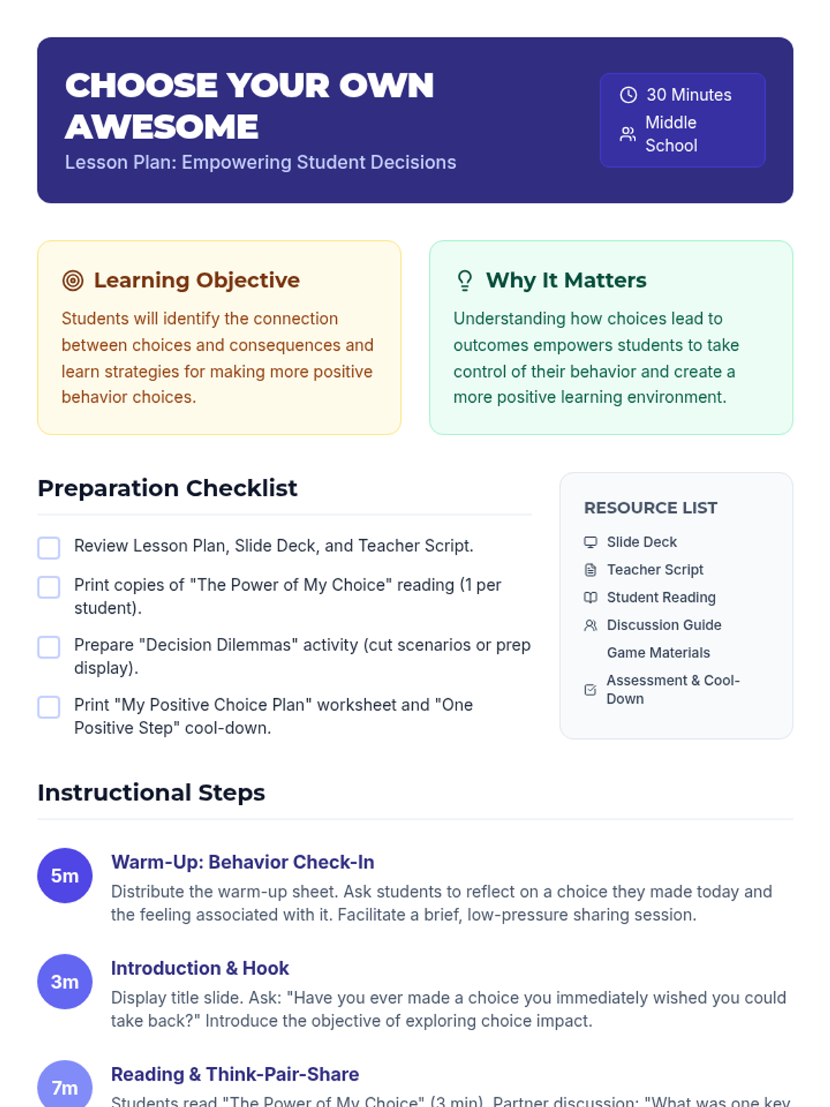 A middle school behavior lesson focused on self-awareness and decision-making skills, helping students understand the connection between their choices and the outcomes in their lives.