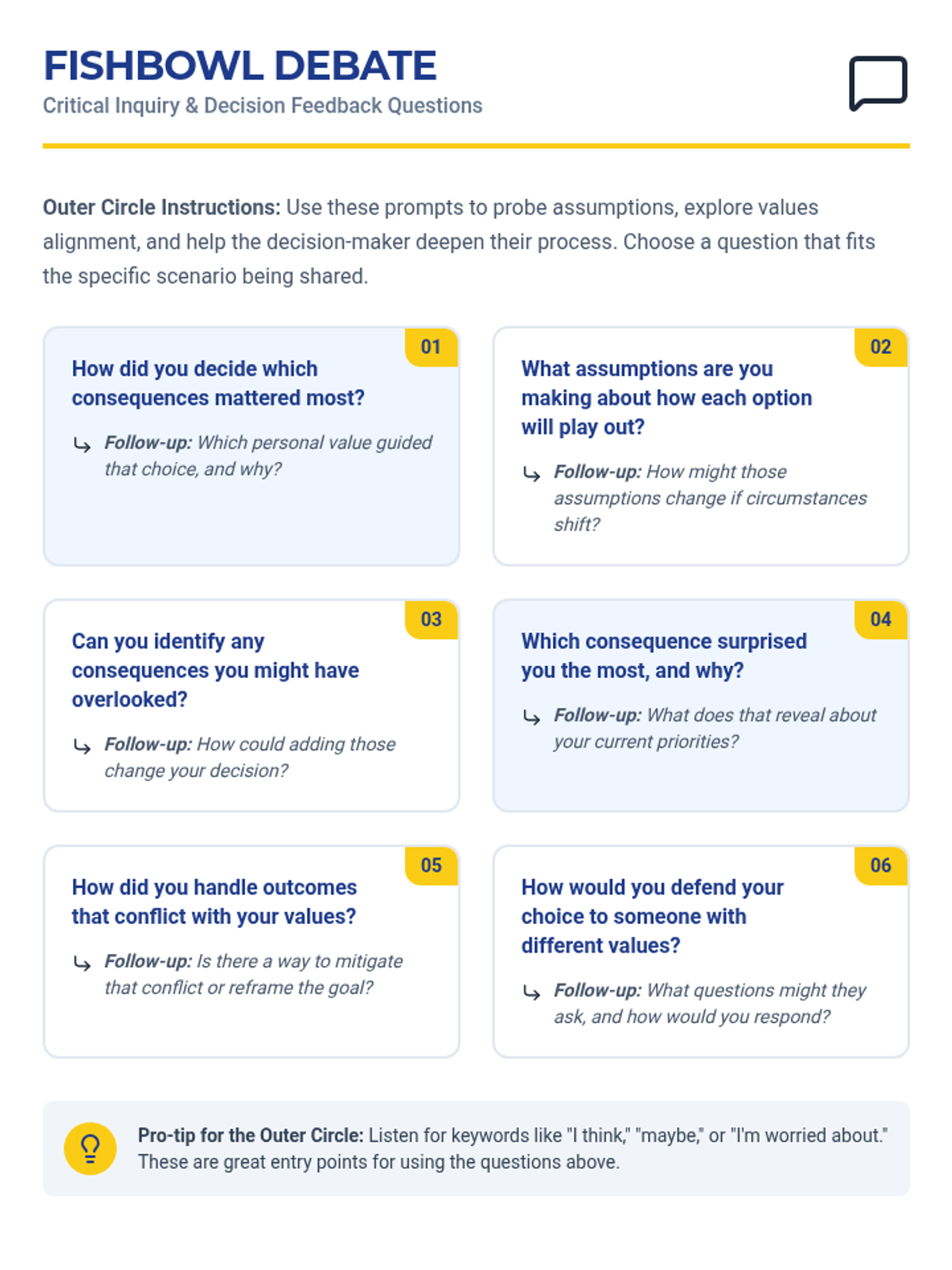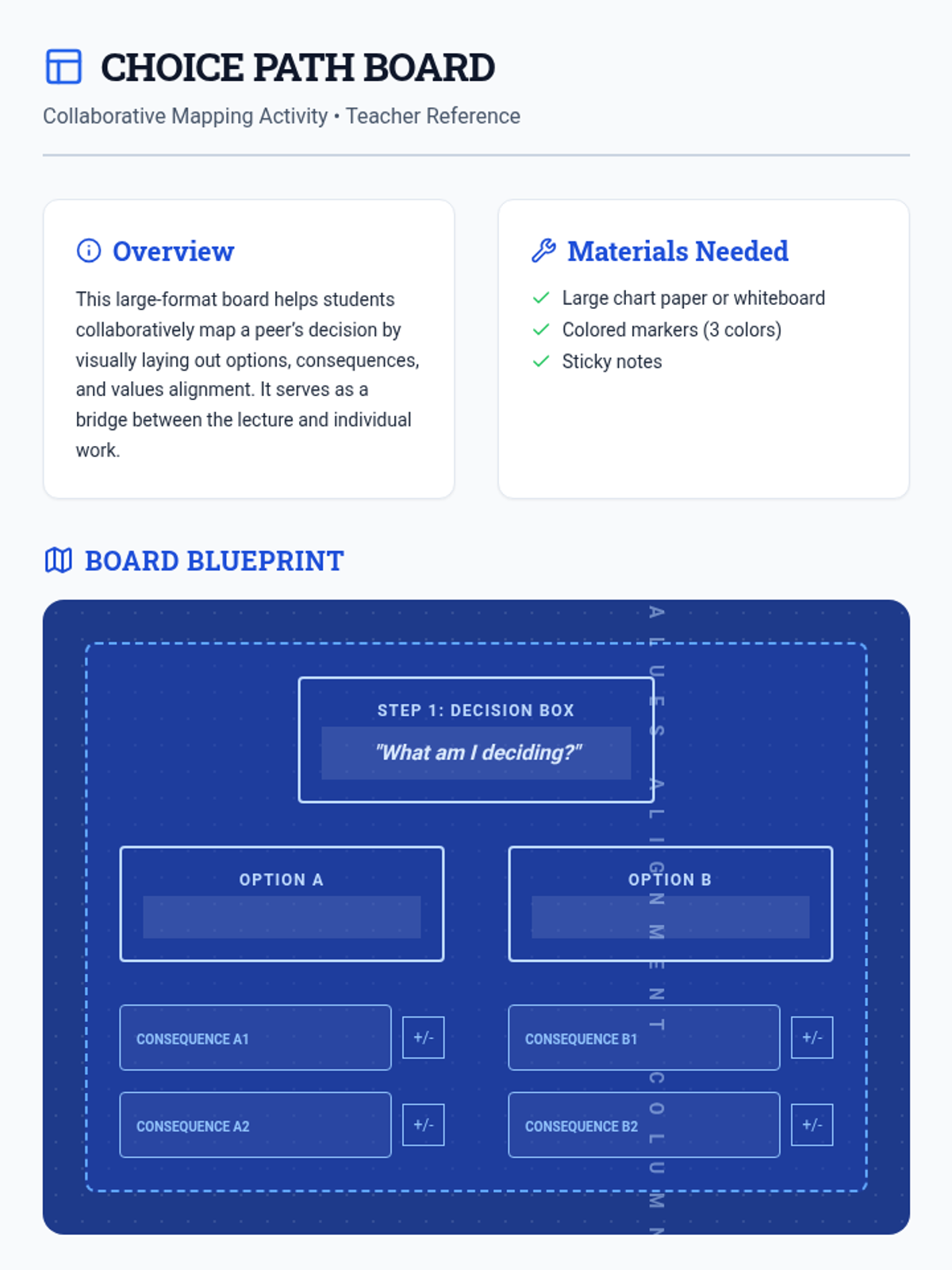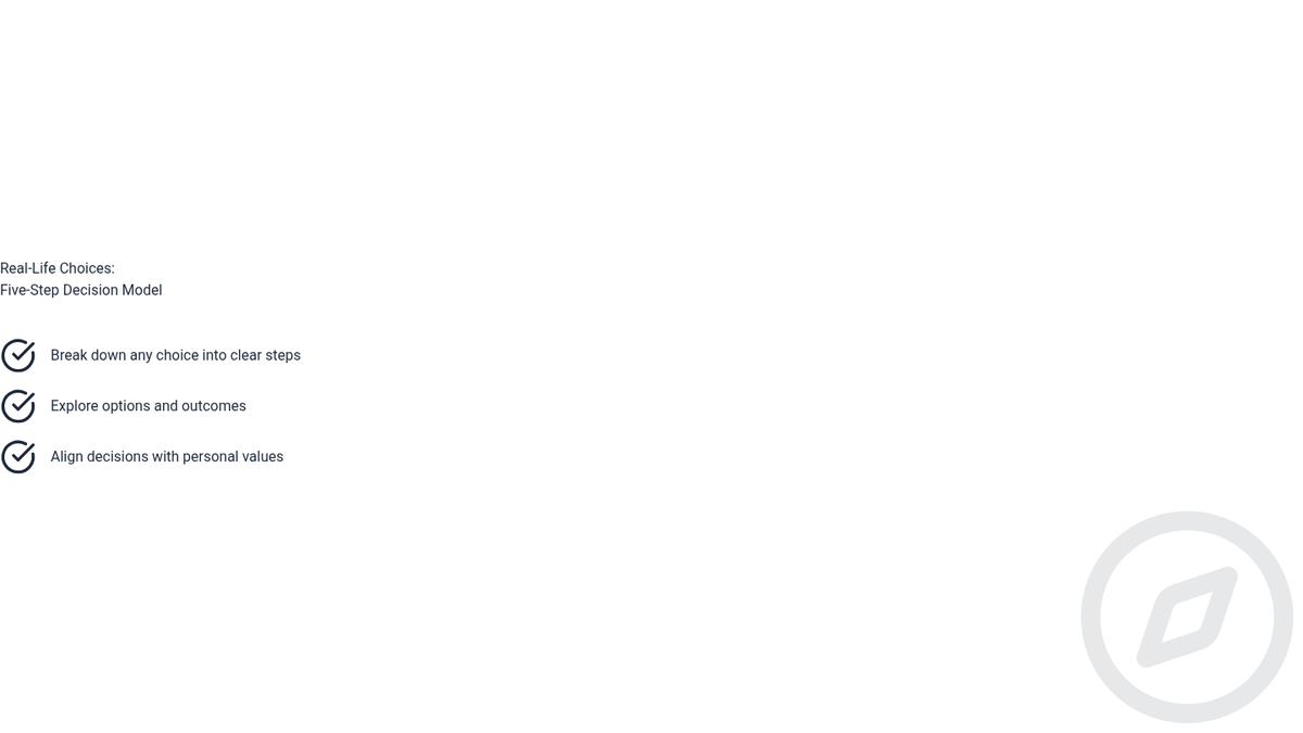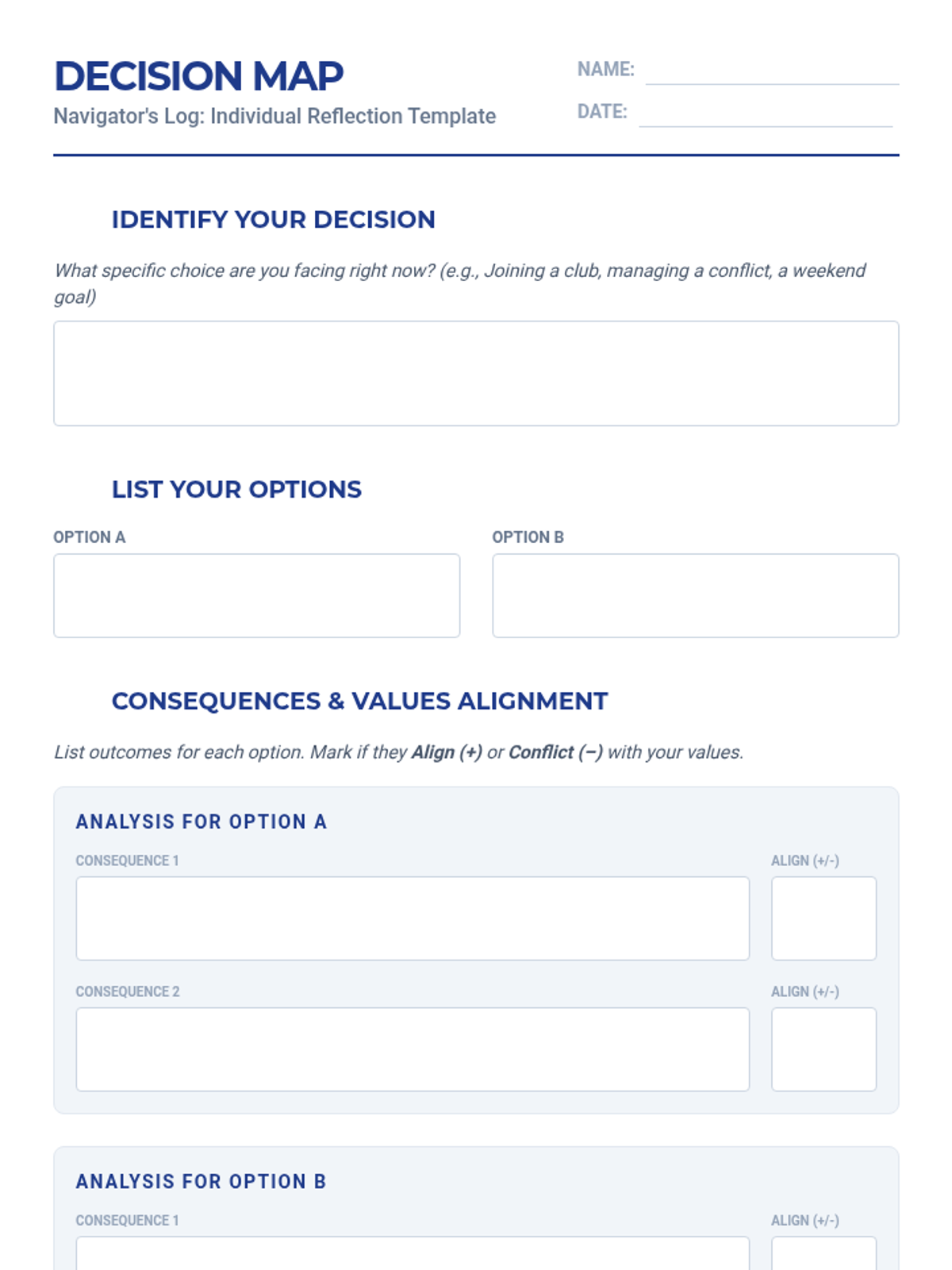In this 45-minute lesson, 9th graders learn a five-step decision-making model and apply it to a personal real-life choice by creating a decision map. Students explore options, consequences, and values alignment to make informed choices.