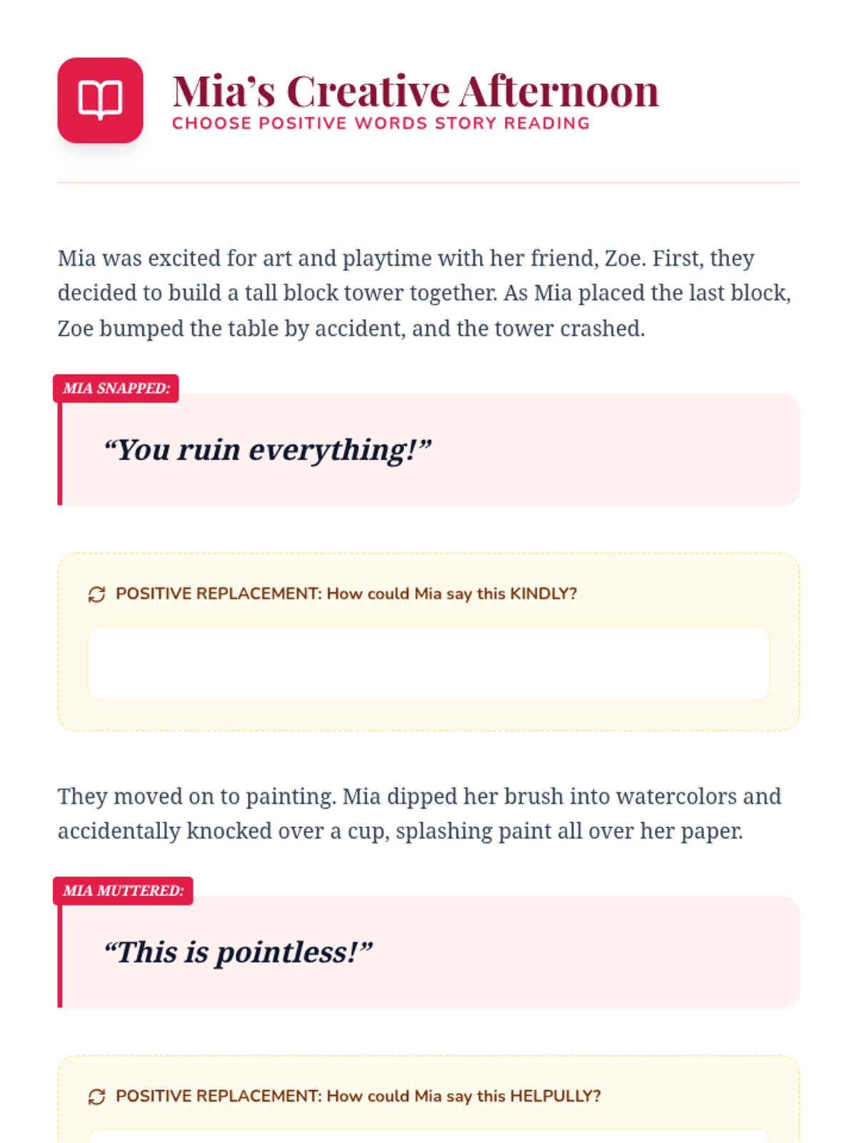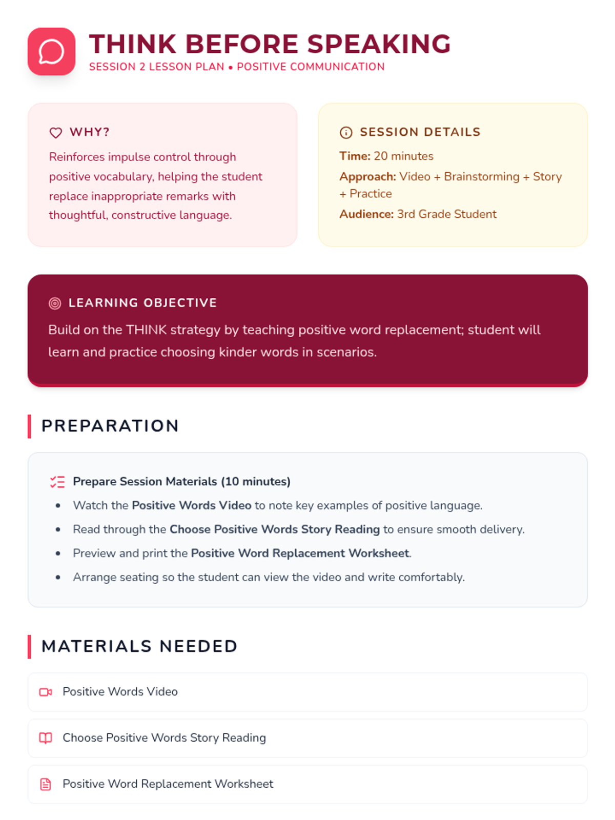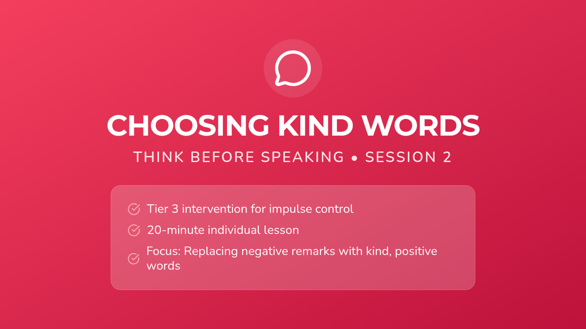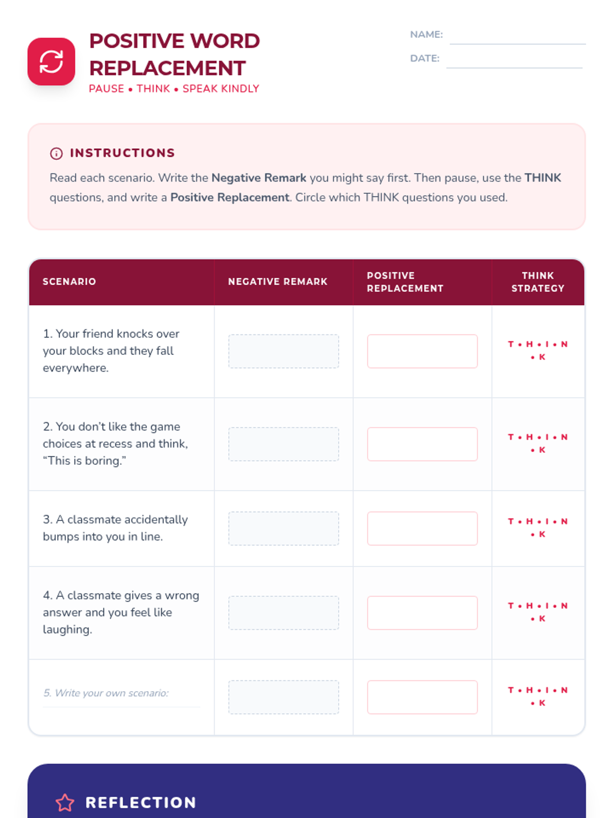 Reinforce impulse control through positive vocabulary, helping the student replace inappropriate remarks with thoughtful, constructive language.