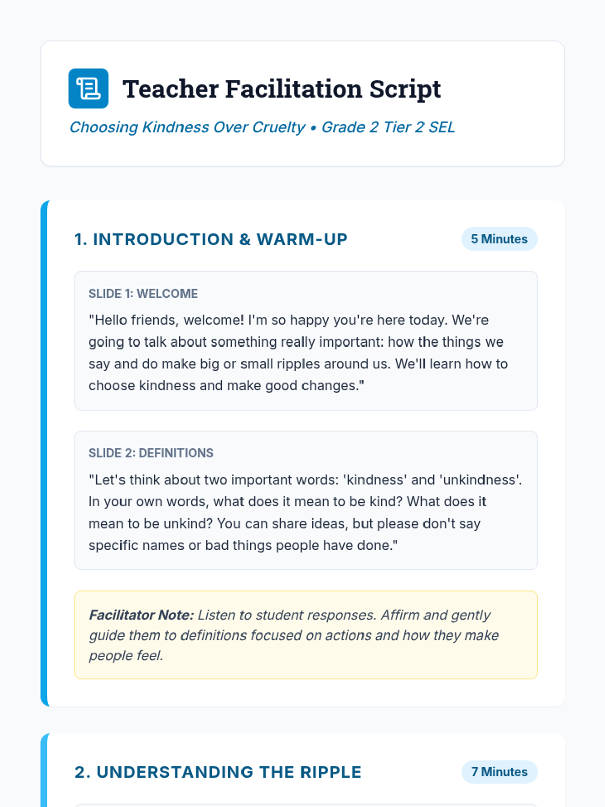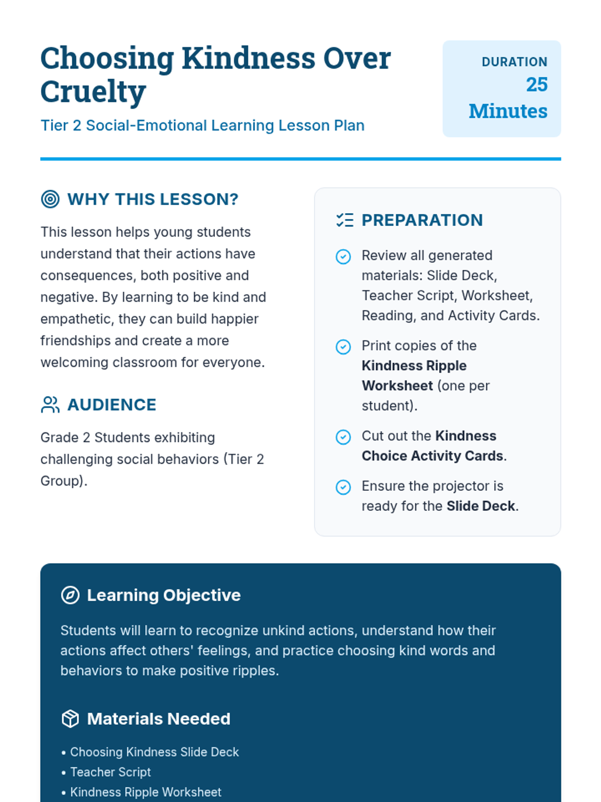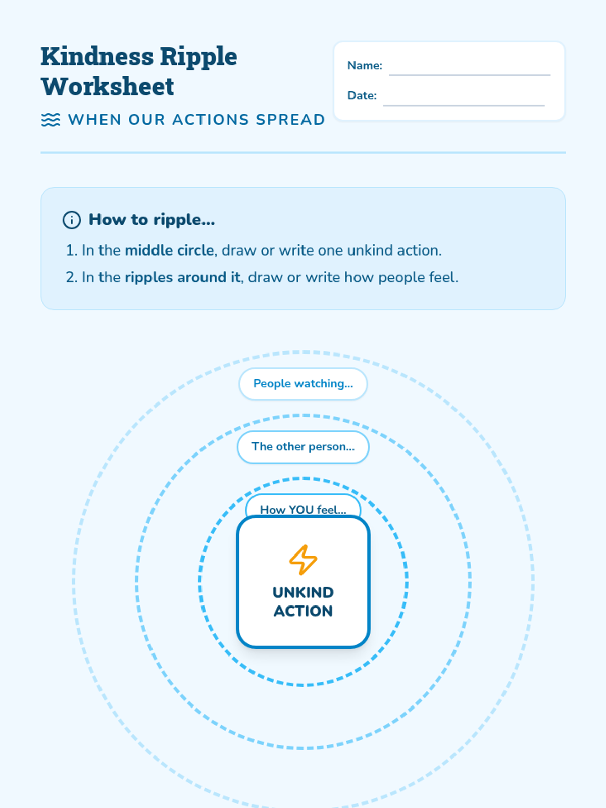 A Tier 2 social-emotional learning lesson for Grade 2 students focusing on the 'ripple effect' of their actions, aimed at reducing bullying behaviors and increasing empathy through discussion, drawing, and role-play.