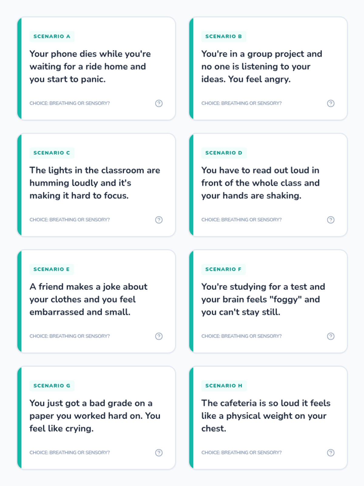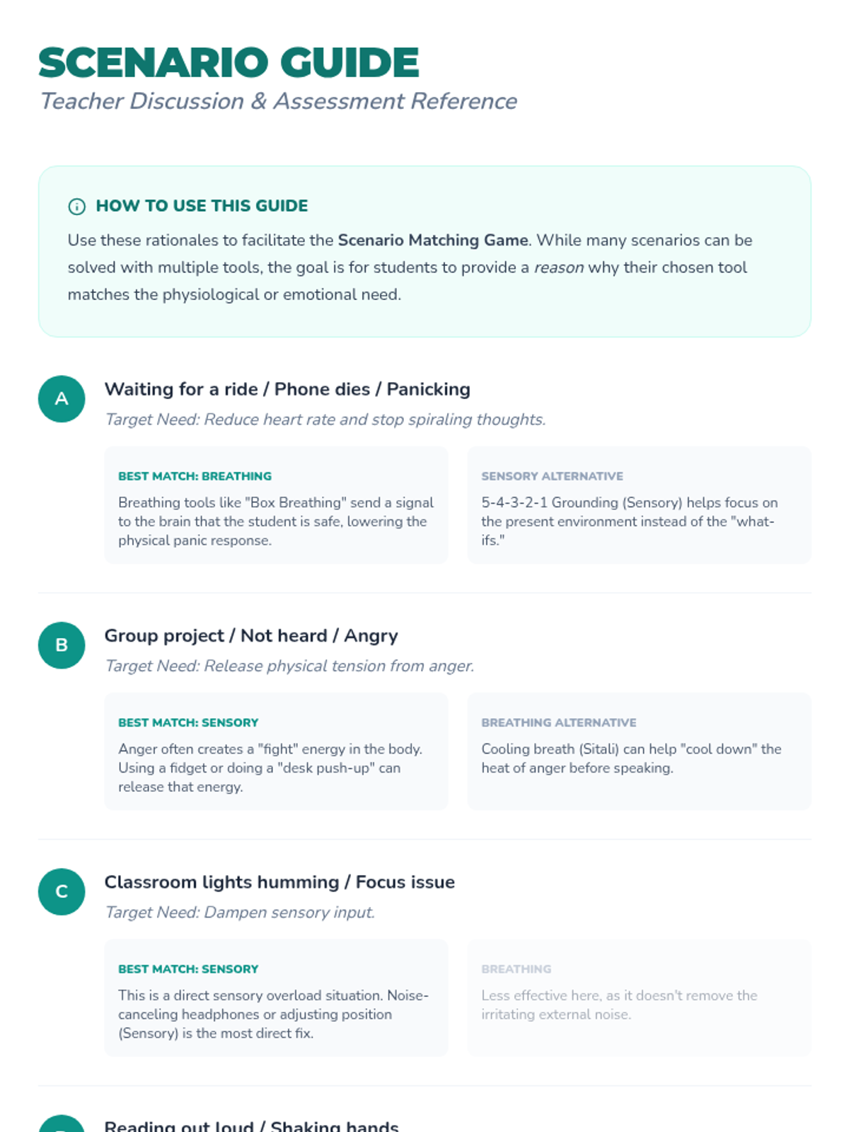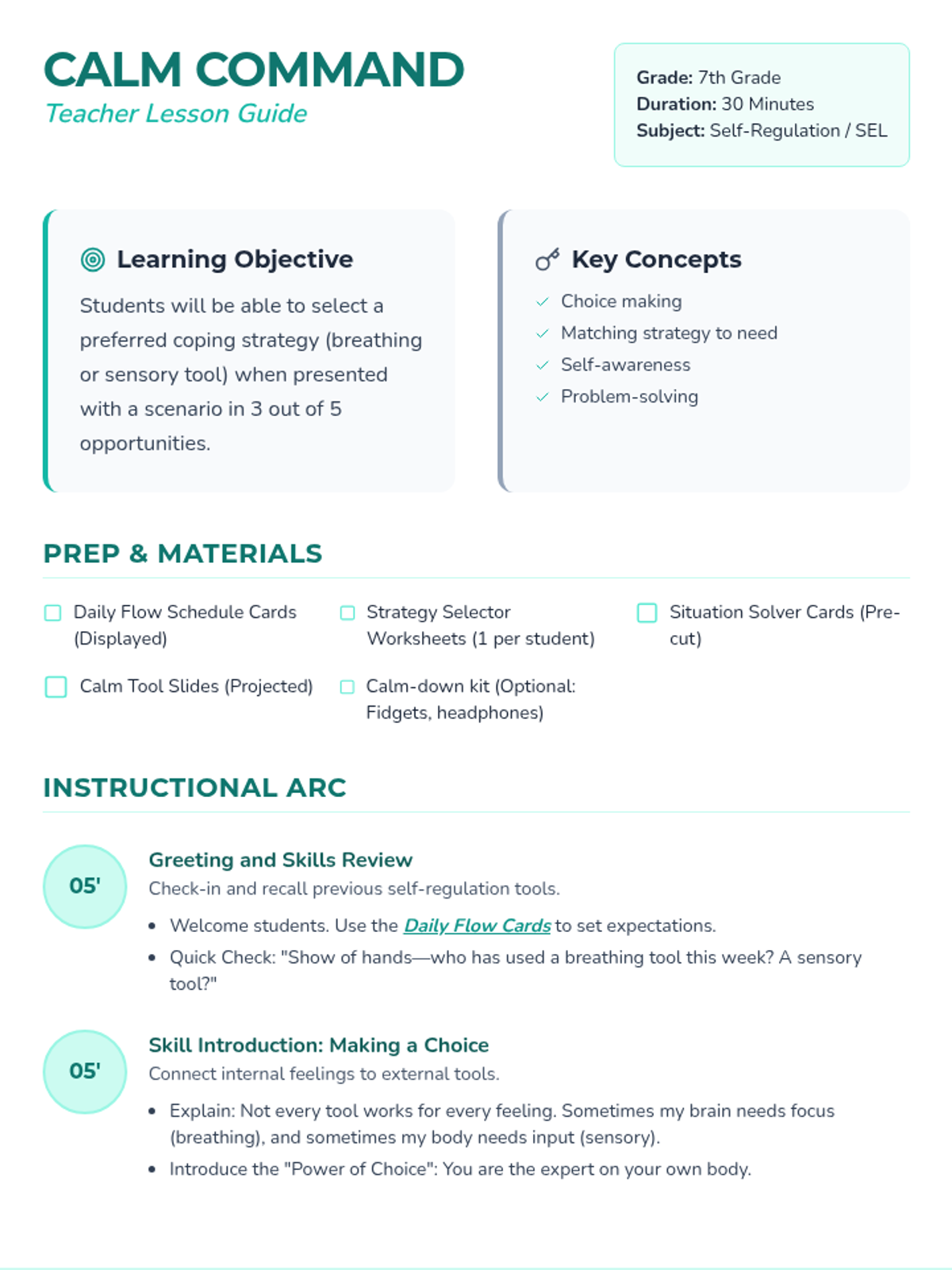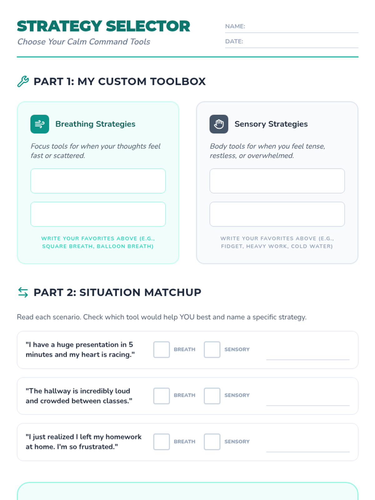 This lesson helps 7th-grade students develop self-awareness and decision-making skills by matching specific coping strategies (breathing vs. sensory) to emotional scenarios. Students will practice selecting their 'calm down tool' through role-play and scenario analysis.