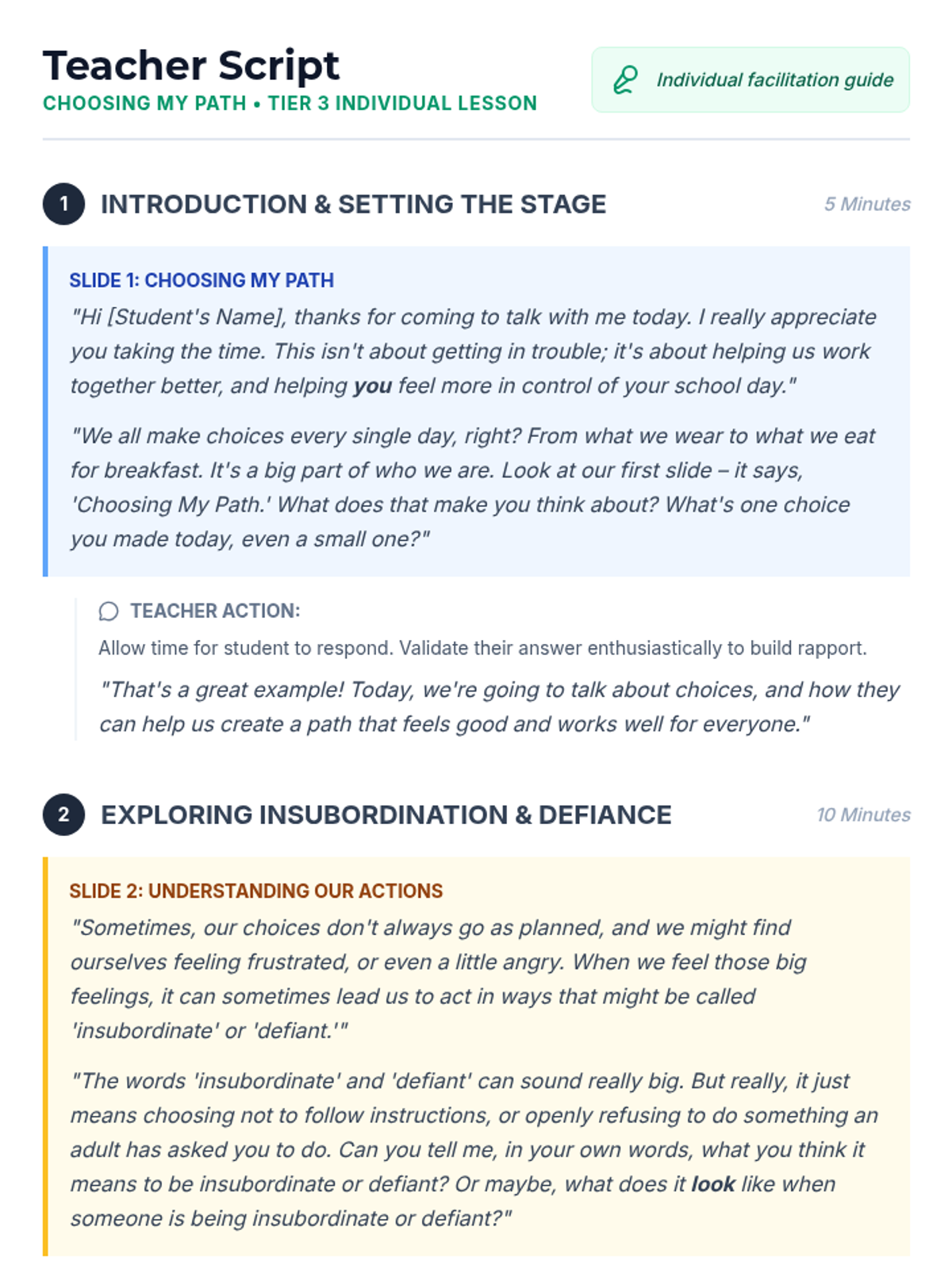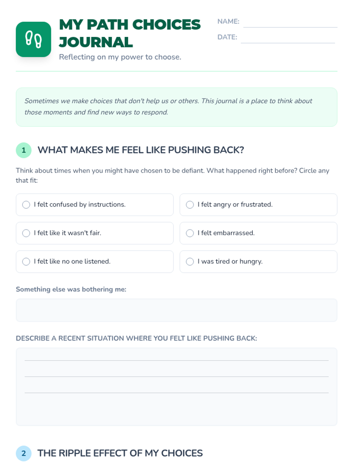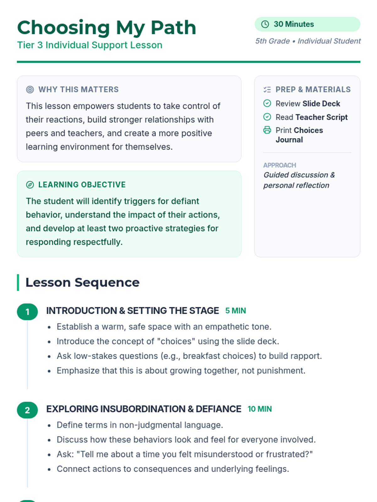 A 30-minute Tier 3 individual lesson for 5th-grade students to understand the impact of defiant behaviors and develop self-regulation strategies through a 'pathway' metaphor.