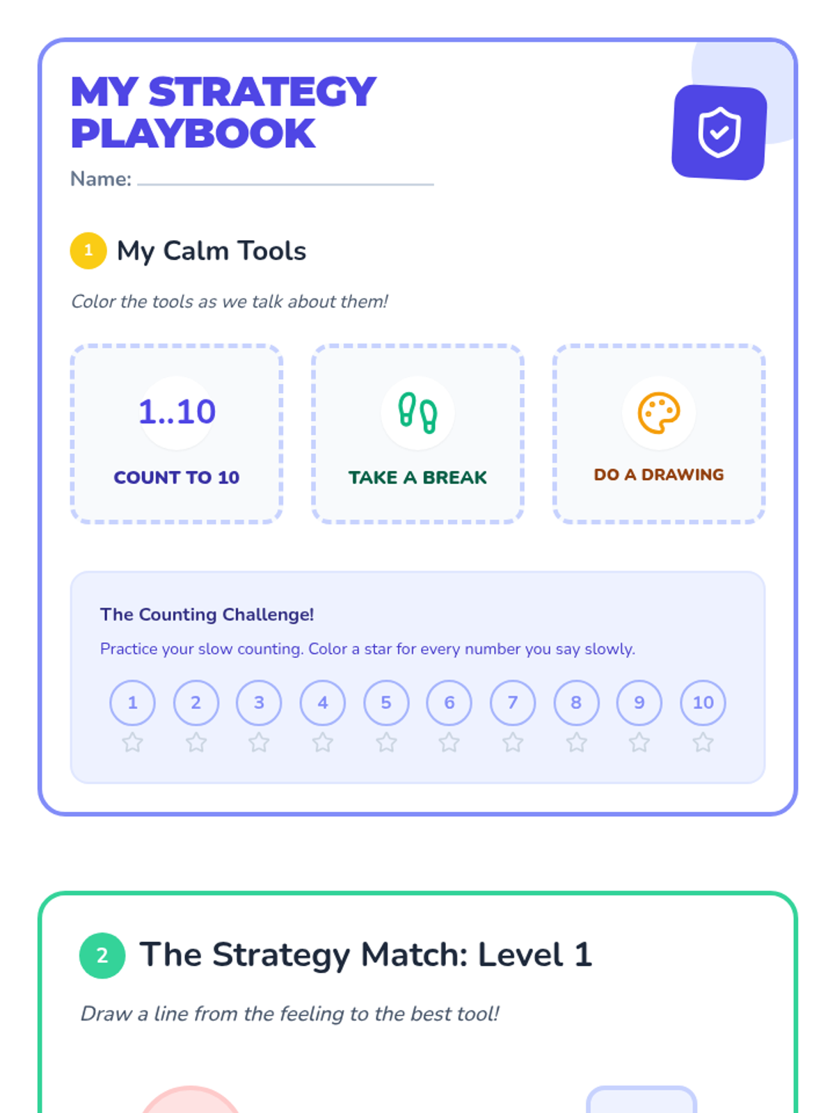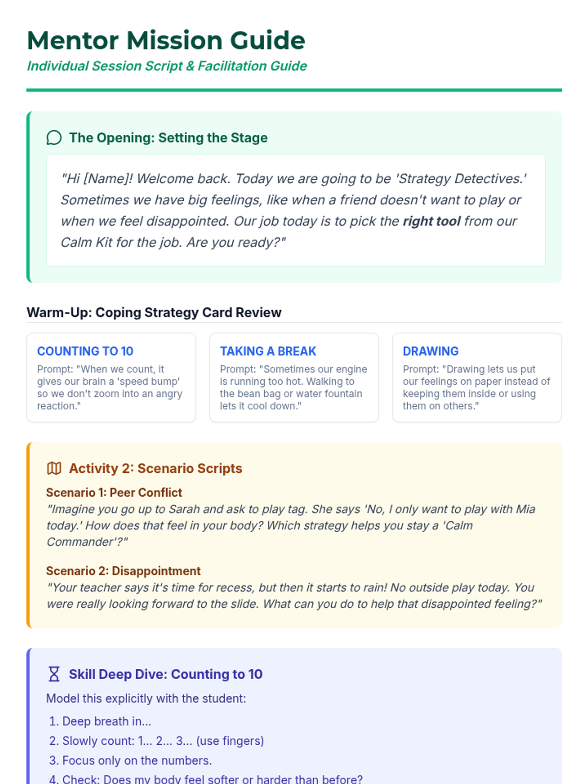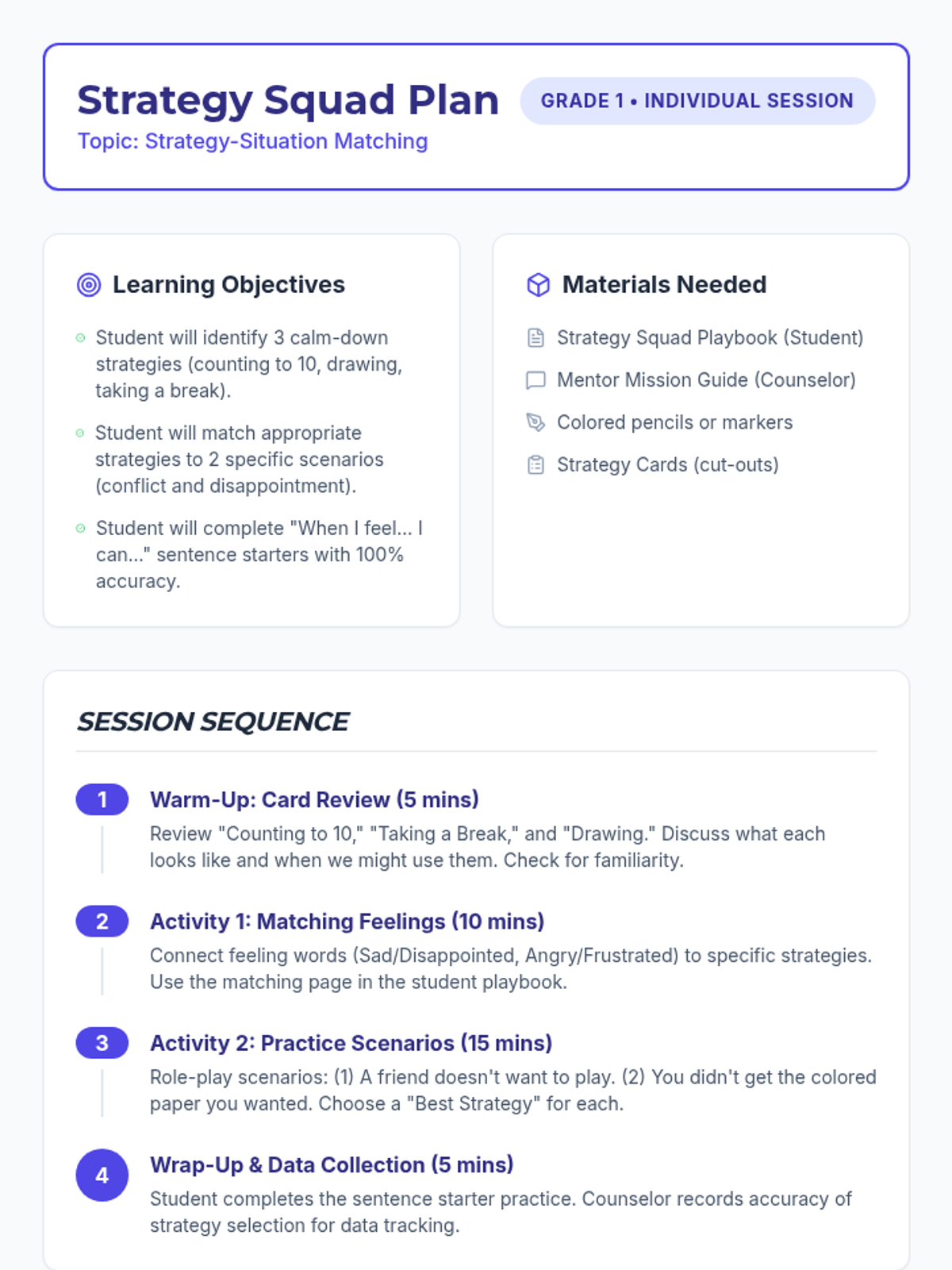 A structured individual counseling session for a 1st grader focused on matching specific coping strategies to feelings of disappointment and peer conflict.