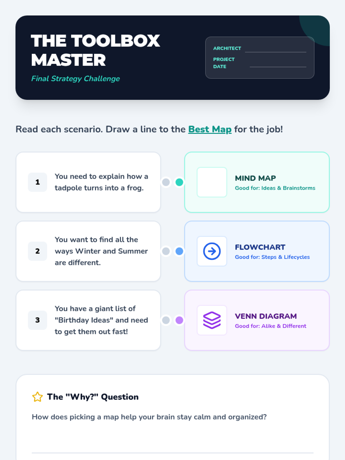 A culminating lesson where students analyze different tasks and select the most effective graphic organizer to solve them.