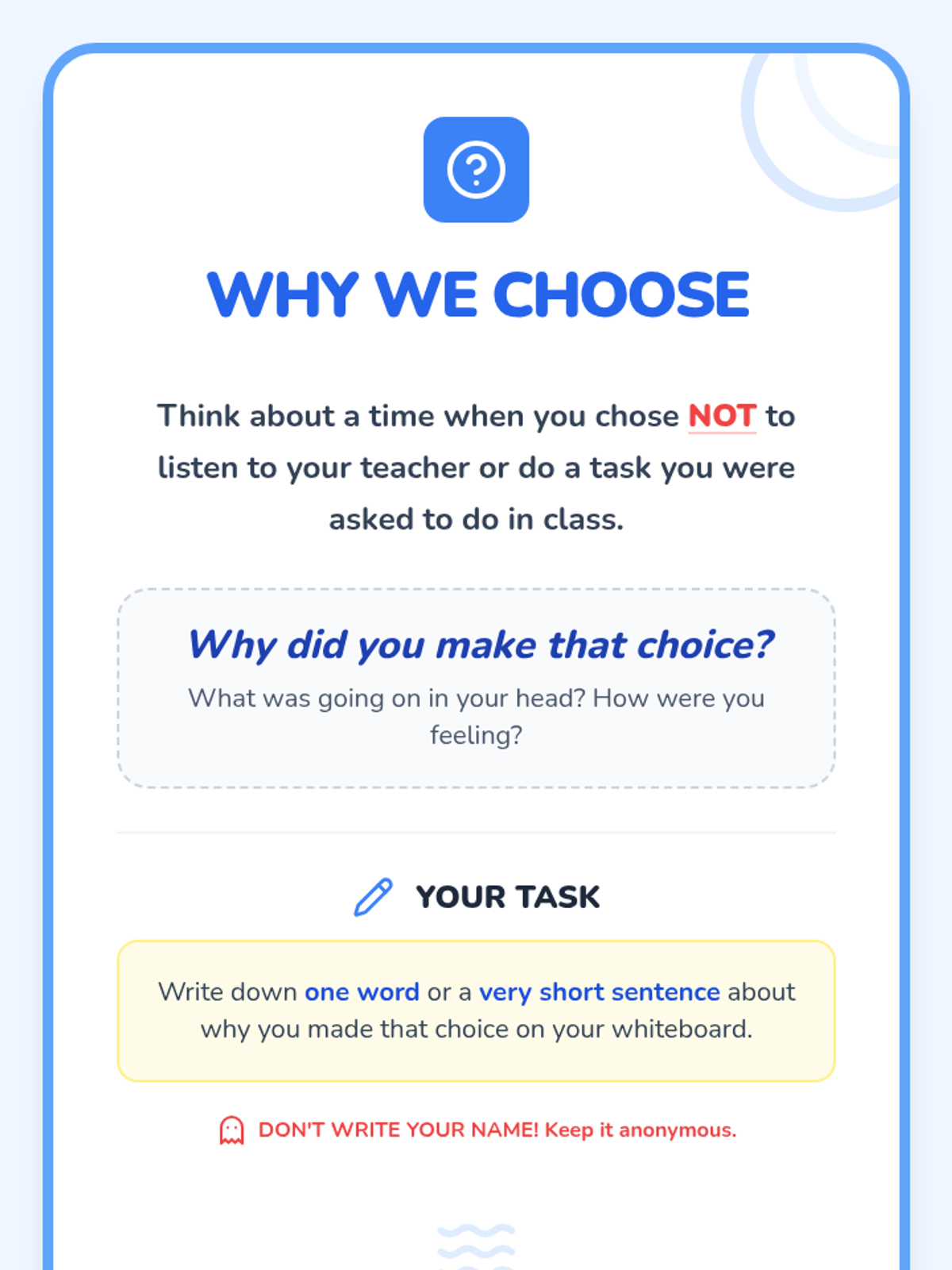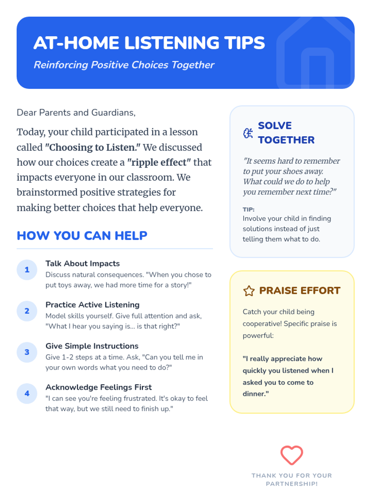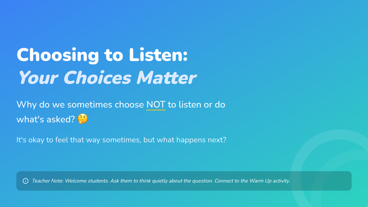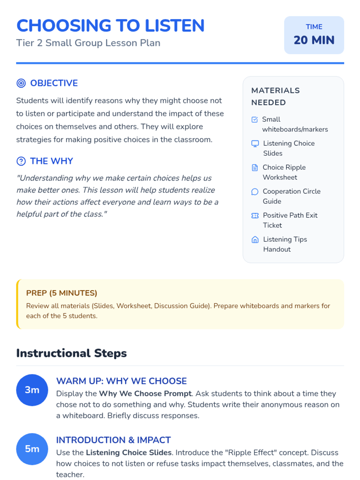 A 20-minute Tier 2 lesson for 2nd grade students focused on understanding the reasons behind not listening and the impact of those choices on the classroom community.