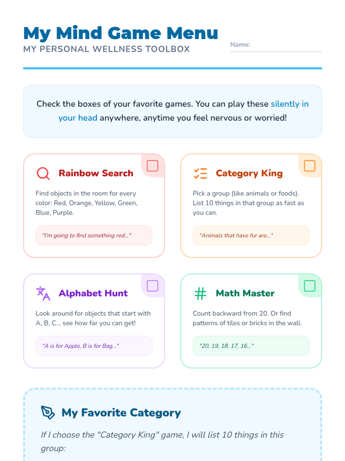 Students review the cognitive strategies learned and create a 'Menu of Mind Games' to use when they feel nervous.