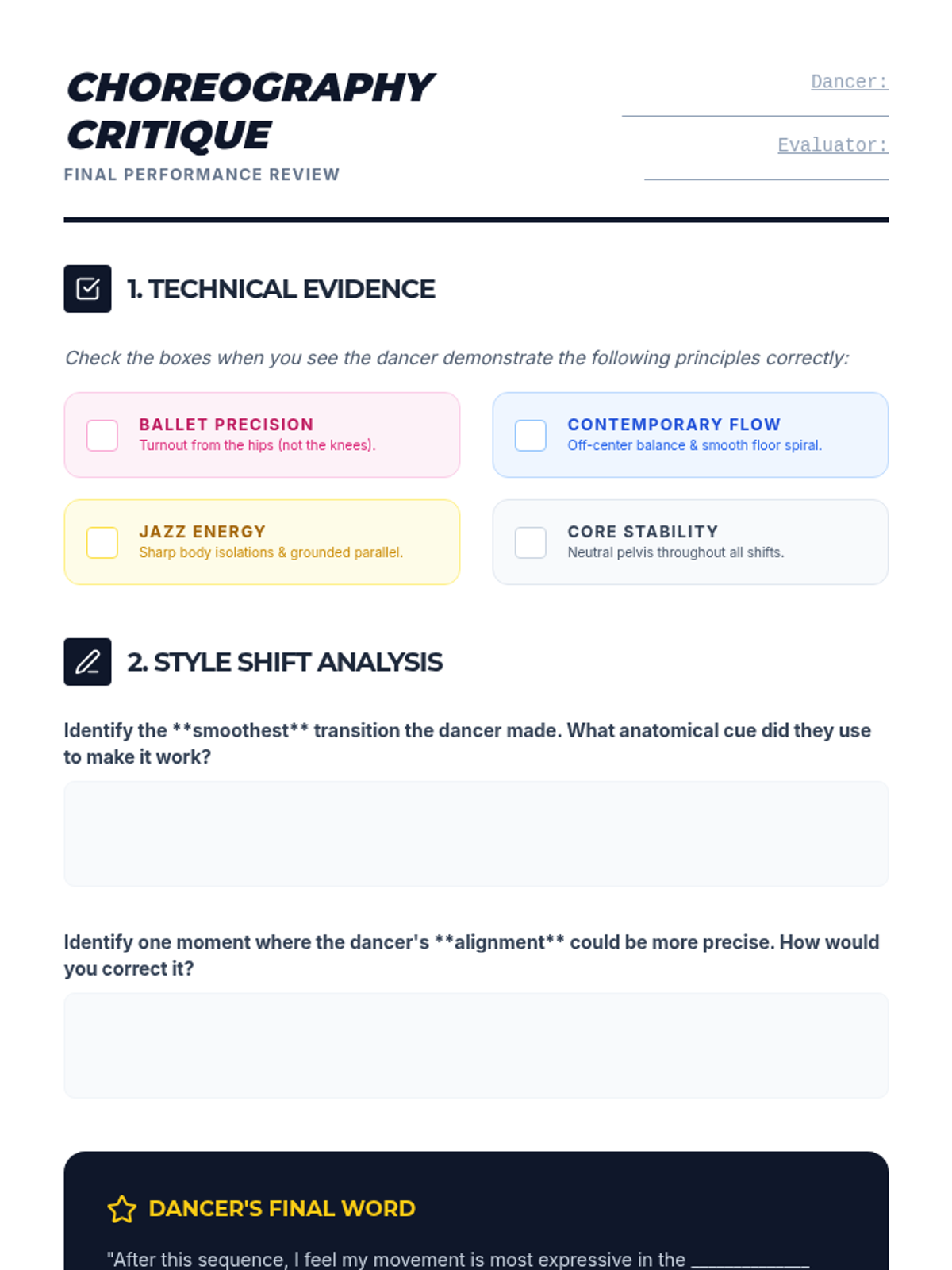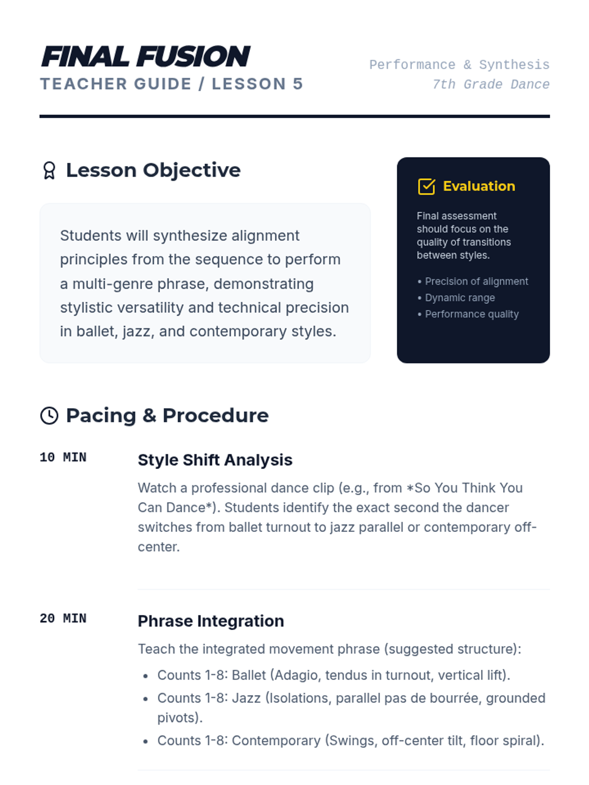 The capstone lesson where students synthesize all learned techniques into a multi-genre movement phrase, demonstrating stylistic versatility and technical precision.