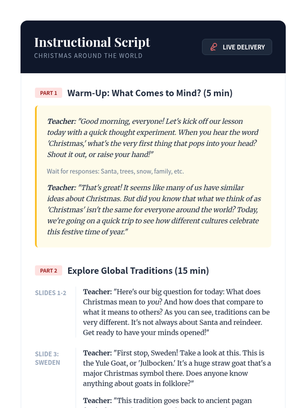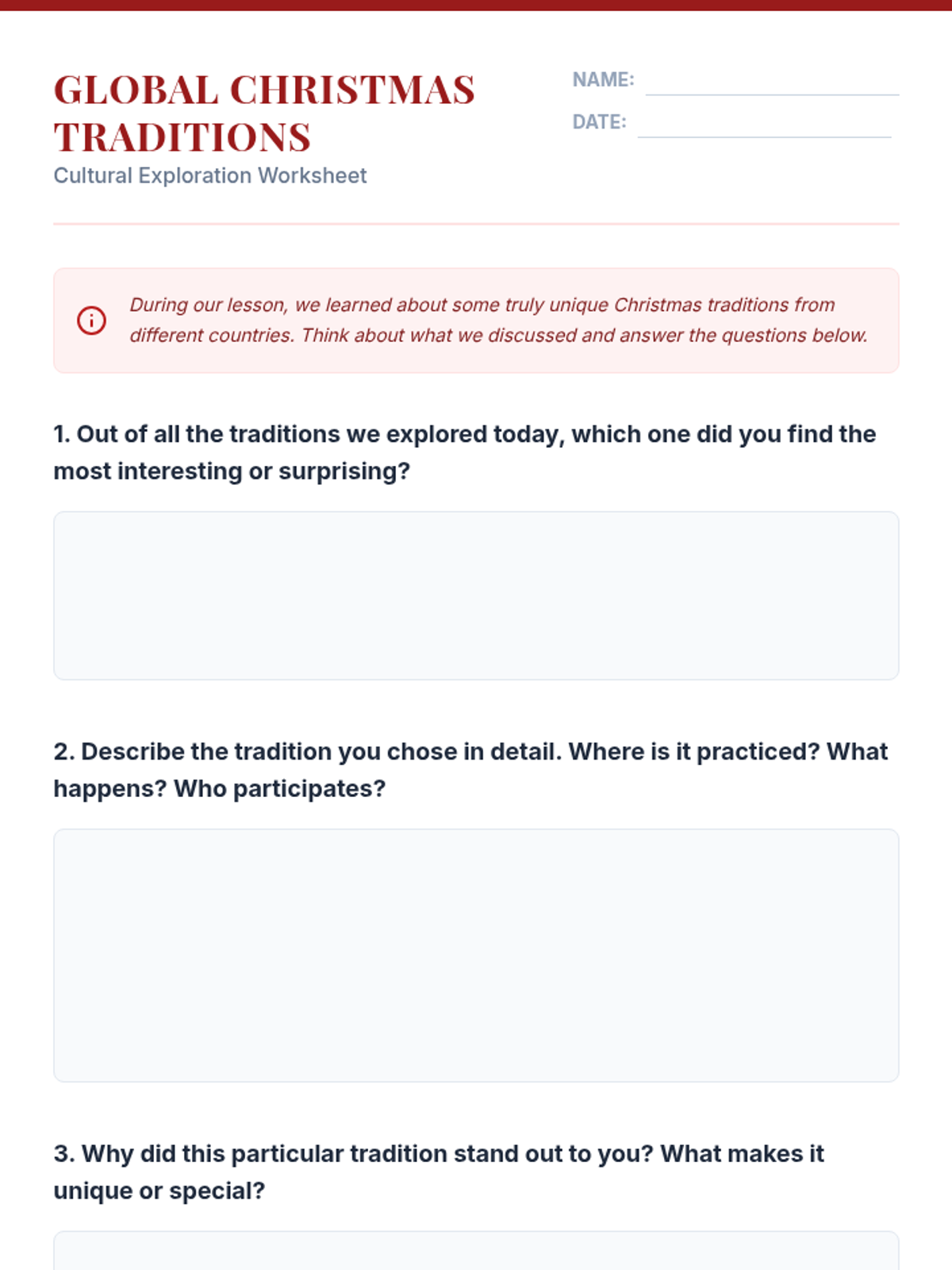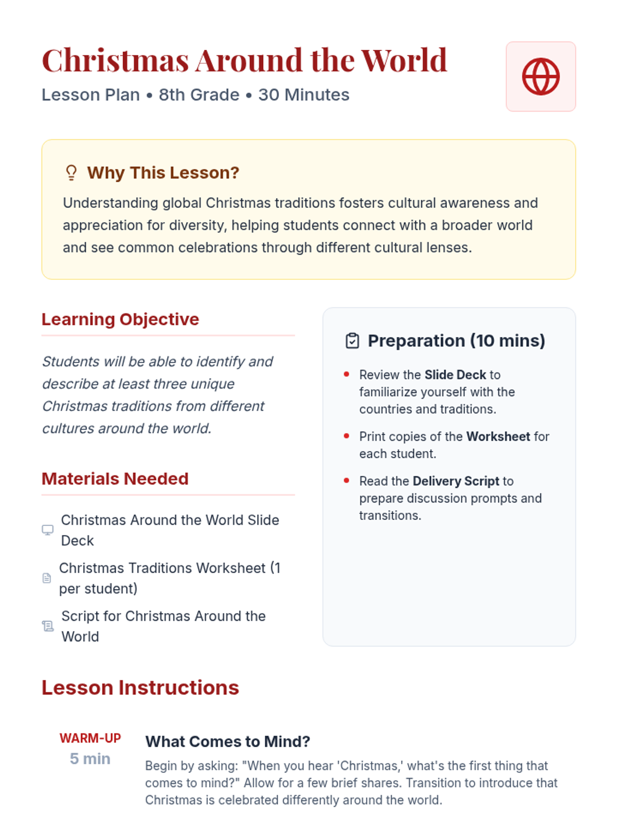 This lesson explores the diverse traditions and cultural significance of Christmas celebrations across different countries, fostering global awareness and appreciation for diversity in 8th-grade students.