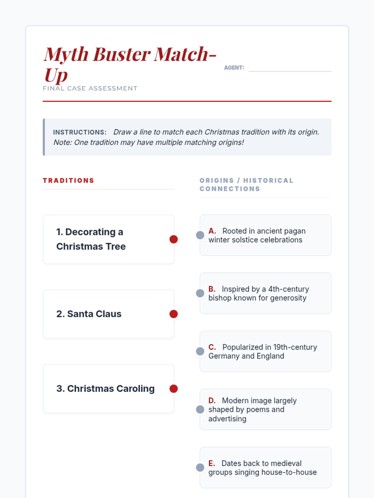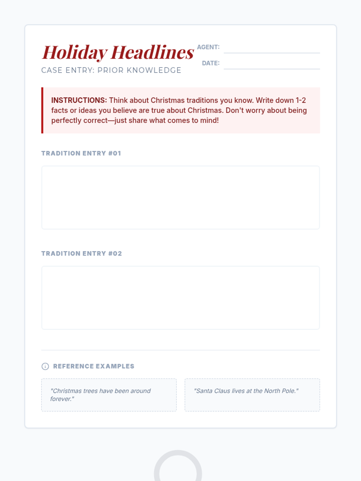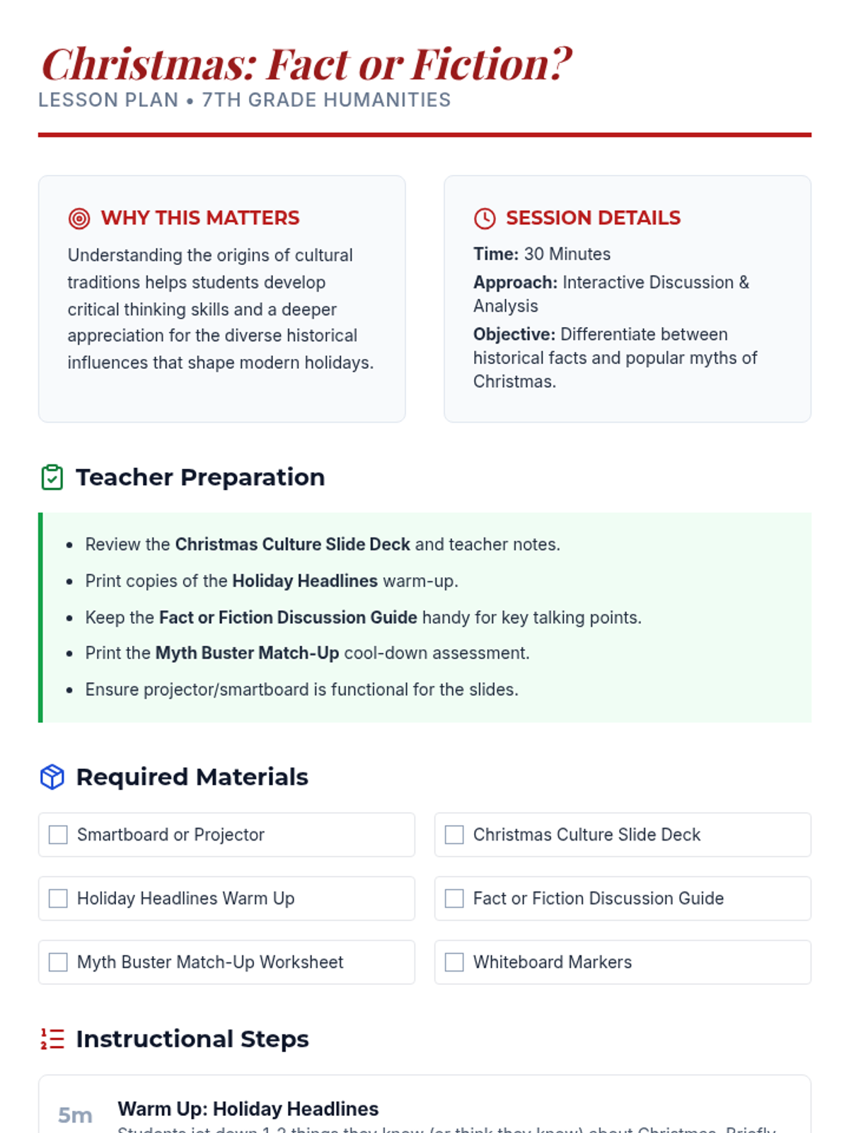 A 30-minute investigative lesson for 7th graders to explore the historical and cultural origins of common Christmas traditions, distinguishing between ancient customs and modern myths.