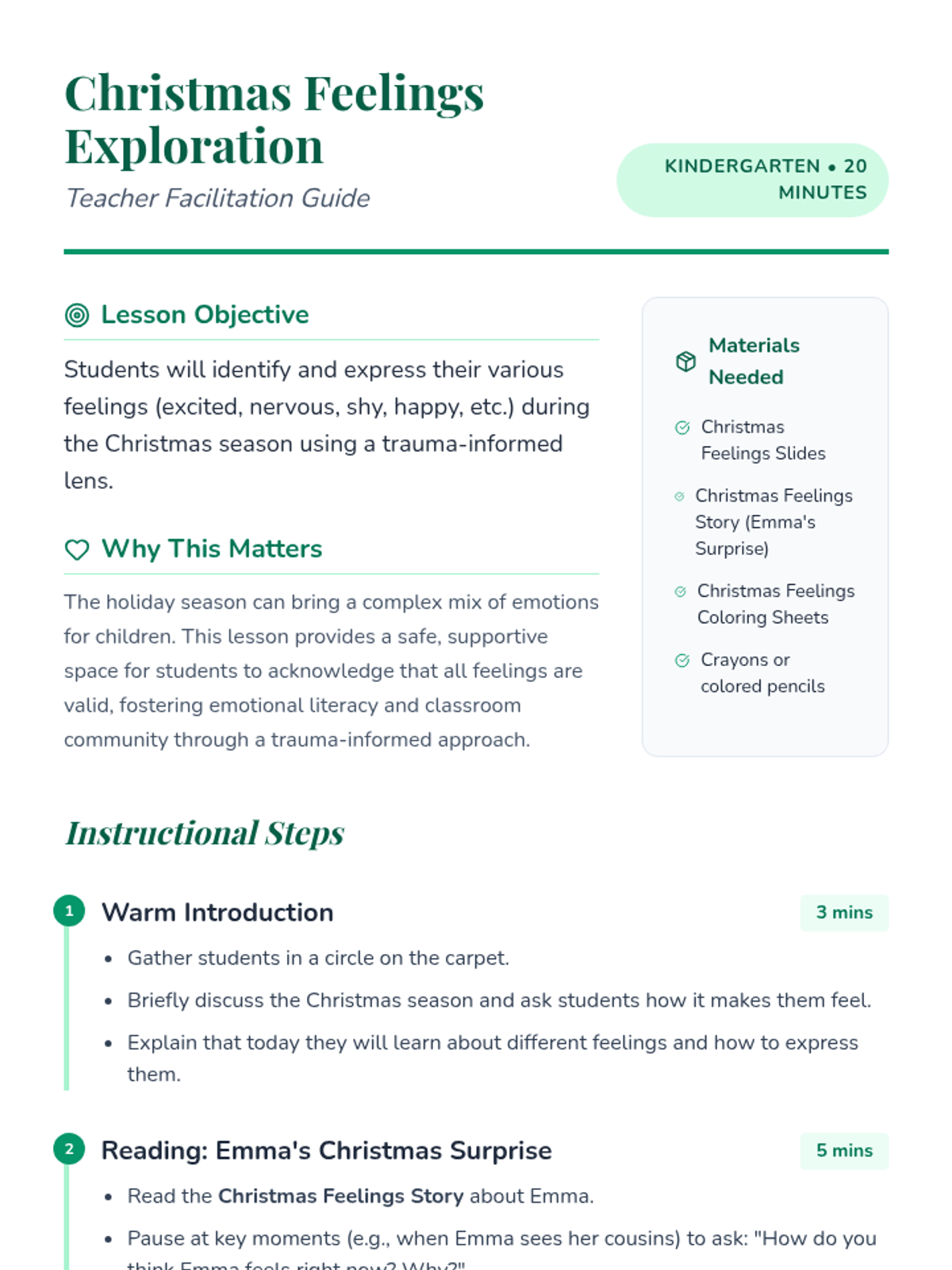 A trauma-informed kindergarten lesson that explores the diverse range of emotions children might feel during the Christmas season through storytelling, music, and art.