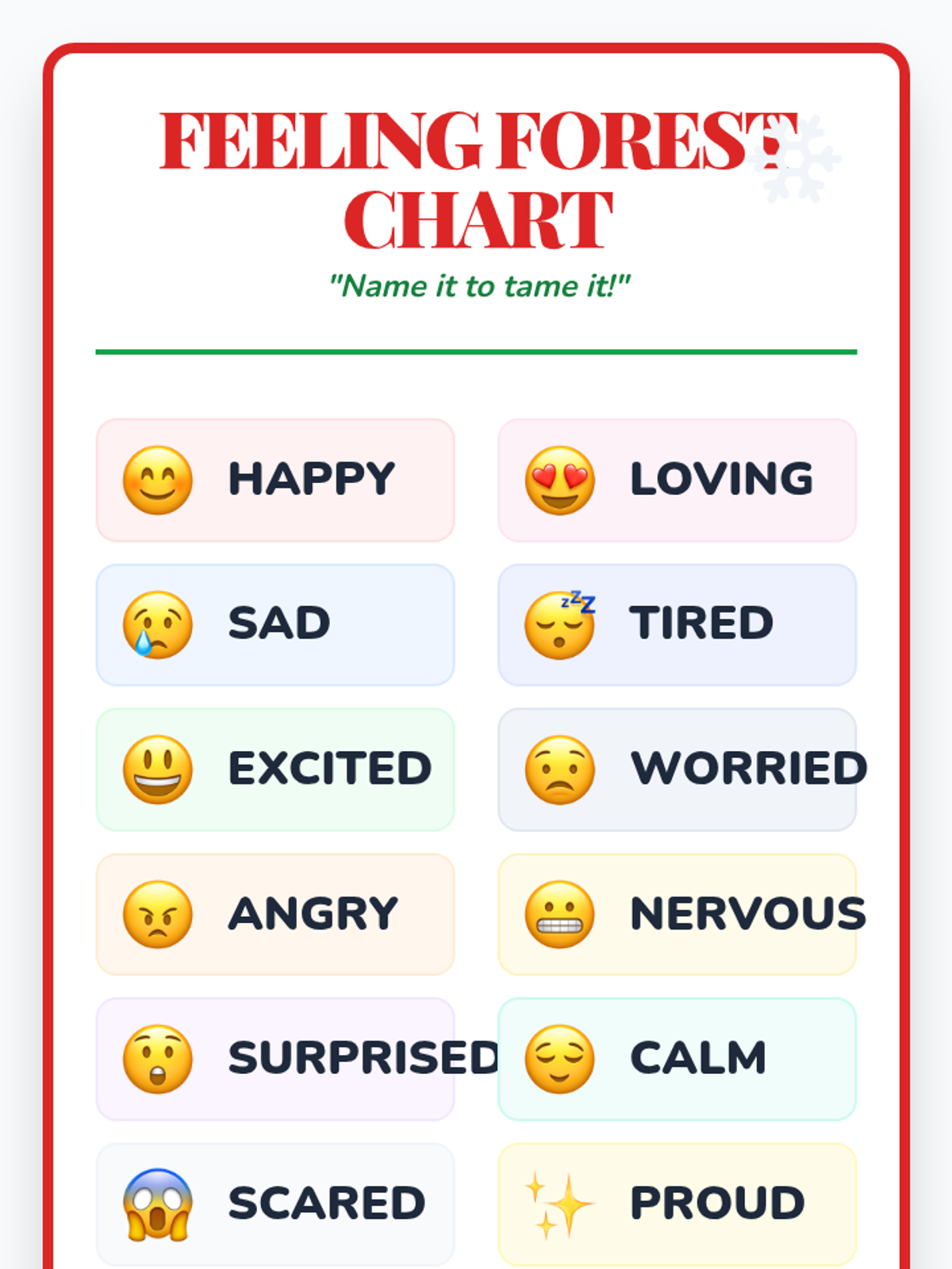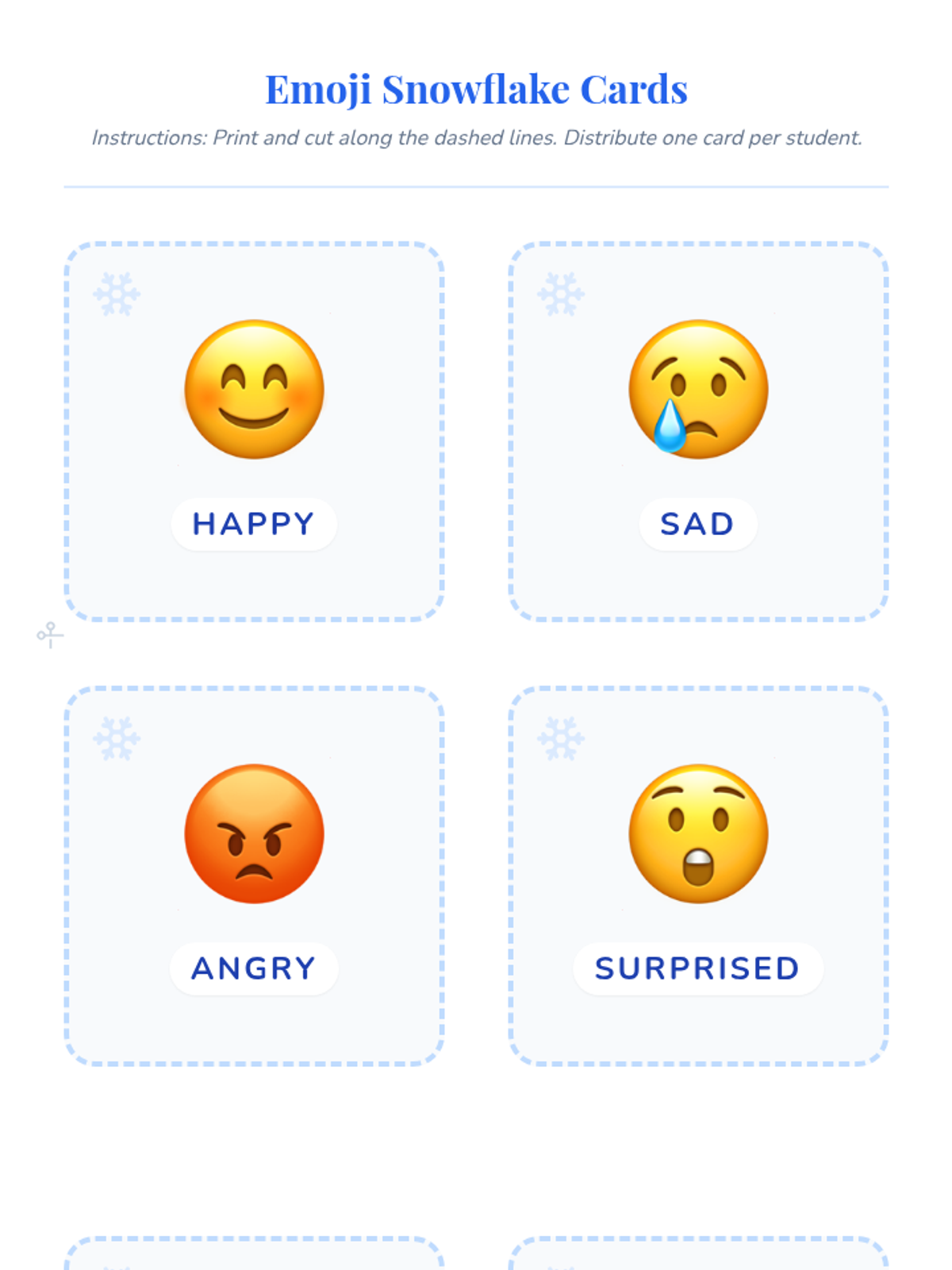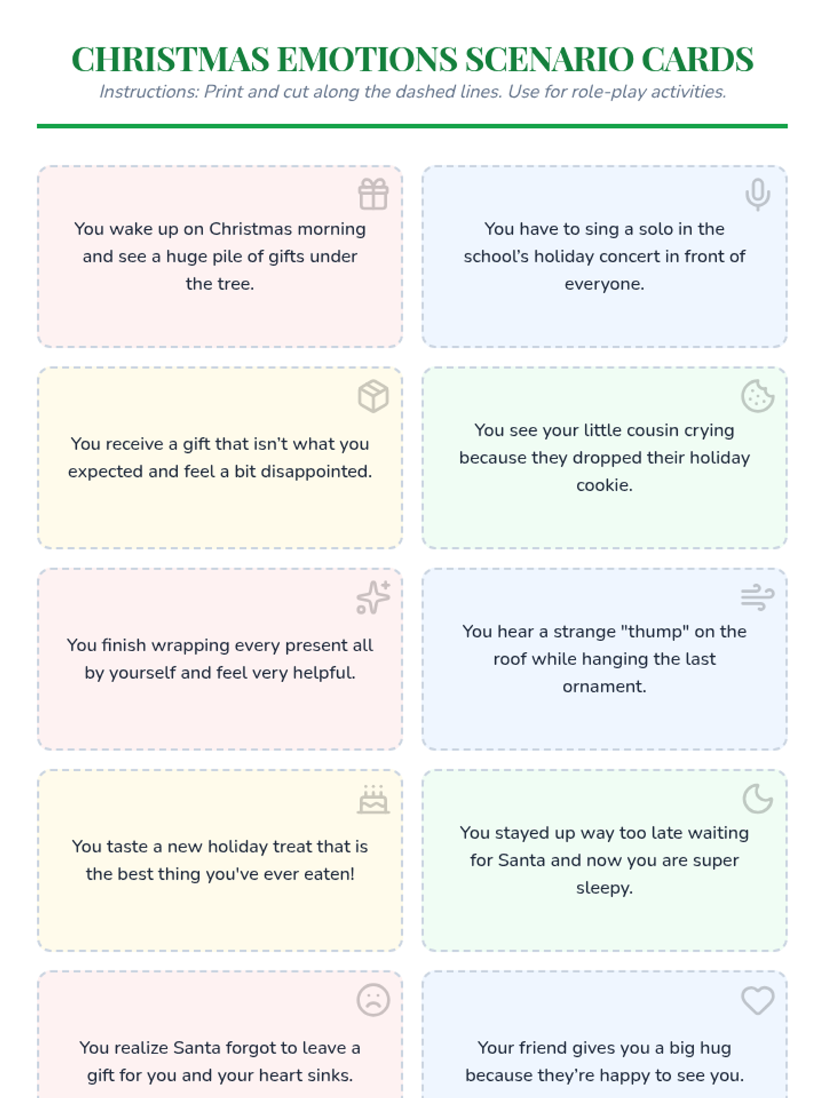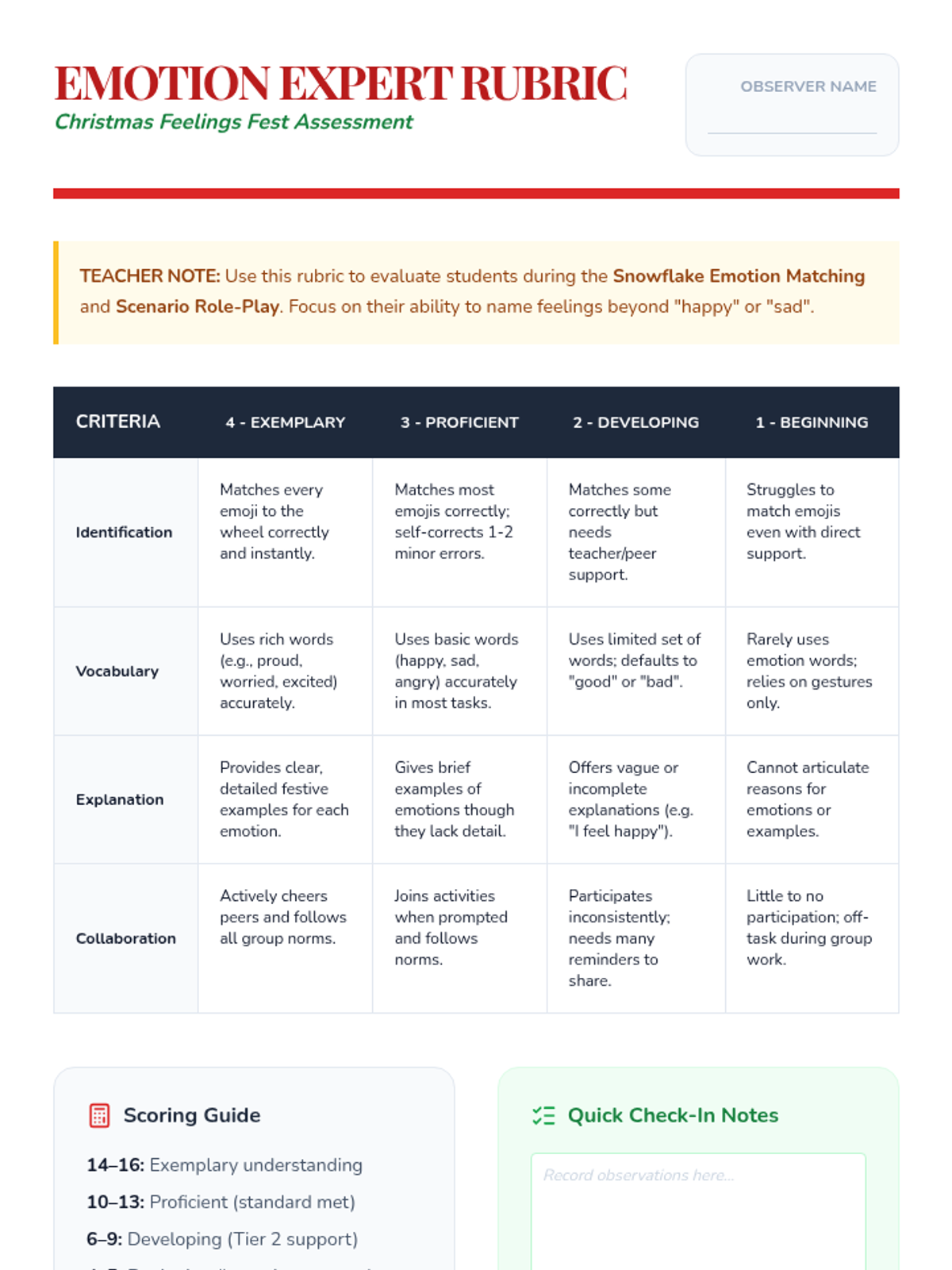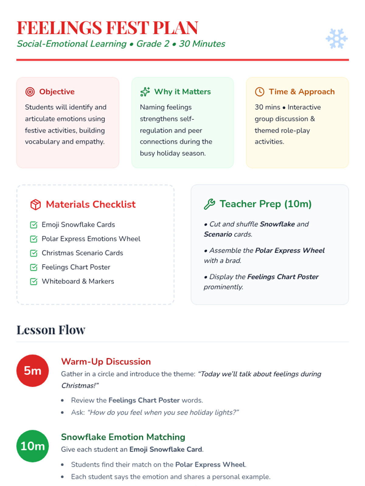 A festive, 30-minute social-emotional learning lesson for 2nd graders to identify and discuss emotions using Christmas themes. Students use snowflake emojis, an emotion wheel, and role-play to build emotional vocabulary.