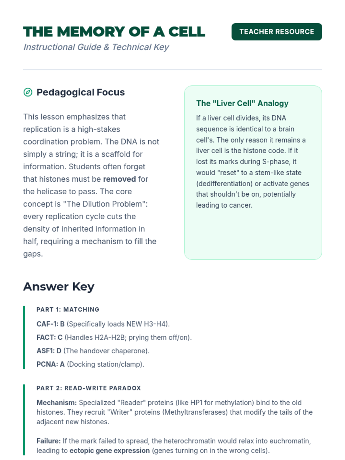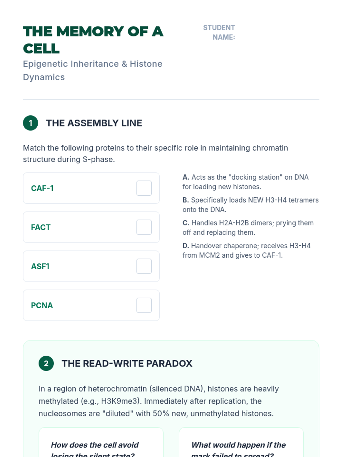 This lesson explores how nucleosomes are disassembled ahead of the replication fork and reassembled behind it. Students discuss how histone modifications (epigenetic marks) are preserved during division, ensuring cellular identity is inherited.